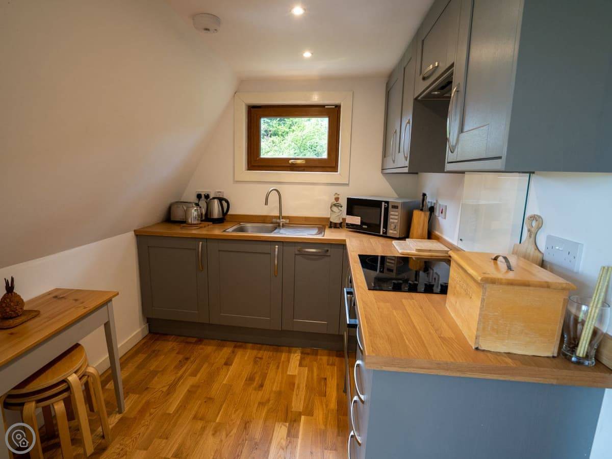 It's all on one level. The main living area is open plan, with a kitchen at one end, and big windows looking out into the trees. The floor is heated in there so it's usually cosy. There's a decent sized deck outside those doors, with a table and chairs. You'll see birds and squirrels.