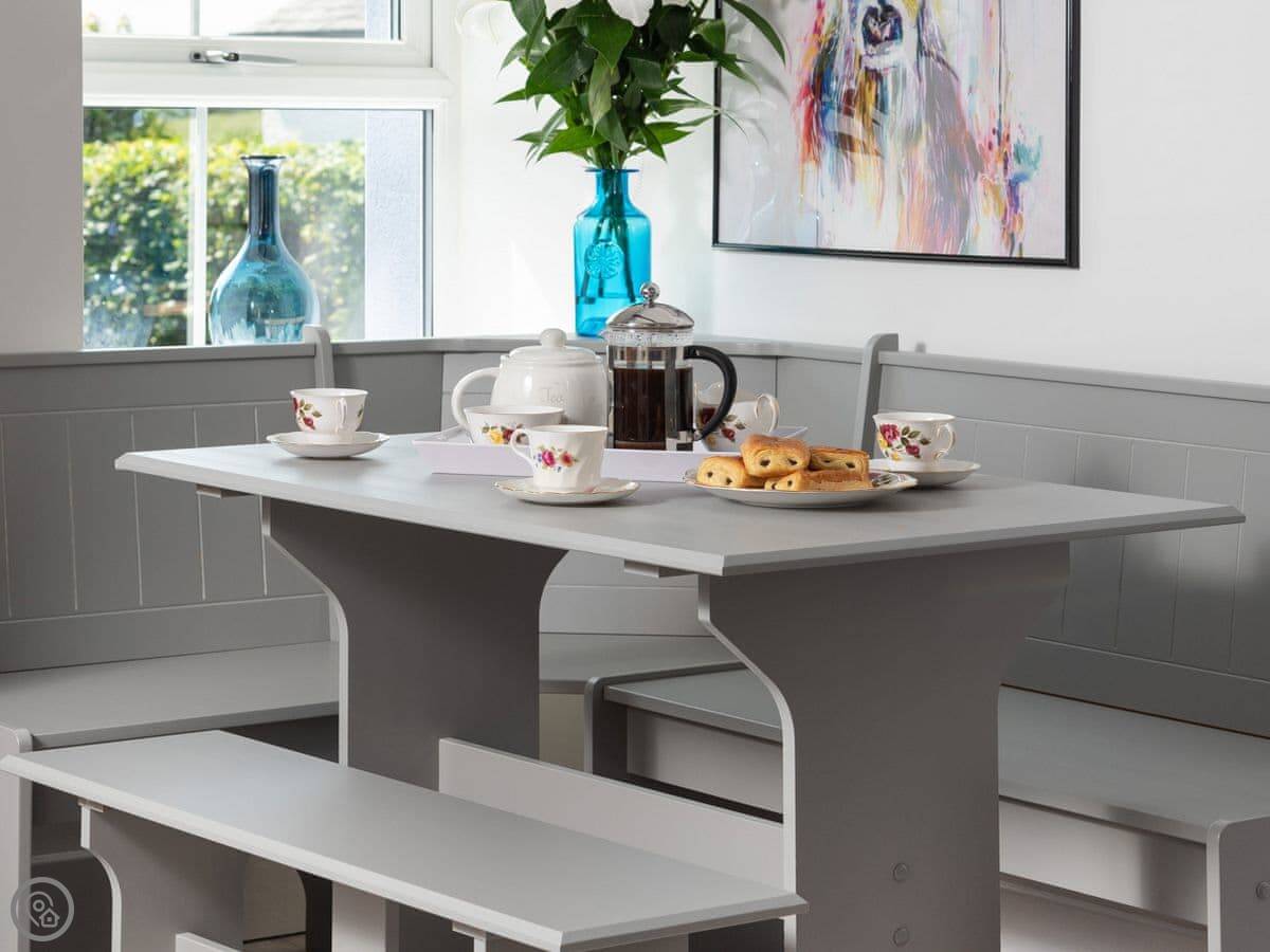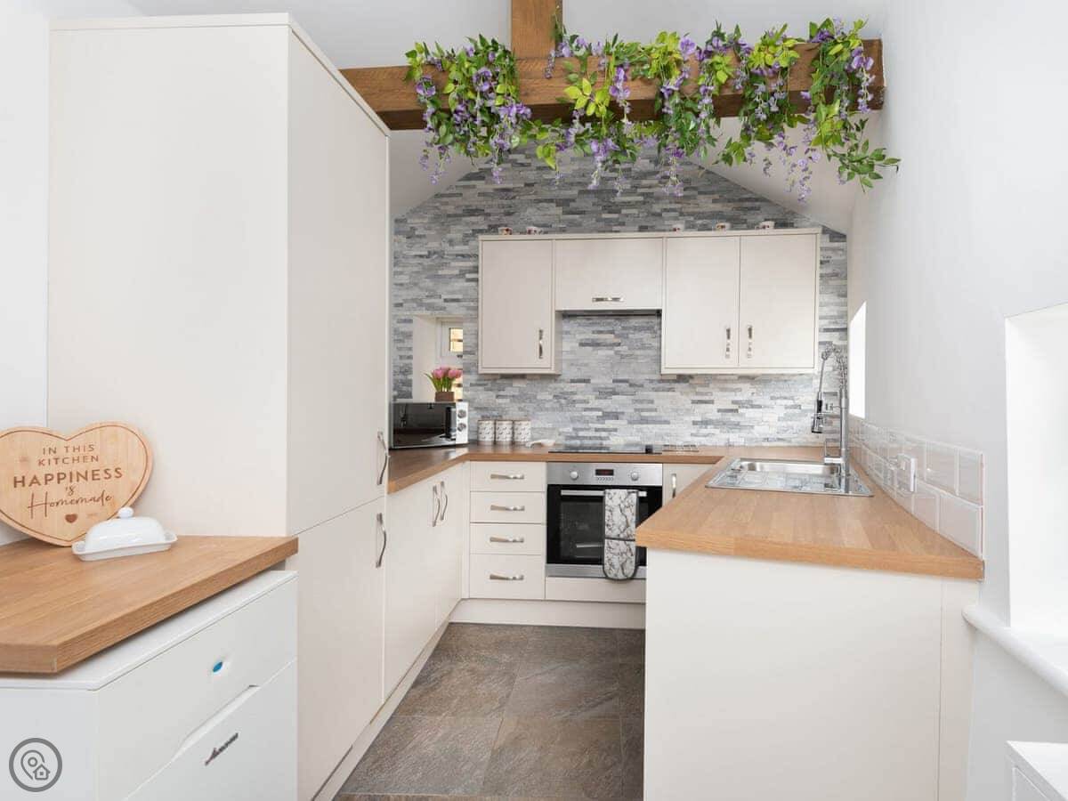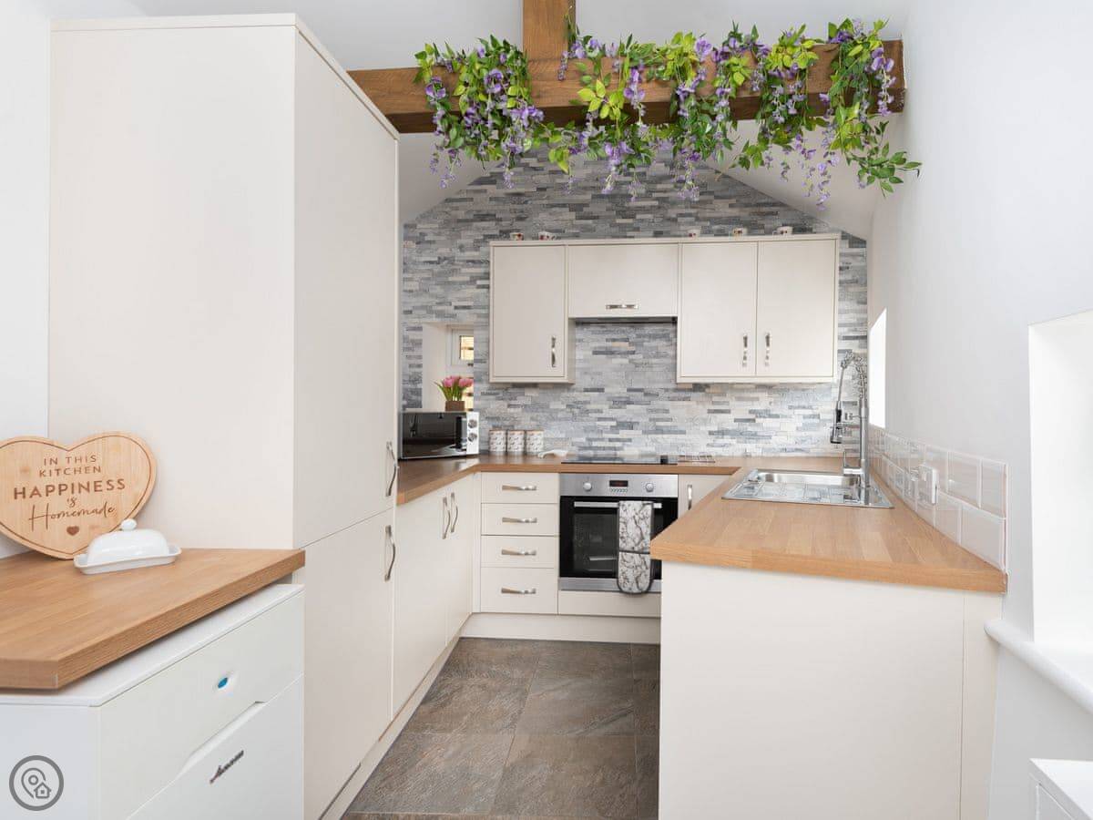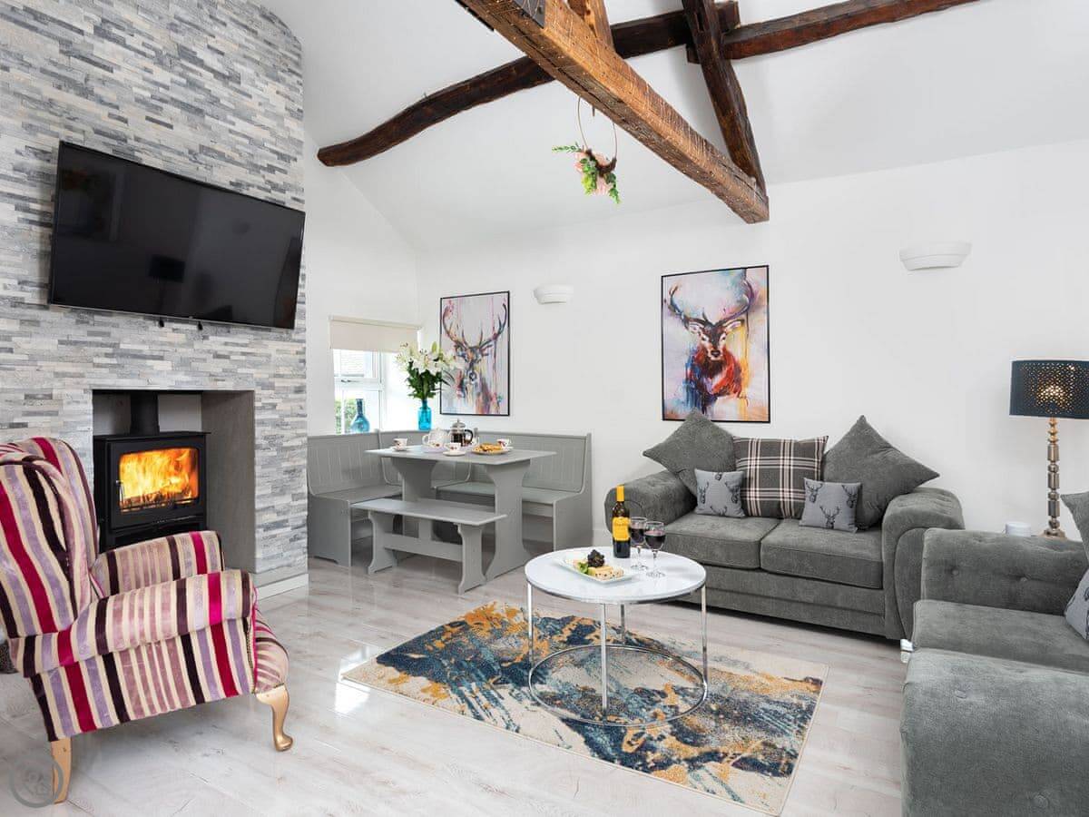It's got a 5 Star rating. That means it's finished to a high standard. The furniture is good quality, the beds are comfortable, and there's a wood burner in the living room. The owners leave you a welcome pack with some basics when you arrive. Dressing gowns and slippers are provided too.