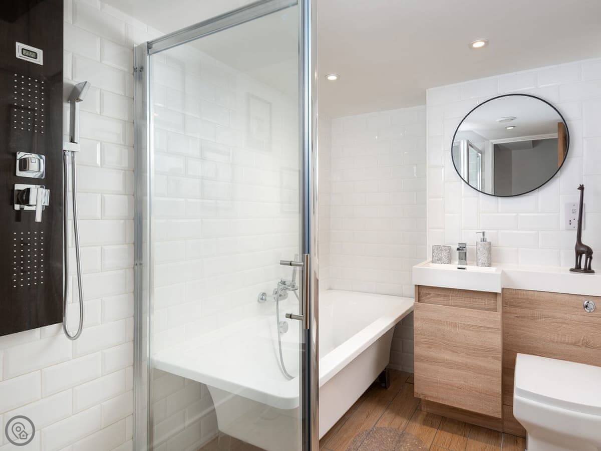 The bathroom has a good shower. There's a washing machine and a dishwasher.