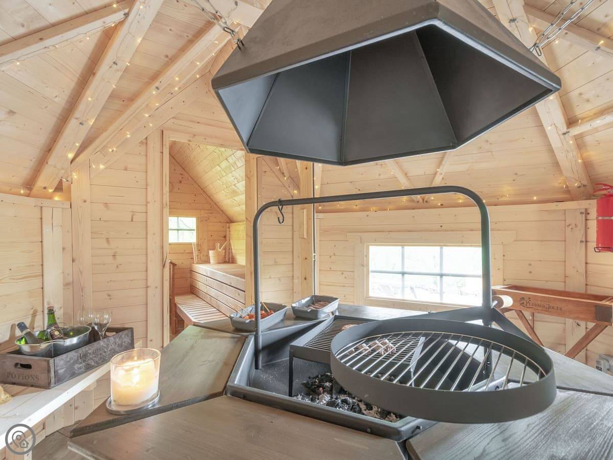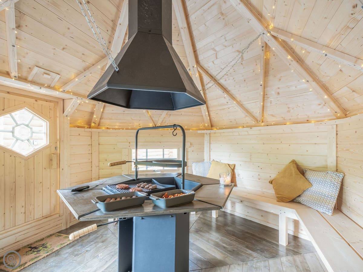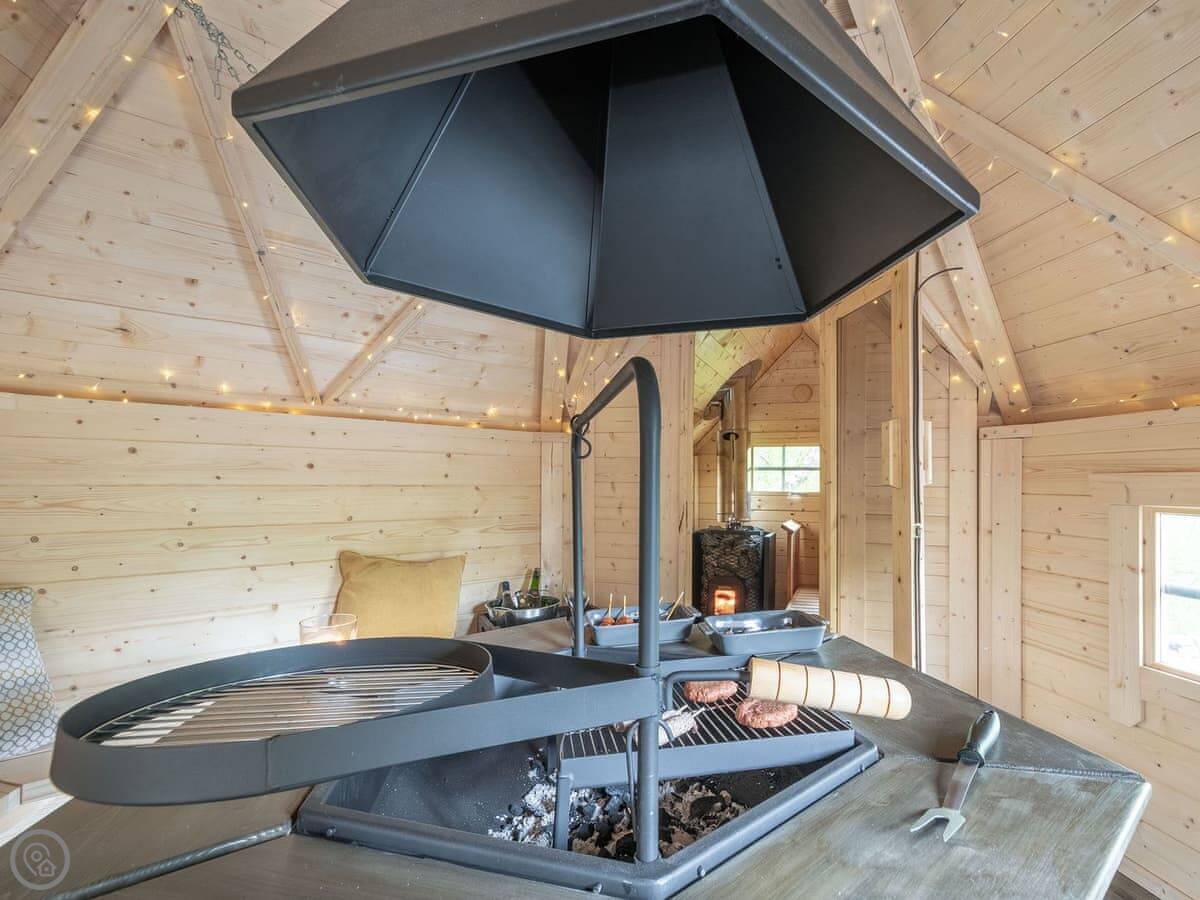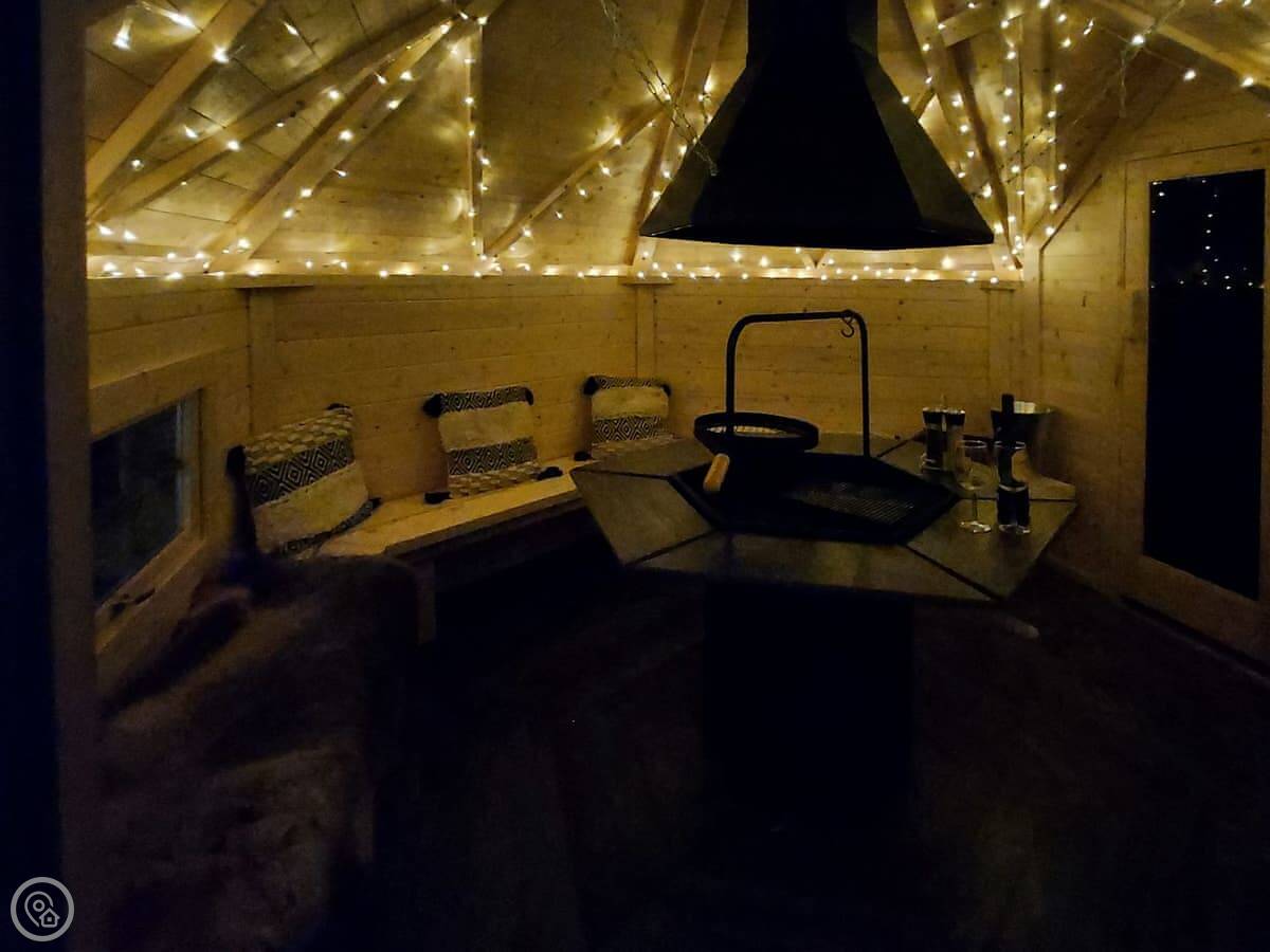 The living space is all open plan. Kitchen, dining table, sofas. There are big sliding doors that look straight out into the forest. You get a wood burner for cooler evenings. Outside, there's a deck with seating, a BBQ hut, and a hot tub. The cabin is up on a bit of a slope, so the views are through the trees.