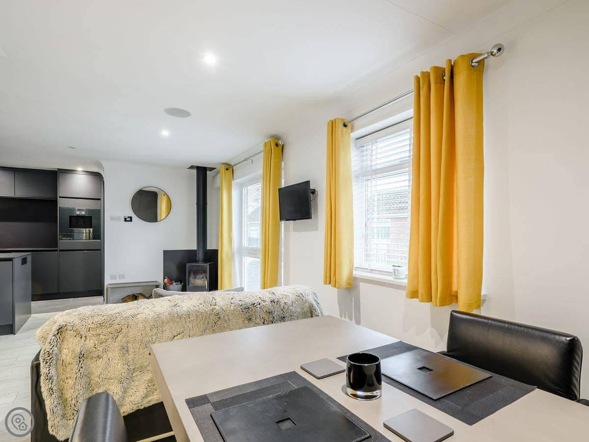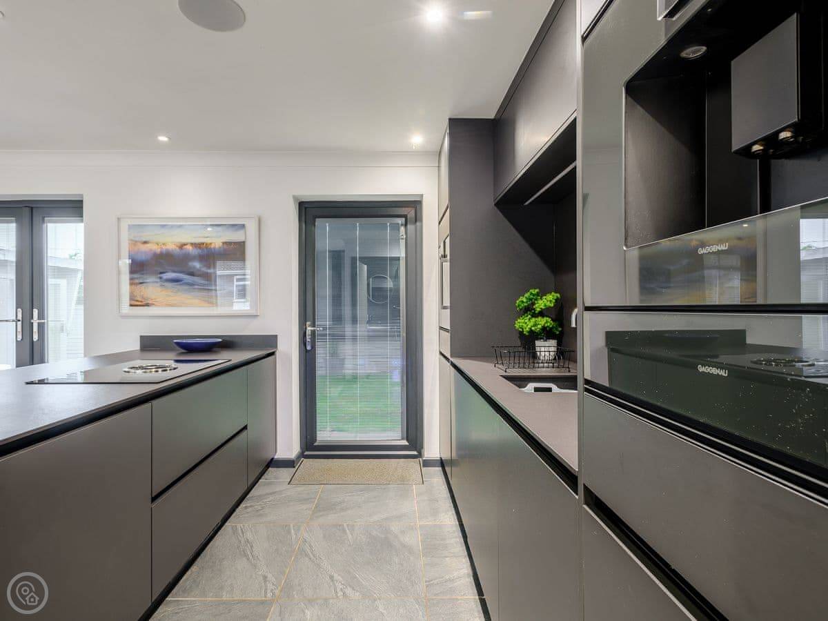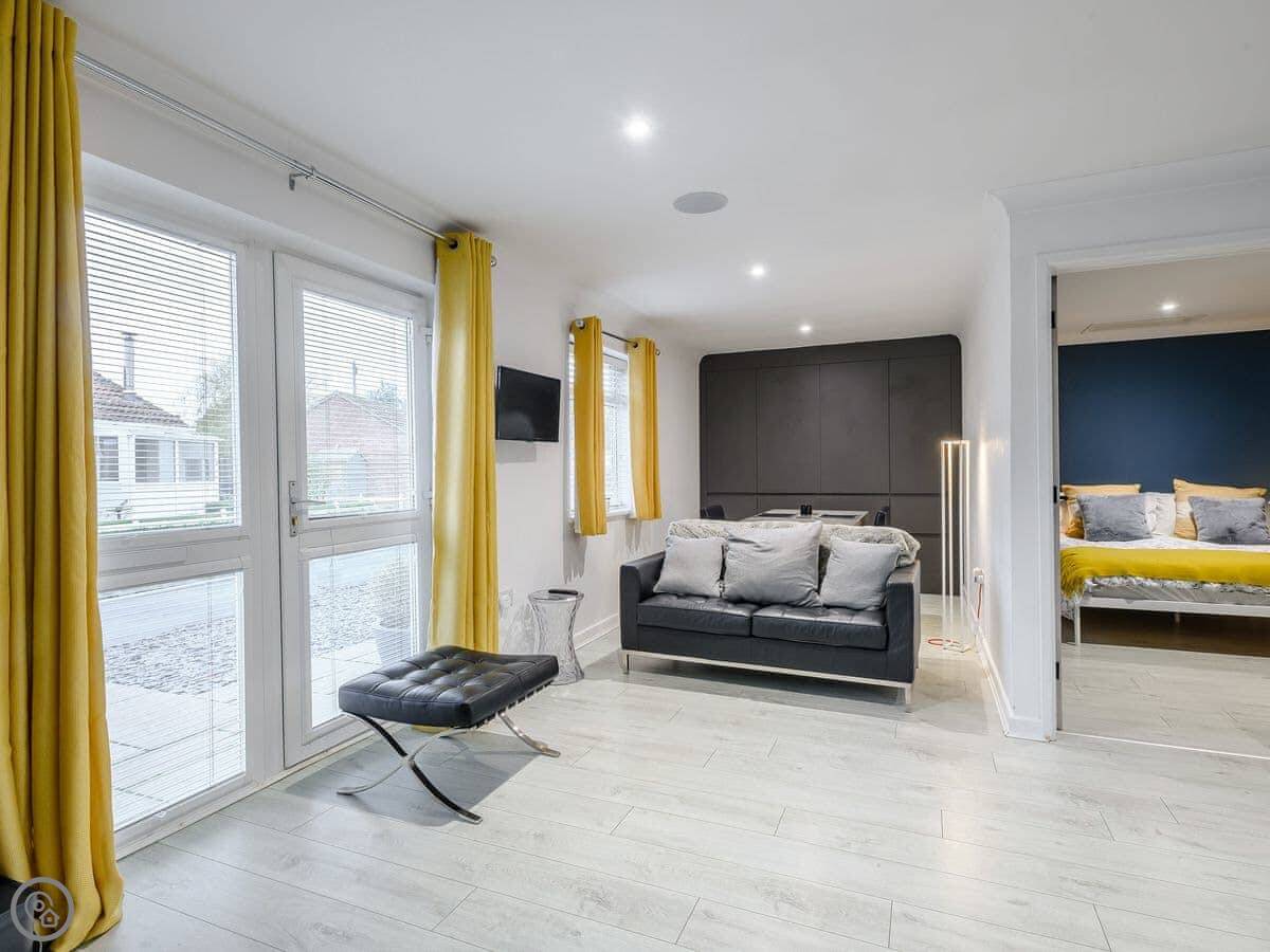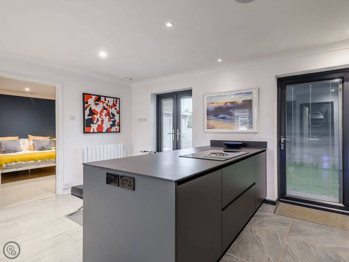It sleeps two, one bedroom with a kingsize bed. It's a 5 Star property, which means it's been finished to a high standard. There's a wood burner in the main room and the kitchen is open plan with an island. It has some high-end appliances, like a Gaggenau oven and a proper coffee machine.