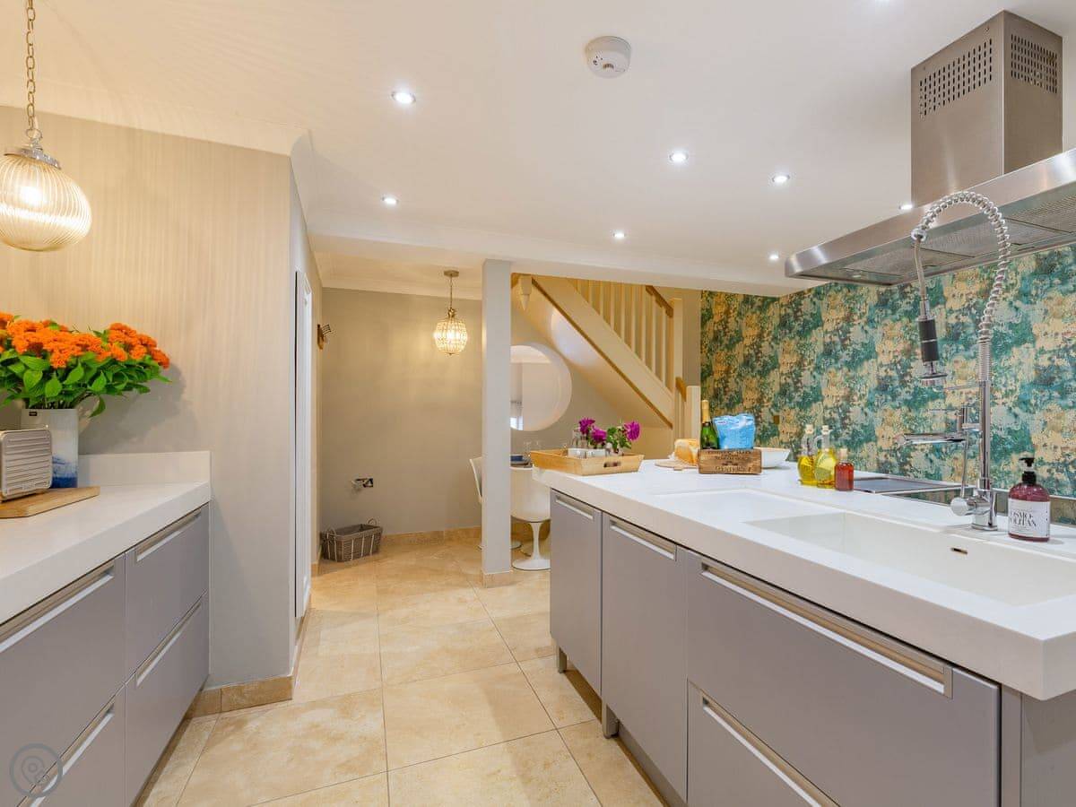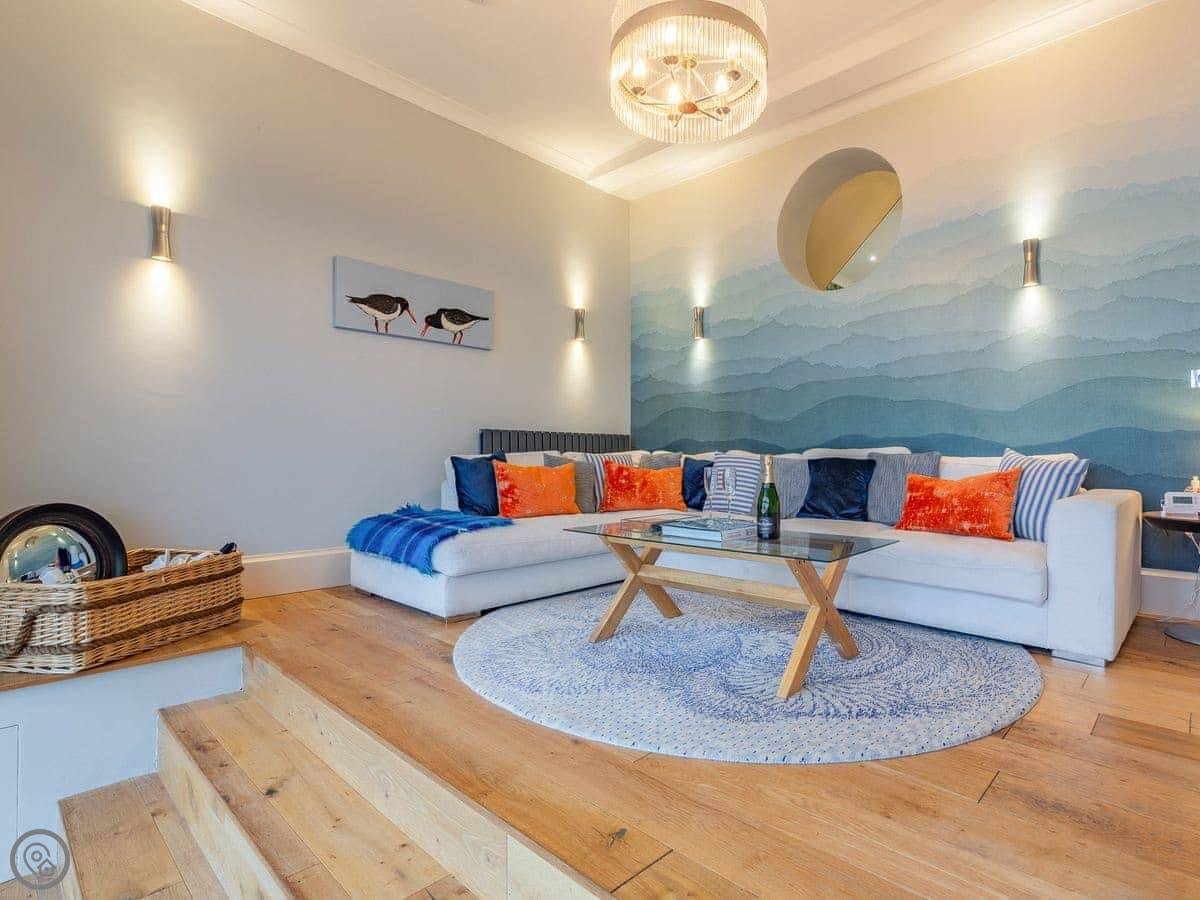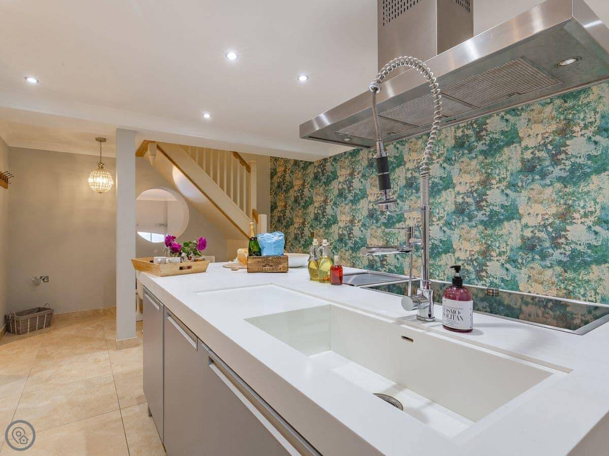 The kitchen and living room look straight out to the sea through big glass windows. You can even see the water from the kitchen sink through a porthole window. It's a clever layout.