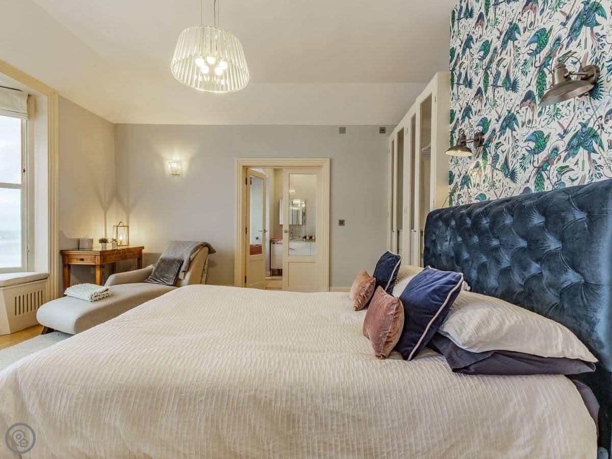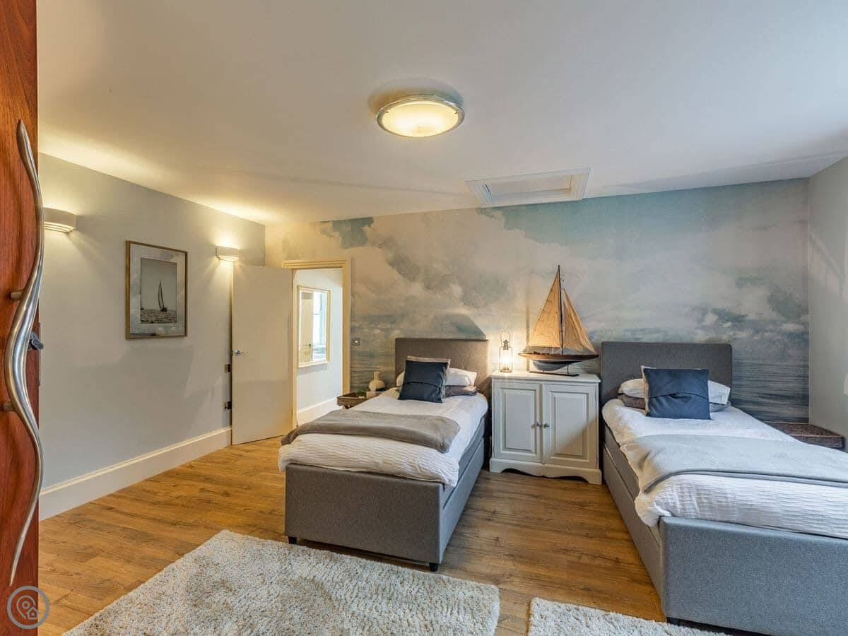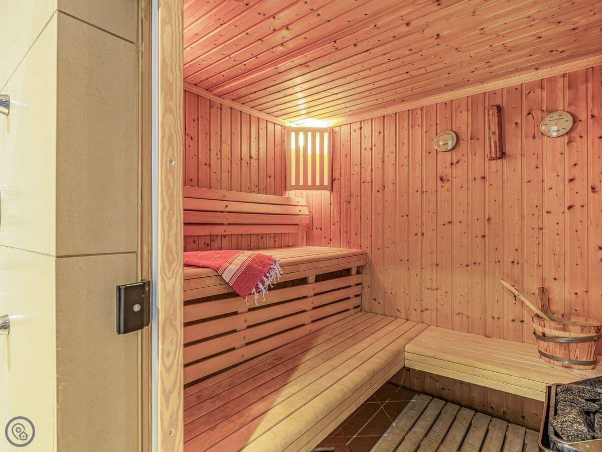 It sleeps six, but that's across two bedrooms. Both have their own bathrooms. One is a big room at the front with the sea view, and it's got a Japanese soaking tub and a shower. There's a little chaise lounge by the window. The other bedroom is at the back and has four beds, so it works for a family. It's got an en-suite wet room and, this is the unusual bit, its own sauna. I don't know why, but it's there if you want it.