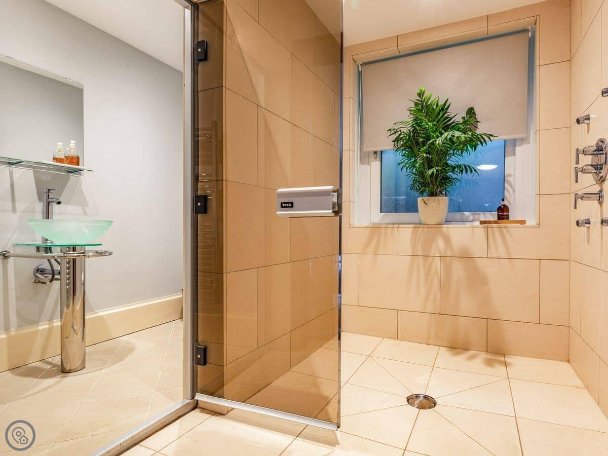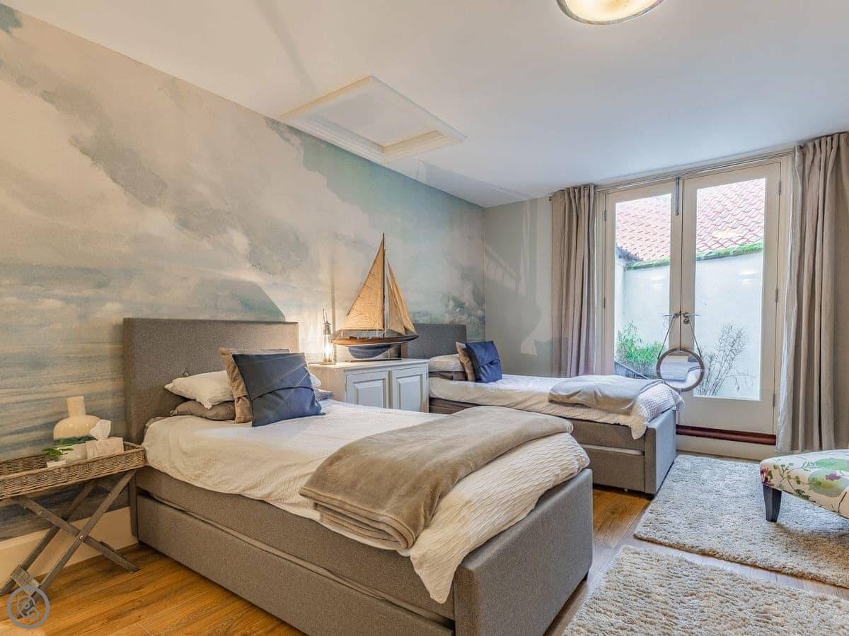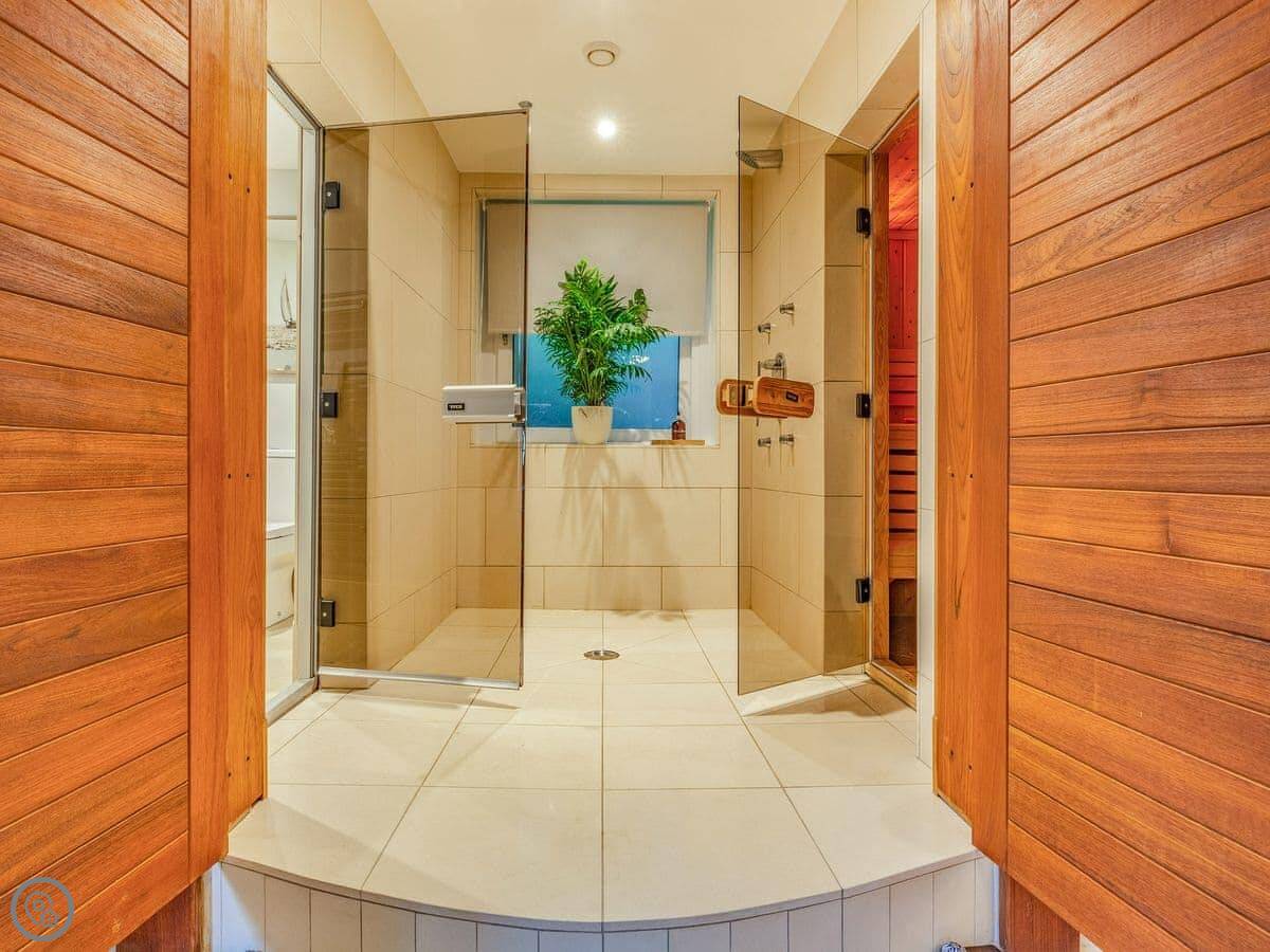 It sleeps six, but that's across two bedrooms. Both have their own bathrooms. One is a big room at the front with the sea view, and it's got a Japanese soaking tub and a shower. There's a little chaise lounge by the window. The other bedroom is at the back and has four beds, so it works for a family. It's got an en-suite wet room and, this is the unusual bit, its own sauna. I don't know why, but it's there if you want it.