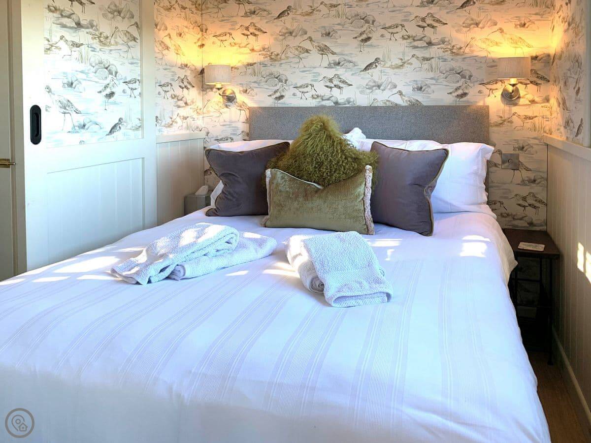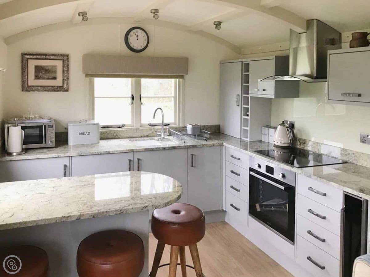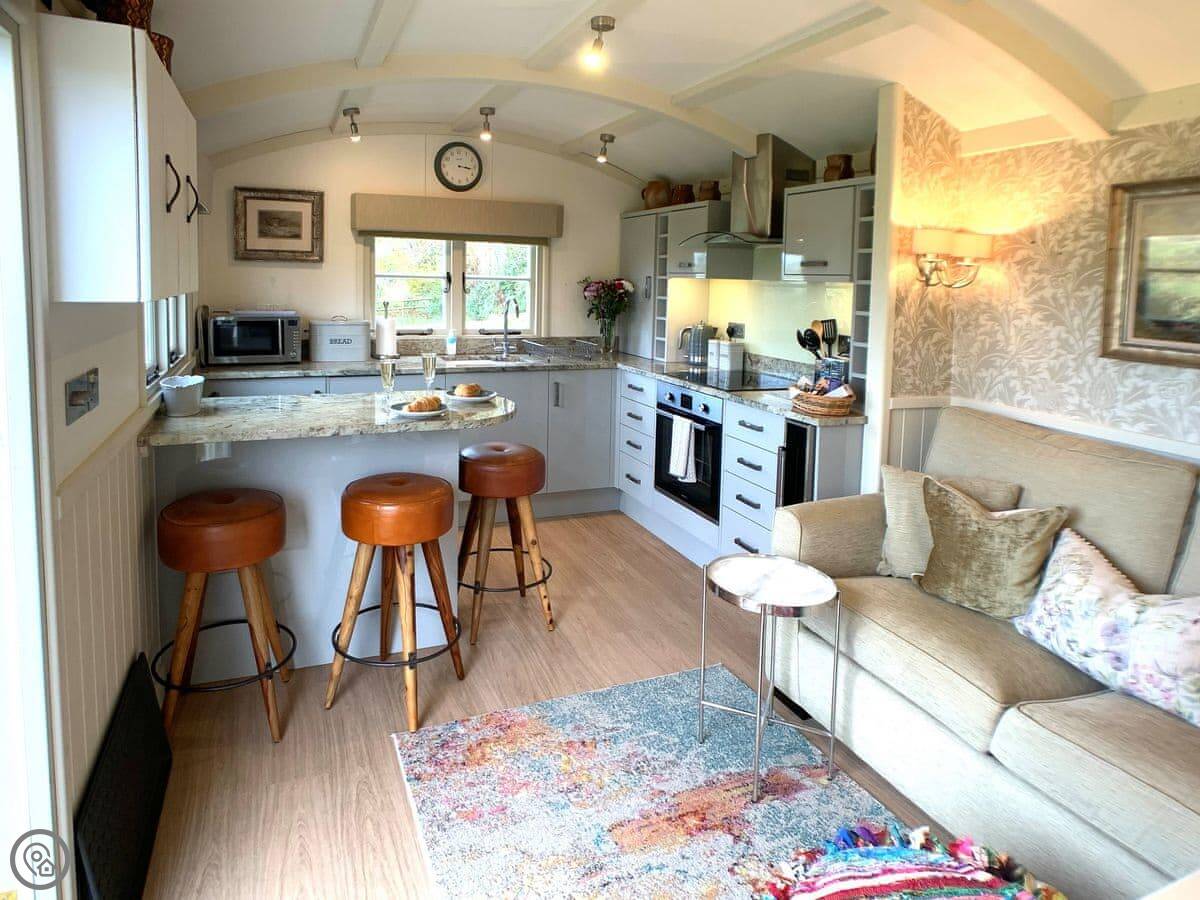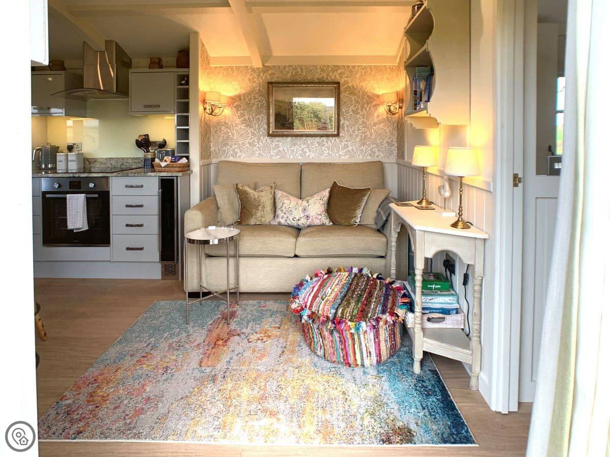 The cabin is part of Hurlditch Court, which has a few other places on the same land. So you get the quiet of 81 acres of fields and woods, but you might see other guests around sometimes. It’s open plan inside.