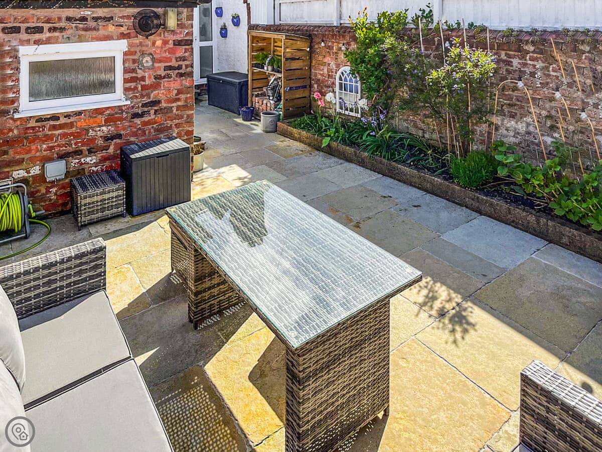 Downstairs there's a living room with a wood burner. The kitchen and dining area are open plan. Through the back there's a separate utility room with space for bikes and golf clubs, and a toilet. Outside is a small walled patio garden with a sofa.