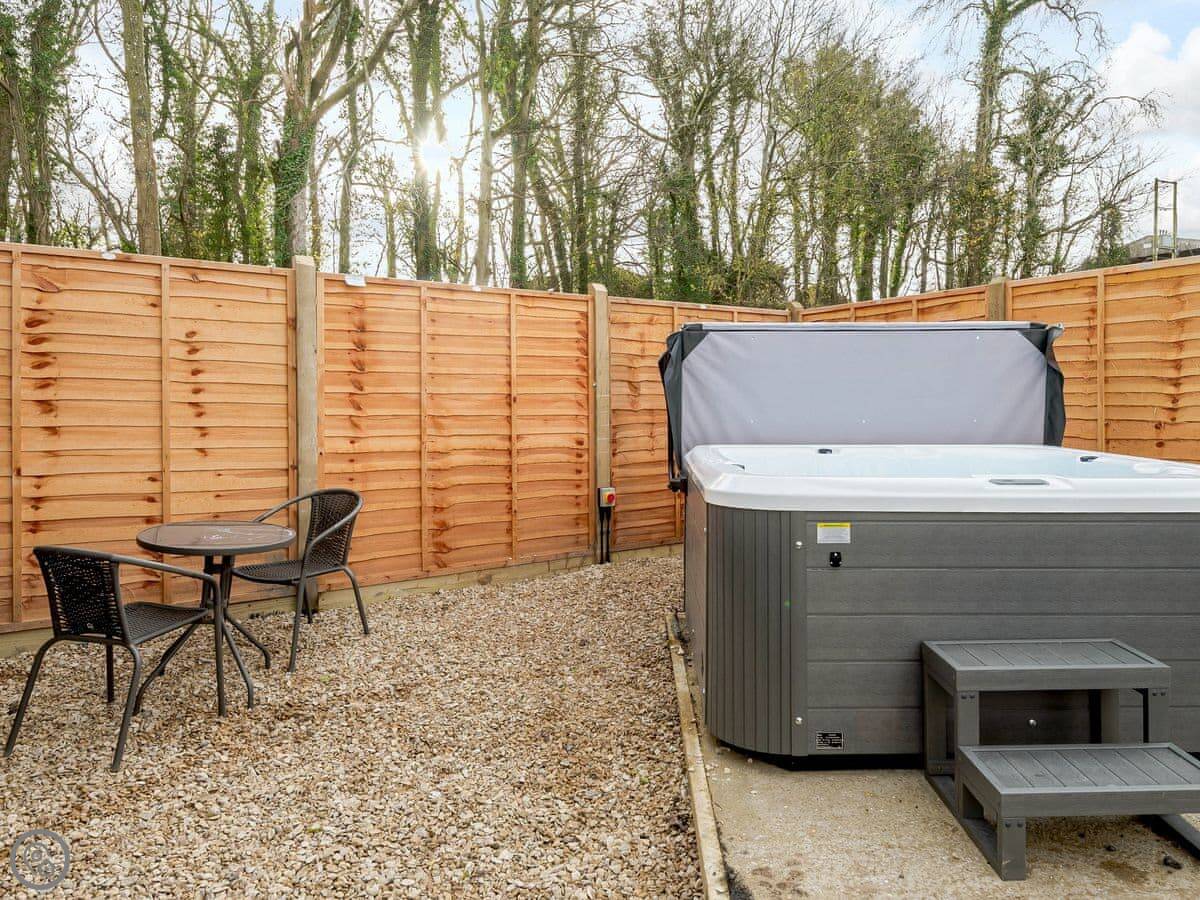 The private hot tub is on the deck. You can sit in it and look at the stars or the woods. It's just there, no extra fuss.