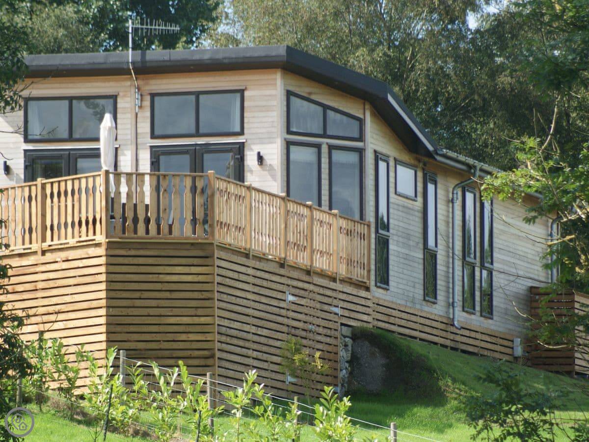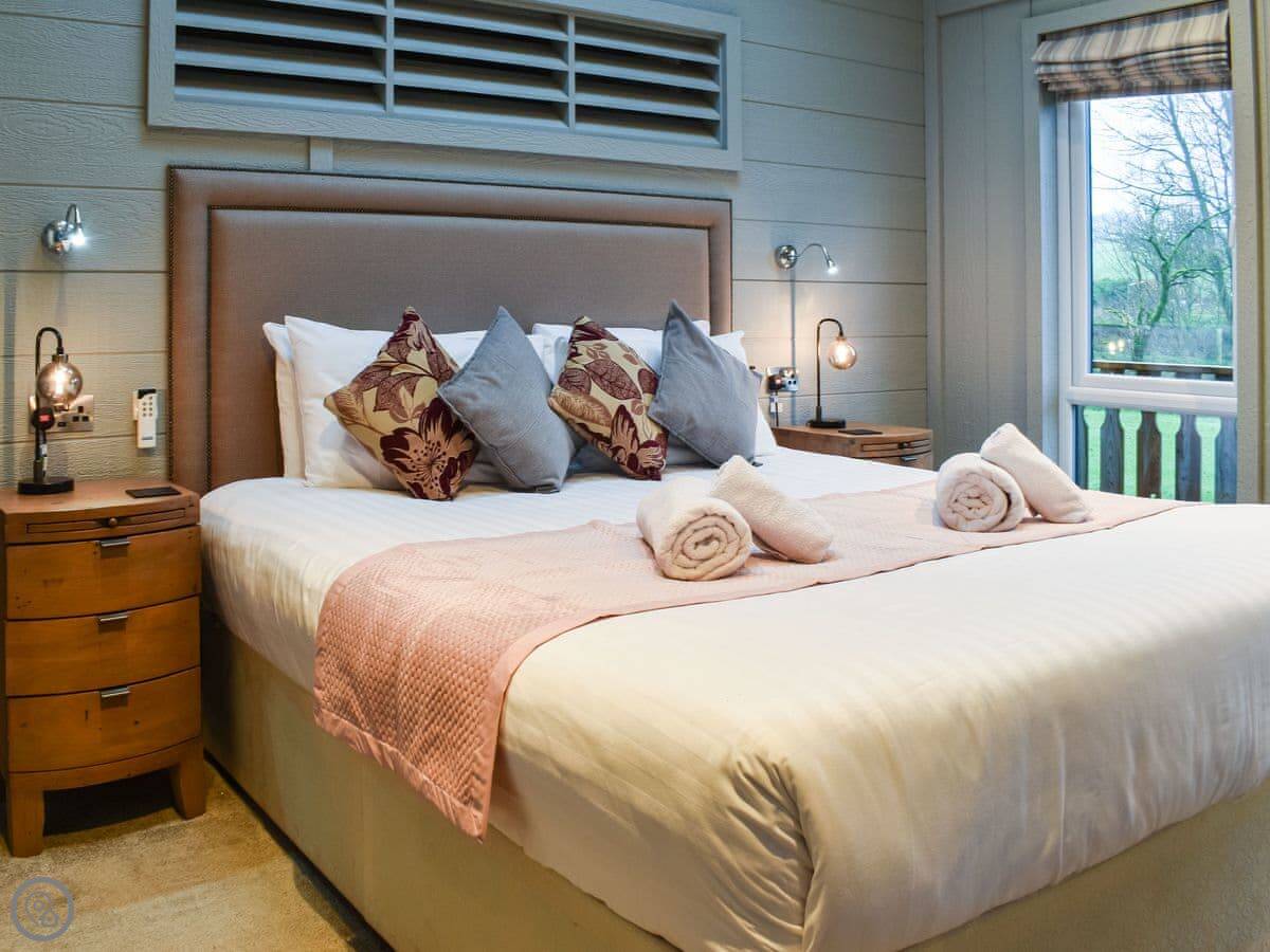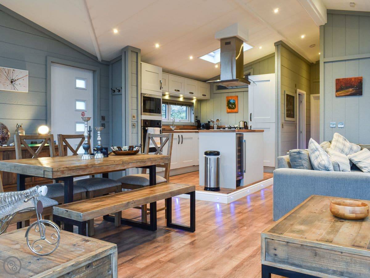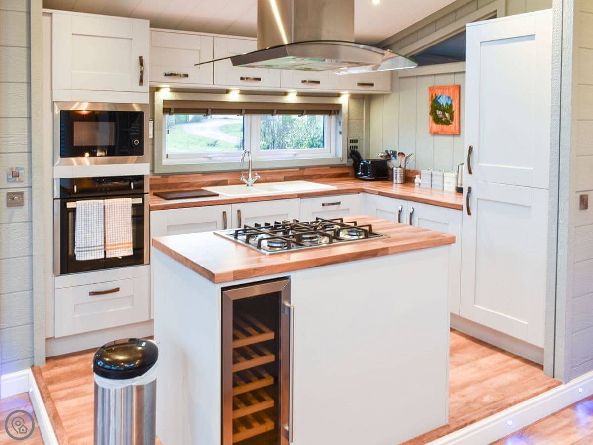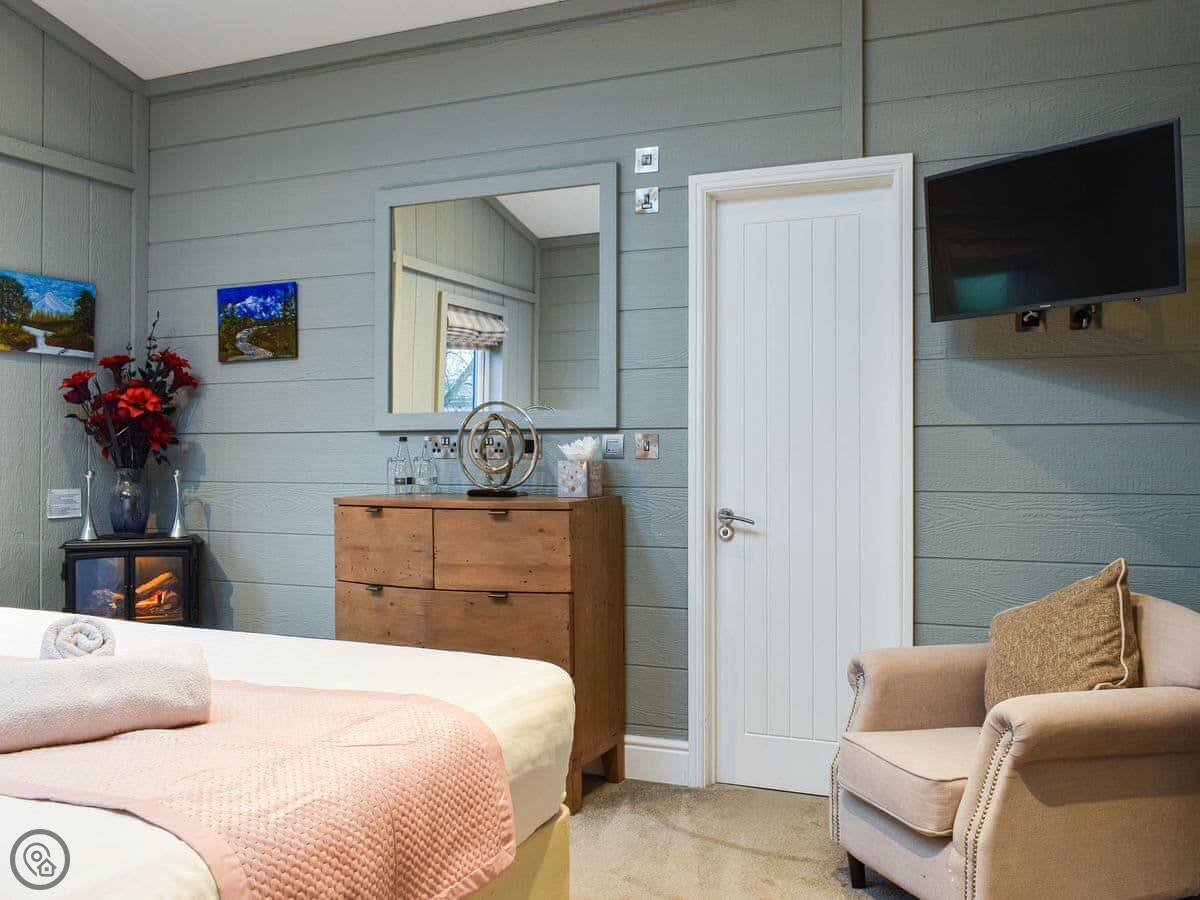 The moment you step into this detached lodge you are welcomed by a sumptuous, modern environment. The open plan space is light and airy, with plenty of room to relax and entertain in. The living area has deep, comfy sofas in which to settle in front of the large Smart TV, or maybe challenge someone to a game on the Xbox. The dining area boasts a large table and comfy chairs and is ideally placed to watch the chef do his work. The kitchen has every appliance you could ask for with a 5-burner hob and even a wine chiller to ensure that your evening tipple is served at the perfect temperature. The first bedroom is spacious with quality fixtures and fittings around the double bed; across the way is the family bathroom with a deep roll-top bath, so you can soak away the aches of a good day’s walking. The master bedroom has a kingsize bed at its centre, and again the quality of the fixtures shine out, including the realistic effect fire in the corner. It has a large en-suite with shower cubicle and even a walk-in wardrobe behind the bed. The final detail is a small room for your canine friend with external access.
