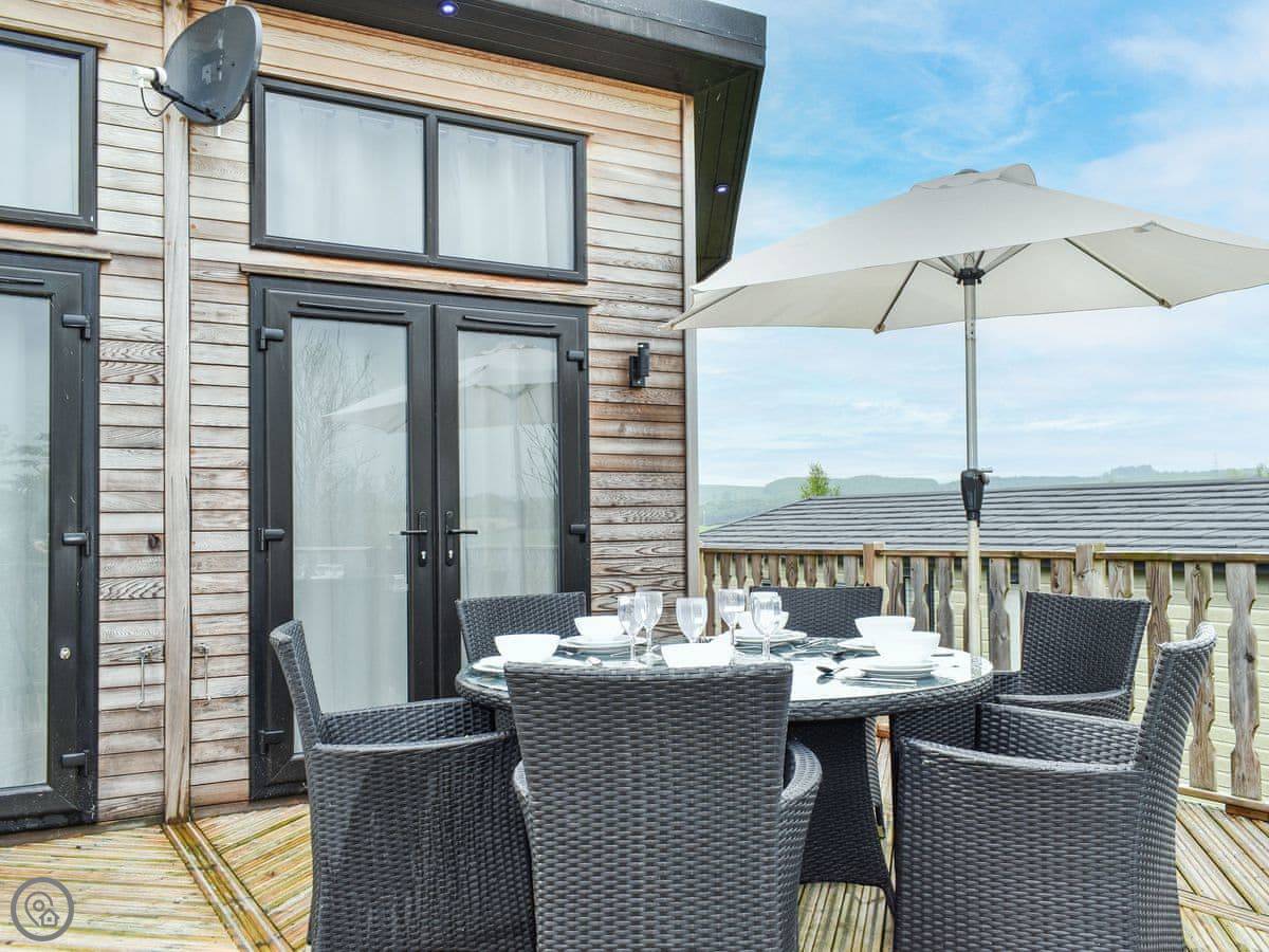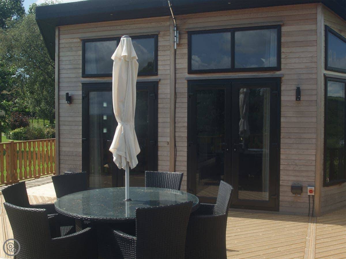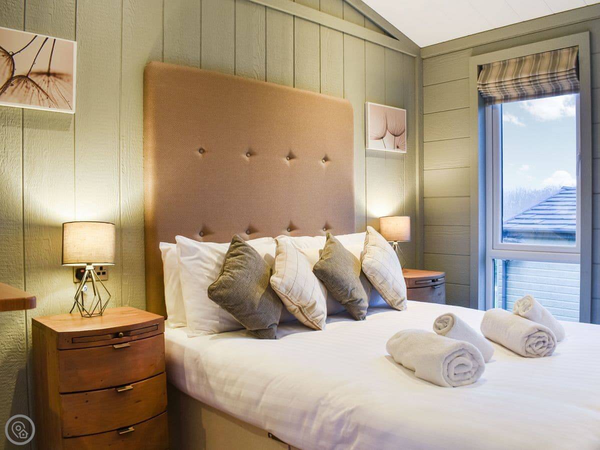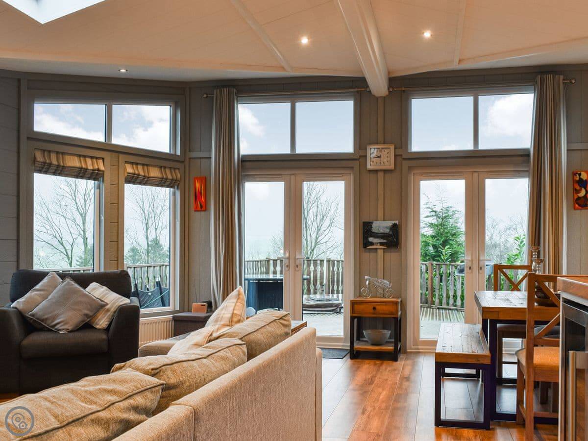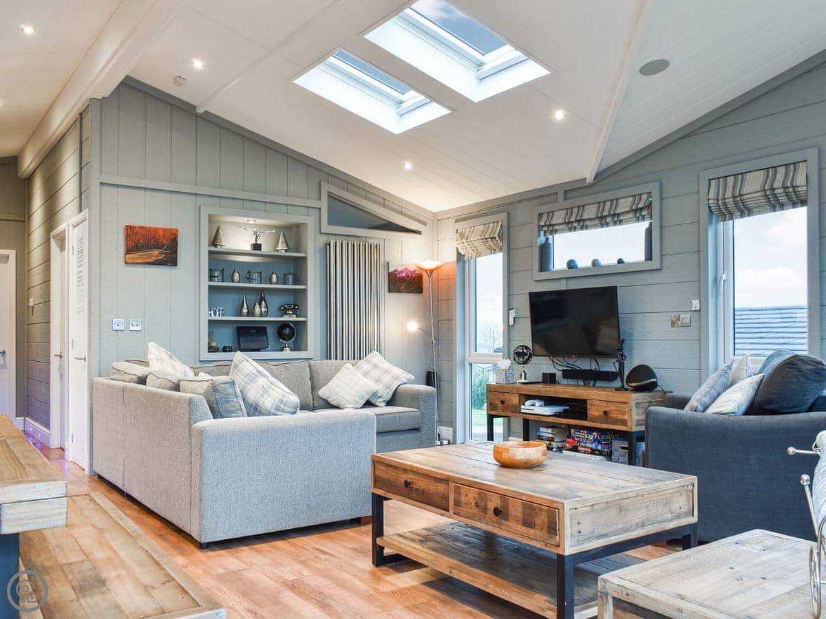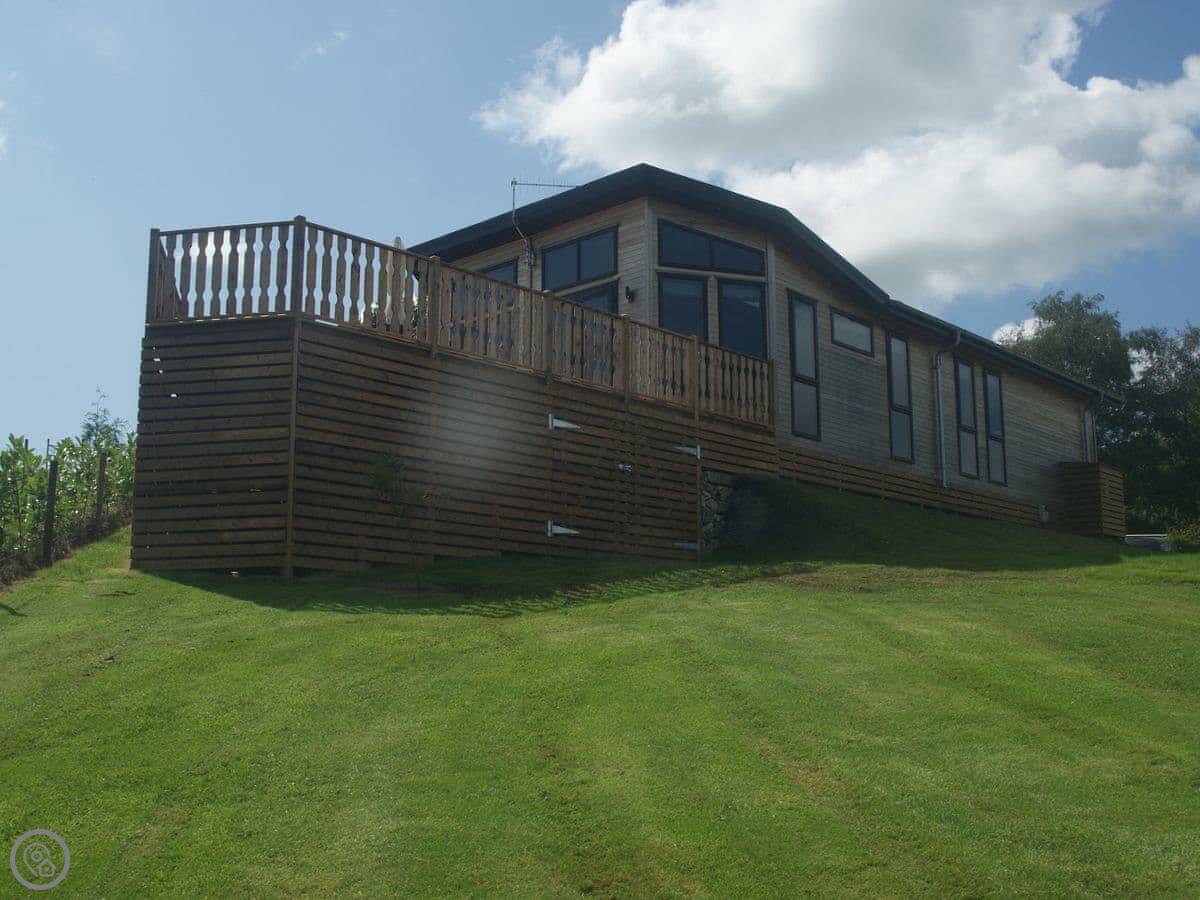 The moment you step into this detached lodge you are welcomed by a sumptuous, modern environment. The open plan space is light and airy, with plenty of room to relax and entertain in. The living area has deep, comfy sofas in which to settle in front of the large Smart TV, or maybe challenge someone to a game on the Xbox. The dining area boasts a large table and comfy chairs and is ideally placed to watch the chef do his work. The kitchen has every appliance you could ask for with a 5-burner hob and even a wine chiller to ensure that your evening tipple is served at the perfect temperature. The first bedroom is spacious with quality fixtures and fittings around the double bed; across the way is the family bathroom with a deep roll-top bath, so you can soak away the aches of a good day’s walking. The master bedroom has a kingsize bed at its centre, and again the quality of the fixtures shine out, including the realistic effect fire in the corner. It has a large en-suite with shower cubicle and even a walk-in wardrobe behind the bed. The final detail is a small room for your canine friend with external access.