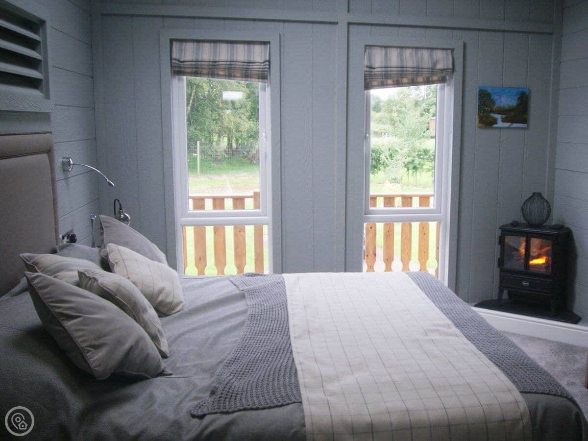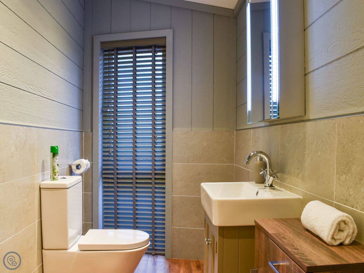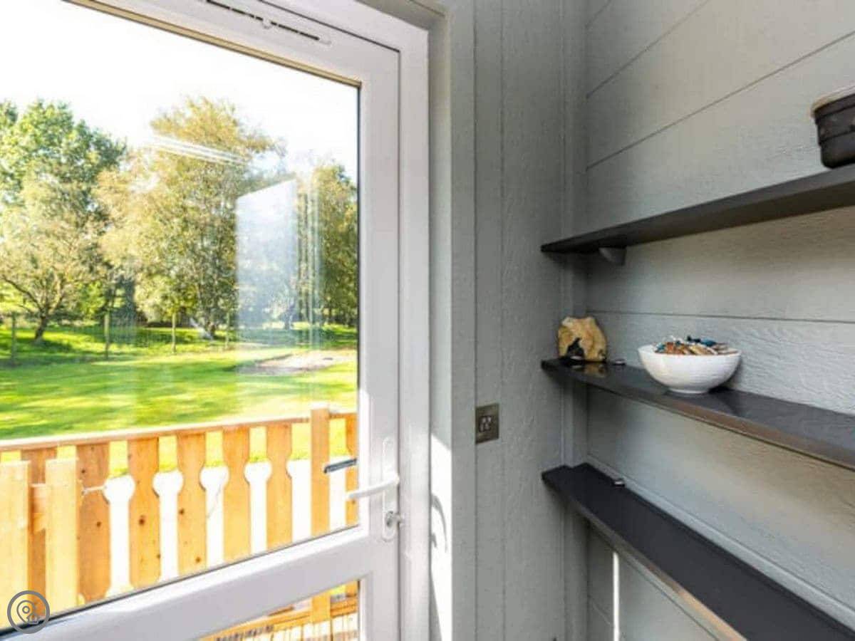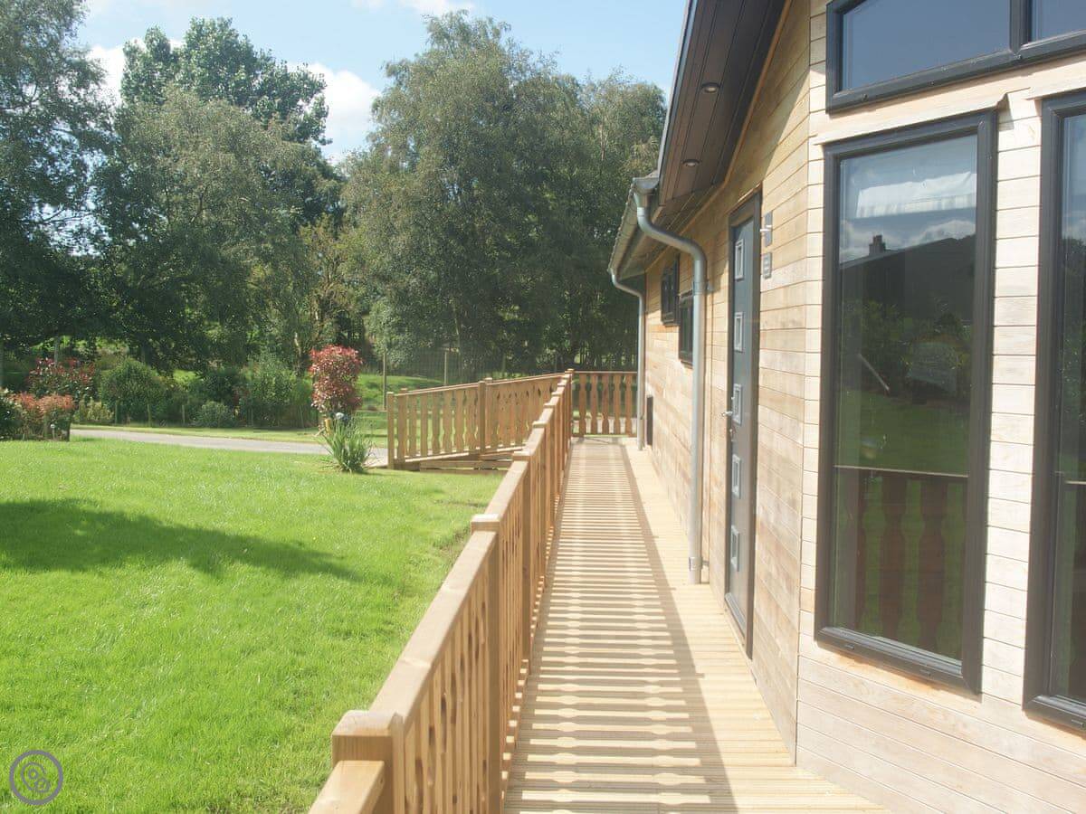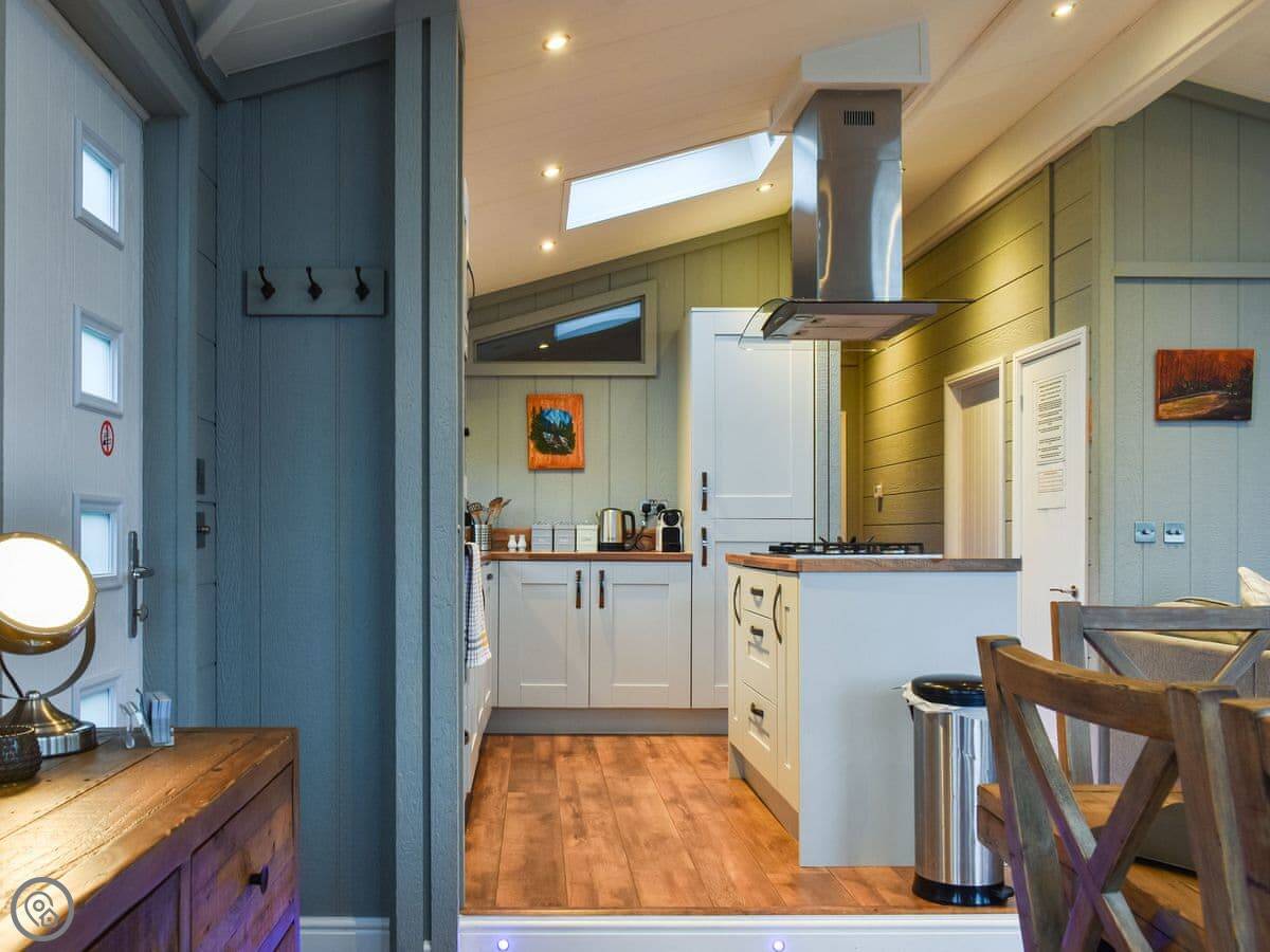 The moment you step into this detached lodge you are welcomed by a sumptuous, modern environment. The open plan space is light and airy, with plenty of room to relax and entertain in. The living area has deep, comfy sofas in which to settle in front of the large Smart TV, or maybe challenge someone to a game on the Xbox. The dining area boasts a large table and comfy chairs and is ideally placed to watch the chef do his work. The kitchen has every appliance you could ask for with a 5-burner hob and even a wine chiller to ensure that your evening tipple is served at the perfect temperature. The first bedroom is spacious with quality fixtures and fittings around the double bed; across the way is the family bathroom with a deep roll-top bath, so you can soak away the aches of a good day’s walking. The master bedroom has a kingsize bed at its centre, and again the quality of the fixtures shine out, including the realistic effect fire in the corner. It has a large en-suite with shower cubicle and even a walk-in wardrobe behind the bed. The final detail is a small room for your canine friend with external access.