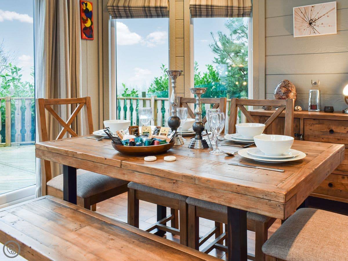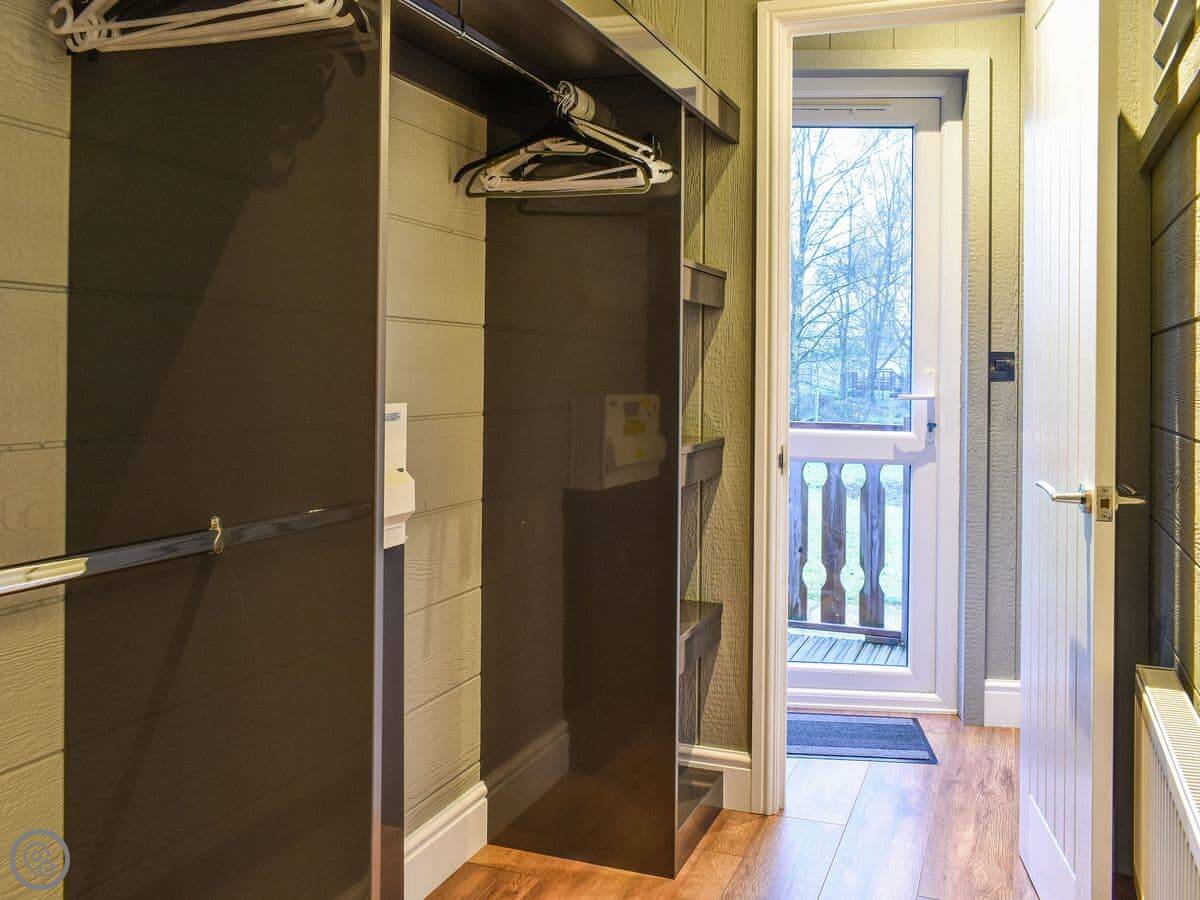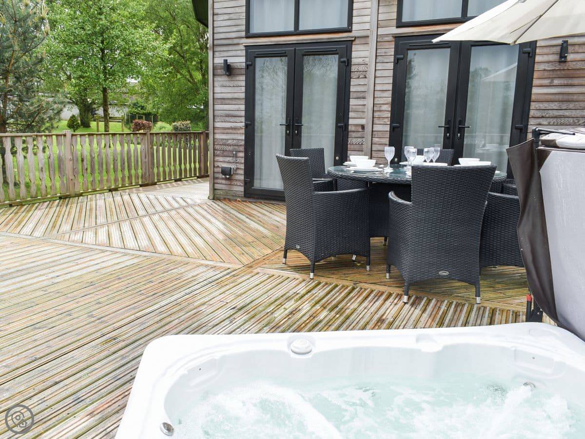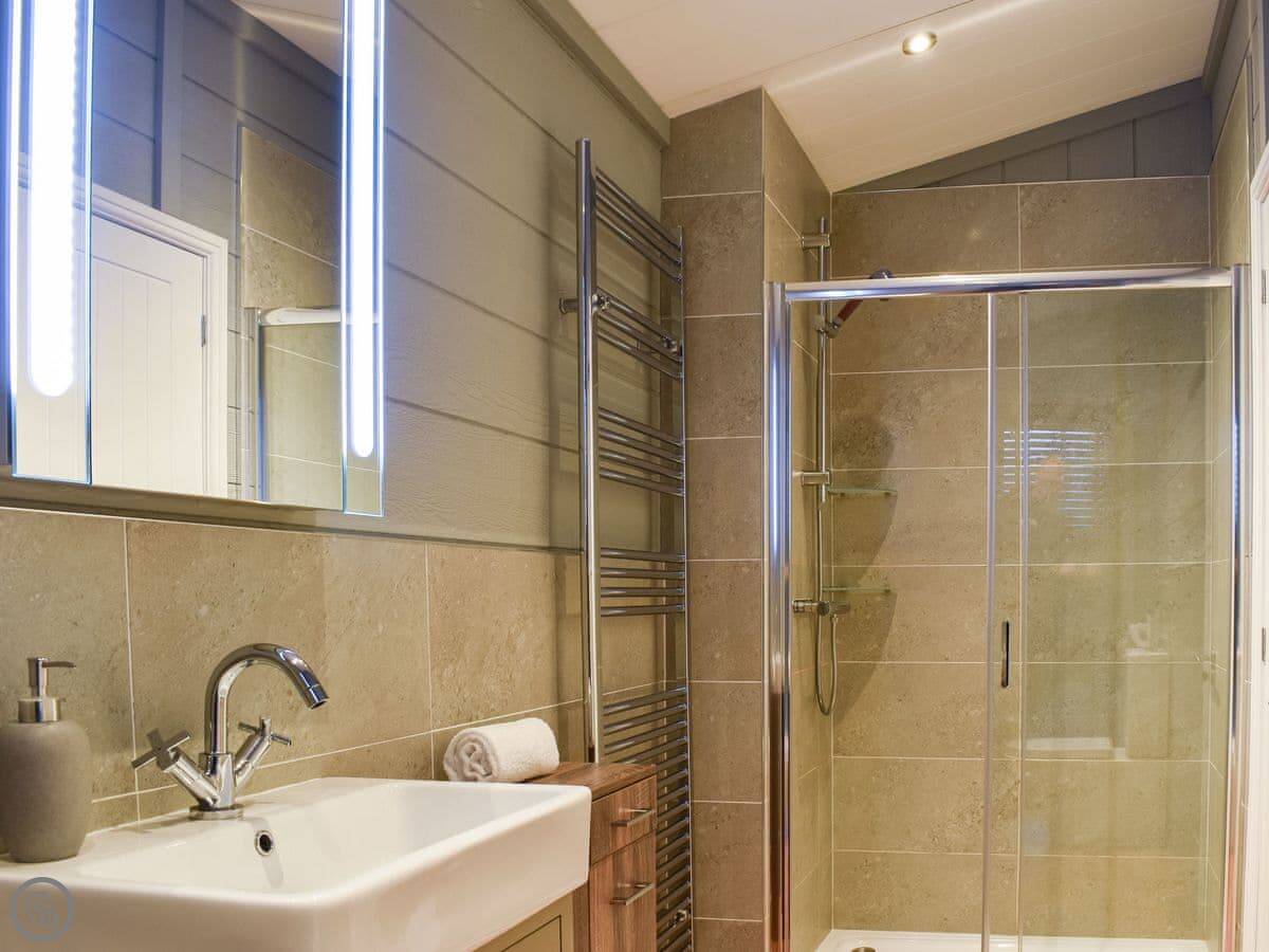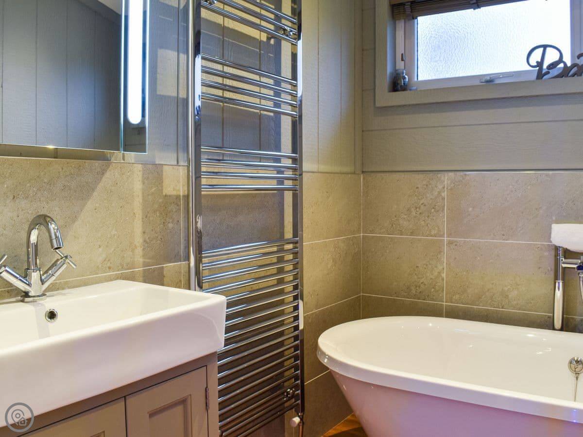 The moment you step into this detached lodge you are welcomed by a sumptuous, modern environment. The open plan space is light and airy, with plenty of room to relax and entertain in. The living area has deep, comfy sofas in which to settle in front of the large Smart TV, or maybe challenge someone to a game on the Xbox. The dining area boasts a large table and comfy chairs and is ideally placed to watch the chef do his work. The kitchen has every appliance you could ask for with a 5-burner hob and even a wine chiller to ensure that your evening tipple is served at the perfect temperature. The first bedroom is spacious with quality fixtures and fittings around the double bed; across the way is the family bathroom with a deep roll-top bath, so you can soak away the aches of a good day’s walking. The master bedroom has a kingsize bed at its centre, and again the quality of the fixtures shine out, including the realistic effect fire in the corner. It has a large en-suite with shower cubicle and even a walk-in wardrobe behind the bed. The final detail is a small room for your canine friend with external access.
