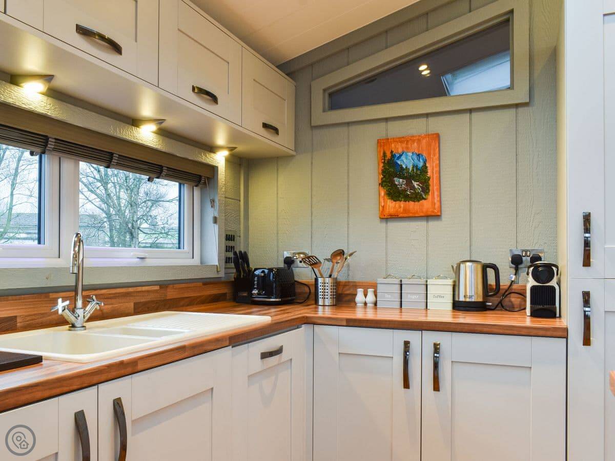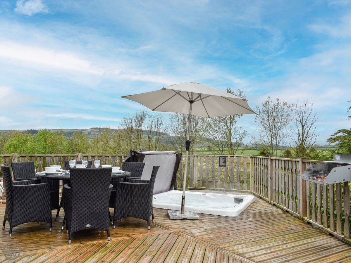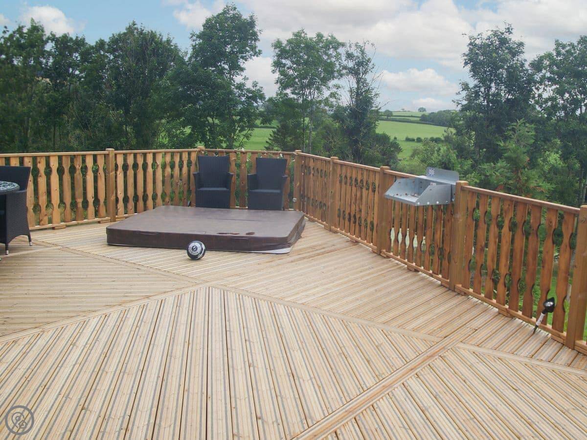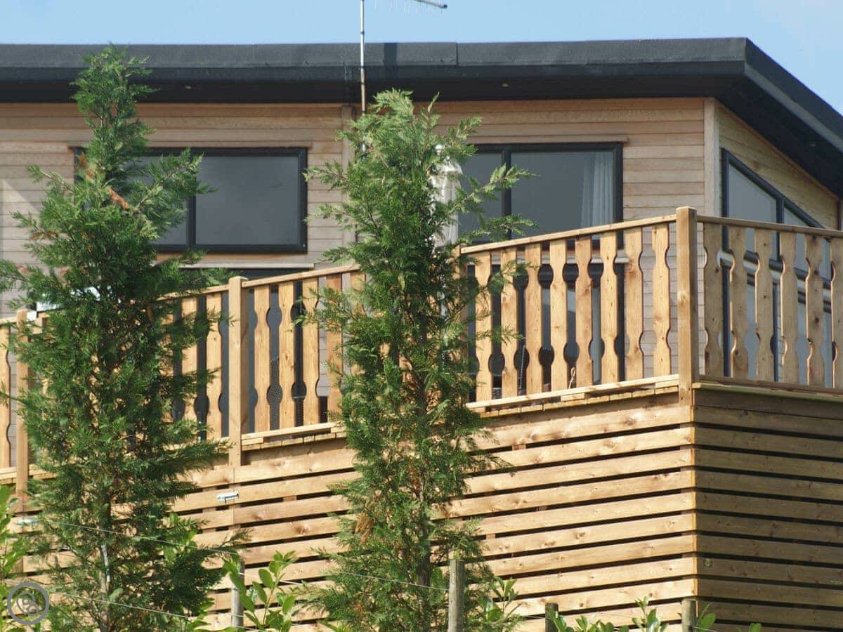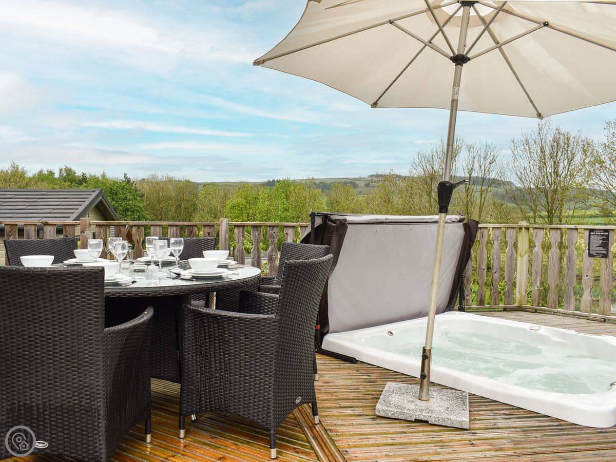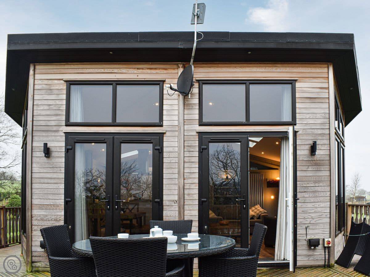 The moment you step into this detached lodge you are welcomed by a sumptuous, modern environment. The open plan space is light and airy, with plenty of room to relax and entertain in. The living area has deep, comfy sofas in which to settle in front of the large Smart TV, or maybe challenge someone to a game on the Xbox. The dining area boasts a large table and comfy chairs and is ideally placed to watch the chef do his work. The kitchen has every appliance you could ask for with a 5-burner hob and even a wine chiller to ensure that your evening tipple is served at the perfect temperature. The first bedroom is spacious with quality fixtures and fittings around the double bed; across the way is the family bathroom with a deep roll-top bath, so you can soak away the aches of a good day’s walking. The master bedroom has a kingsize bed at its centre, and again the quality of the fixtures shine out, including the realistic effect fire in the corner. It has a large en-suite with shower cubicle and even a walk-in wardrobe behind the bed. The final detail is a small room for your canine friend with external access.