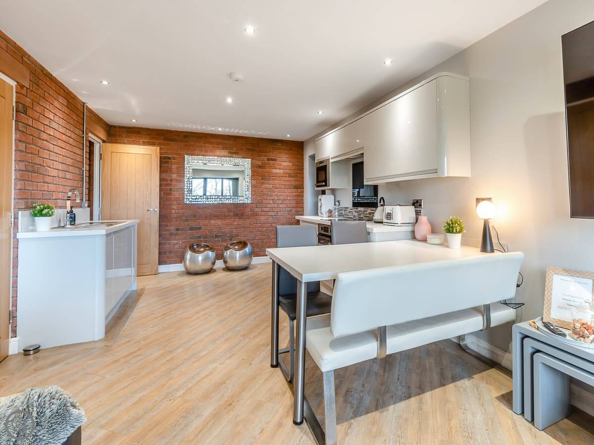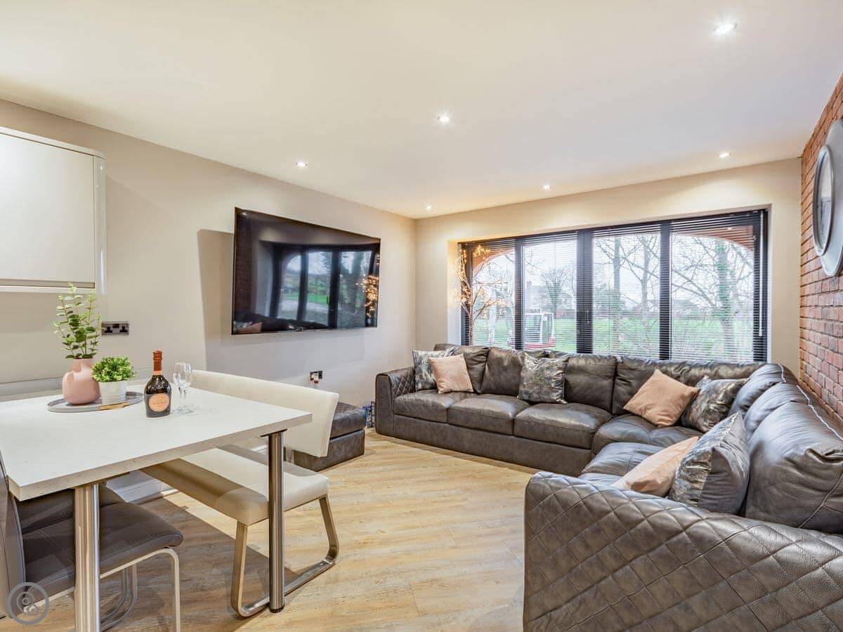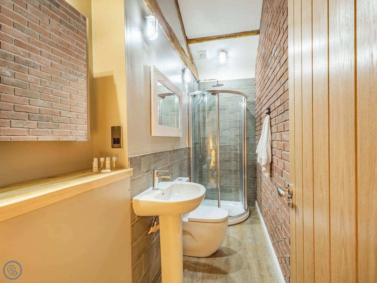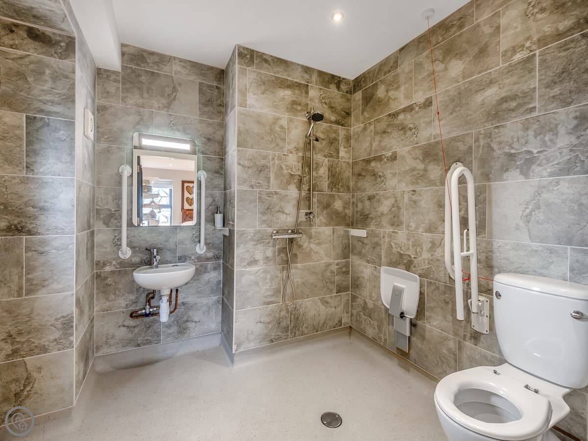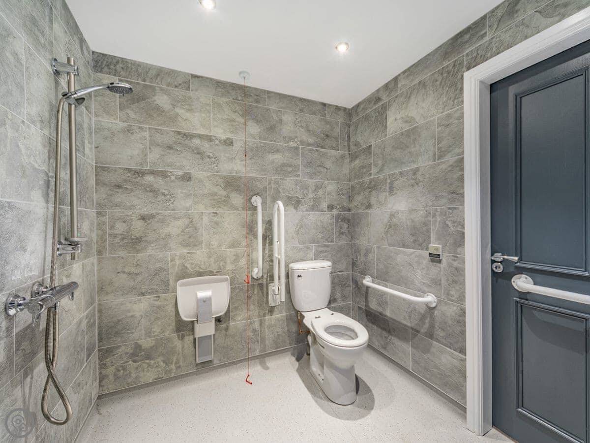 Move into the large living space with original stone and brick walls, complimented sympathetically with additional Cumbrian brick walls and Cumbrian sandstone headers. The comfortable open-plan living area accommodates 6-7 people, creating a place where everyone can relax in comfort, including people in wheelchairs or with limited mobility. There is a wall mounted 75" TV on display, which is perfect for those movie nights in with popcorn and nibbles. Located just off the living area is a generously sized downstairs bedroom with a kingsize bed and wet room with a roll-in shower facility, grab rails, and accessible sink and toilet. It also features the original stone walls, as well as having its own door to the property via a ramp. The well-equipped kitchen and dining area is perfect for mealtimes, and as an additional seating area to make the most of this spacious accommodation. The sumptuous upstairs bedrooms include an en-suite master bedroom, a bunk room with its own en-suite toilet, and a further kingsize room. The outdoor spaces are accessible to people with a variety of mobility requirements.