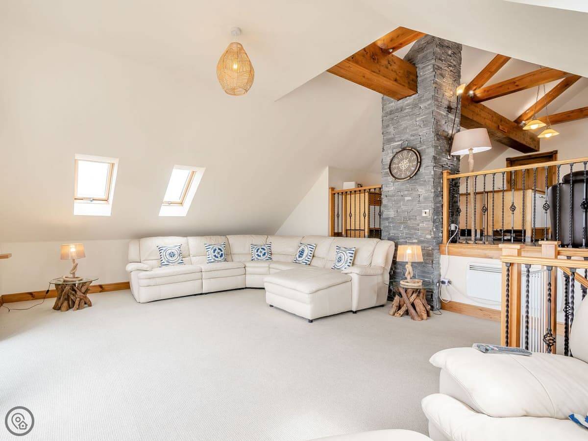 The layout is a bit different. The kitchen and the main living area are upstairs. That's so you get the best views while you're cooking or sitting around. The kitchen has a dining area. High ceilings, wooden beams. Then steps go down to a big living room with doors onto a balcony.