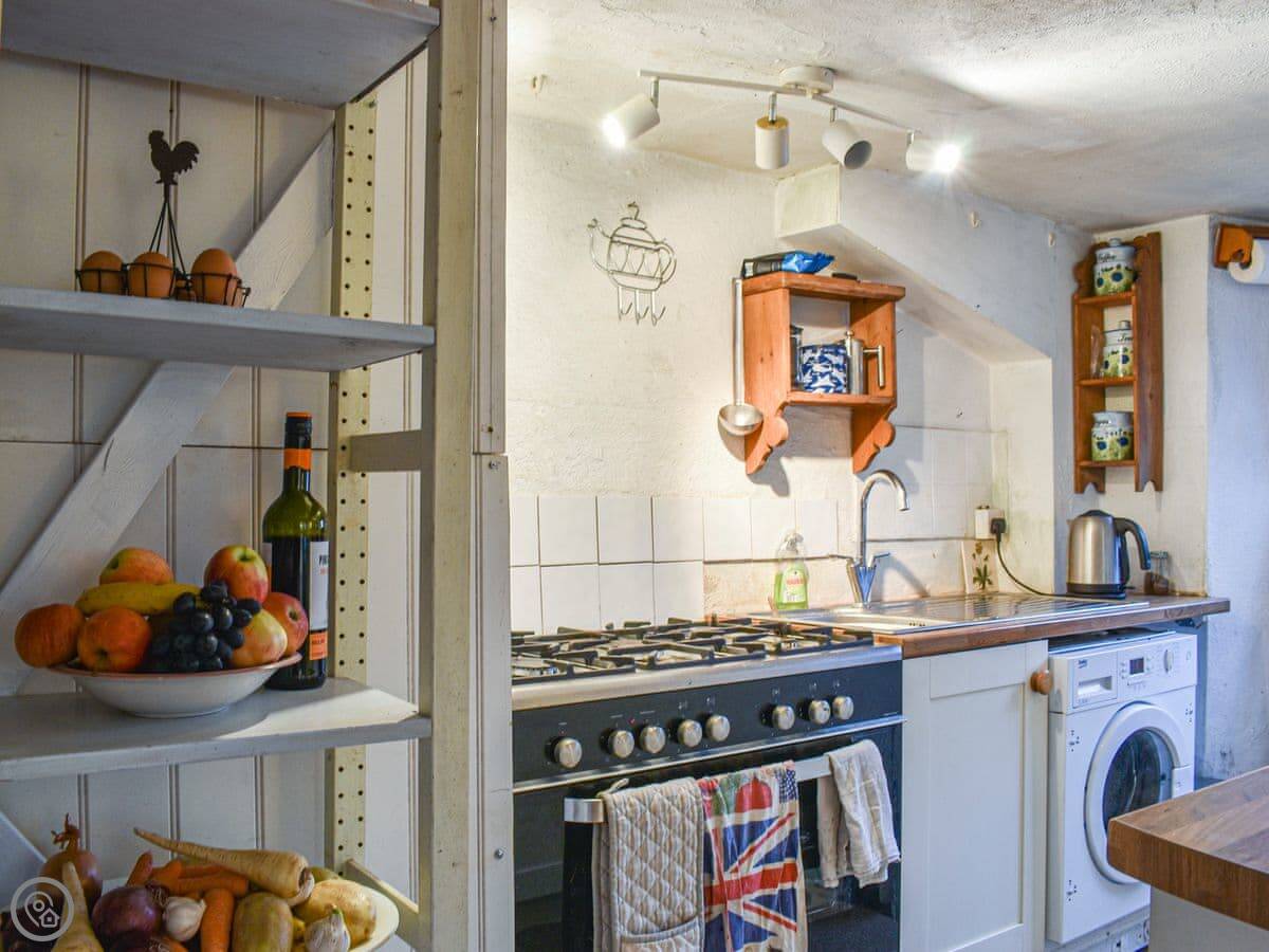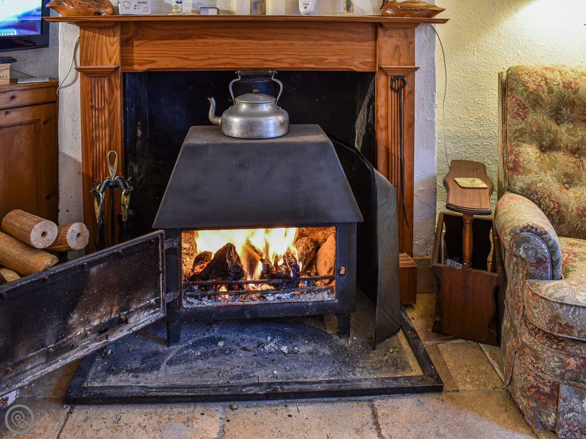 The open plan living area has a woodburning stove for winter. The kitchen's got a washing machine and a decent freezer. Bedding and towels are included.
