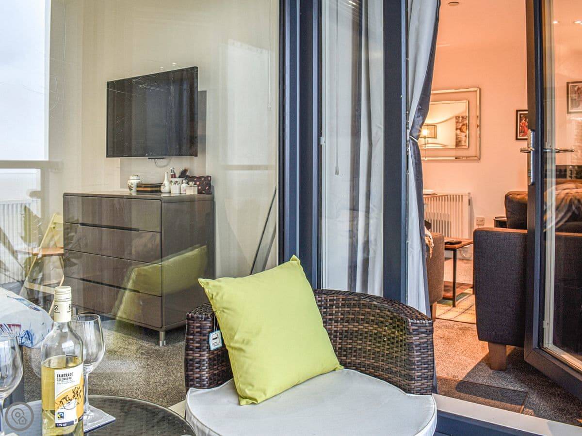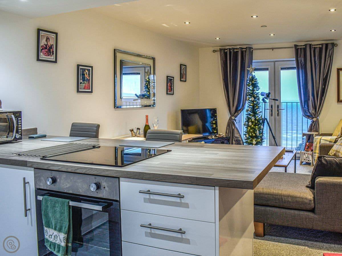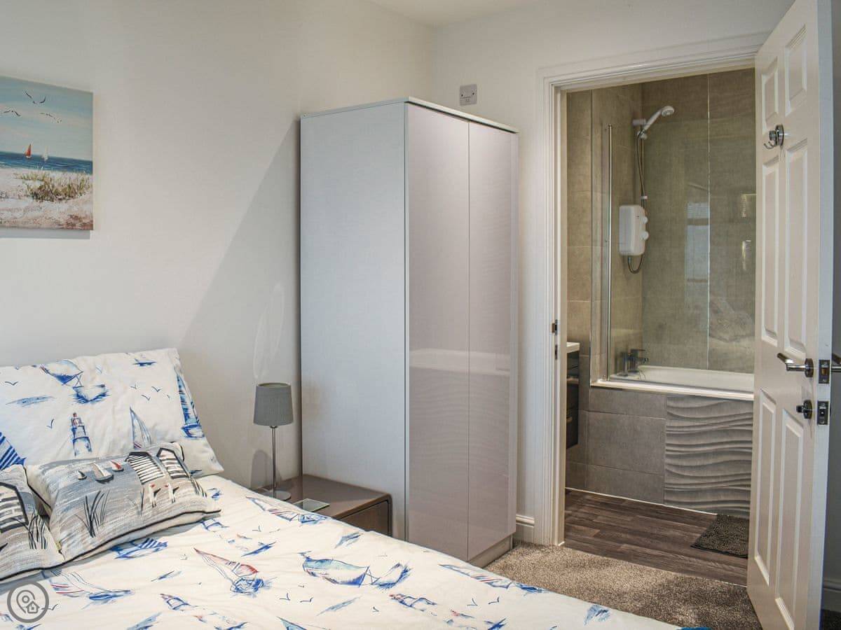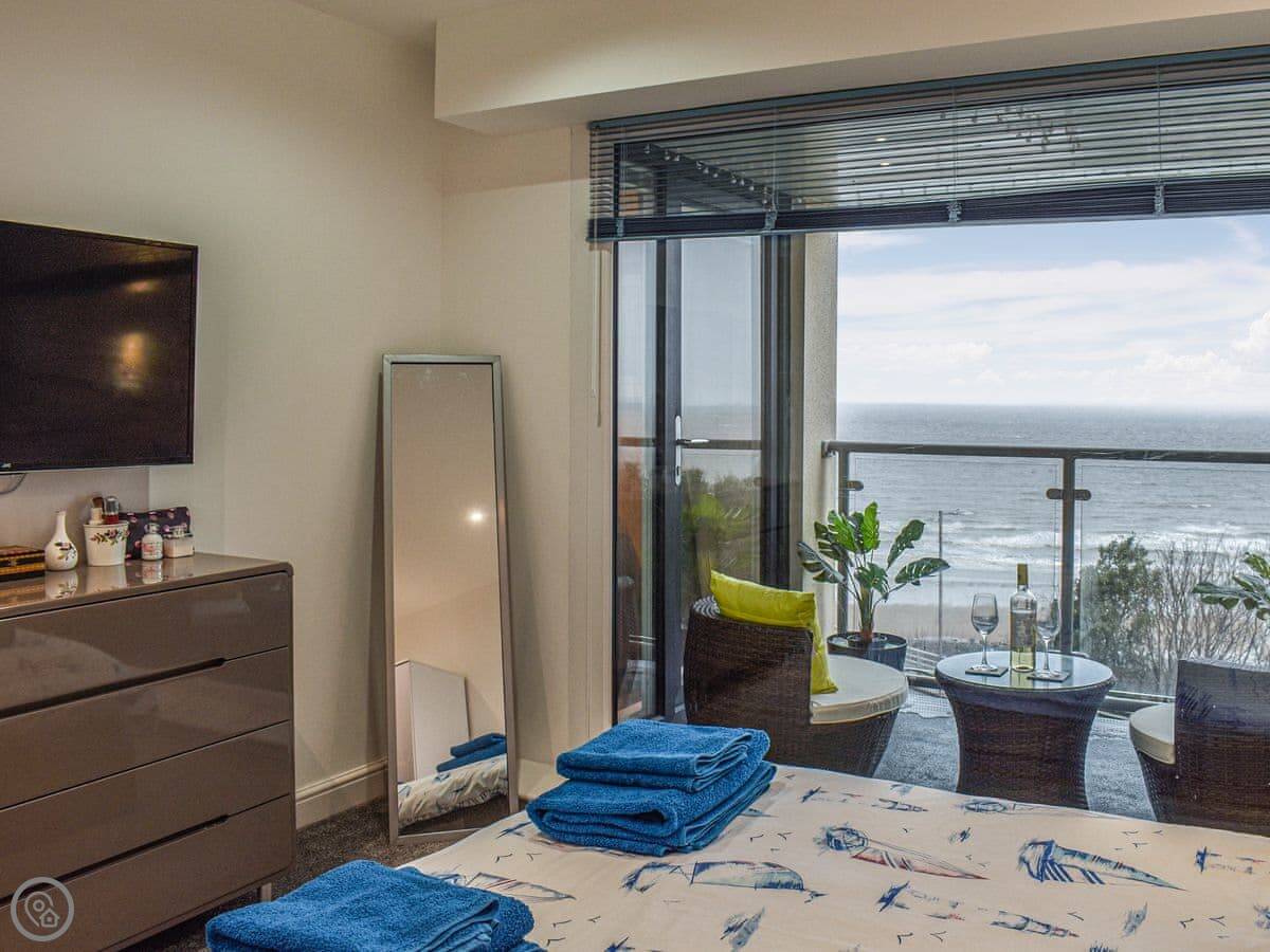 If you are looking for a seaside break with excellent links to all that North Wales has to offer, then look no further than Seascape. This two bedroom, two bathroom penthouse apartment is stylish and modern in design and benefits from a spectacular sea view from both the living/dining area and the master bedroom. Upon entering, you can’t help but be impressed with its 180 degree sea view over towards Puffin Island and the sunsets are really something special too. The property has an open living style with well equipped kitchen, breakfast bar and living area with comfortable sofa, TV and a small balcony with outdoor furniture for that early morning coffee to bring in the sea air and sunshine. Through into the master bedroom you will find a double bed, TV, and en-suite bathroom, this room benefits from sea view. The second bedroom has a double bed and en-suite shower room.