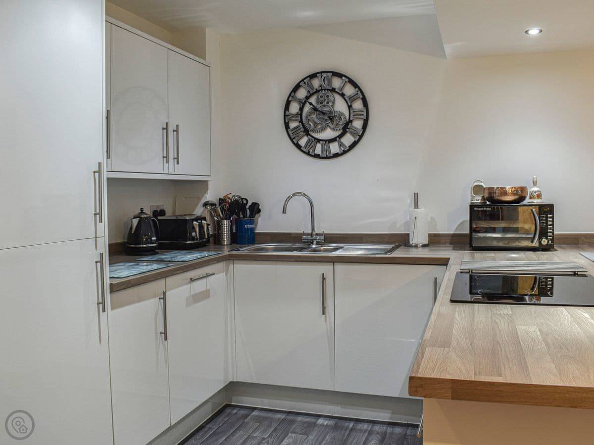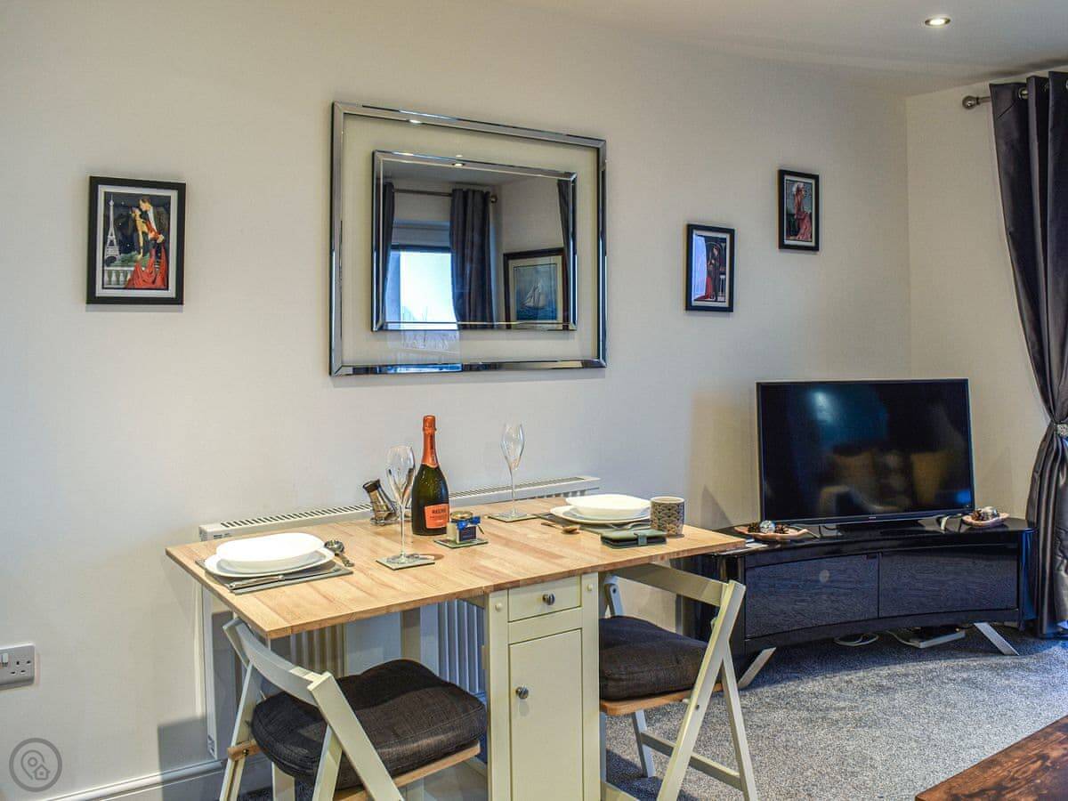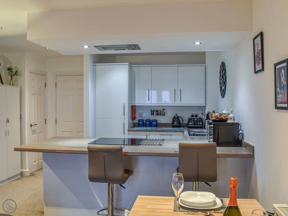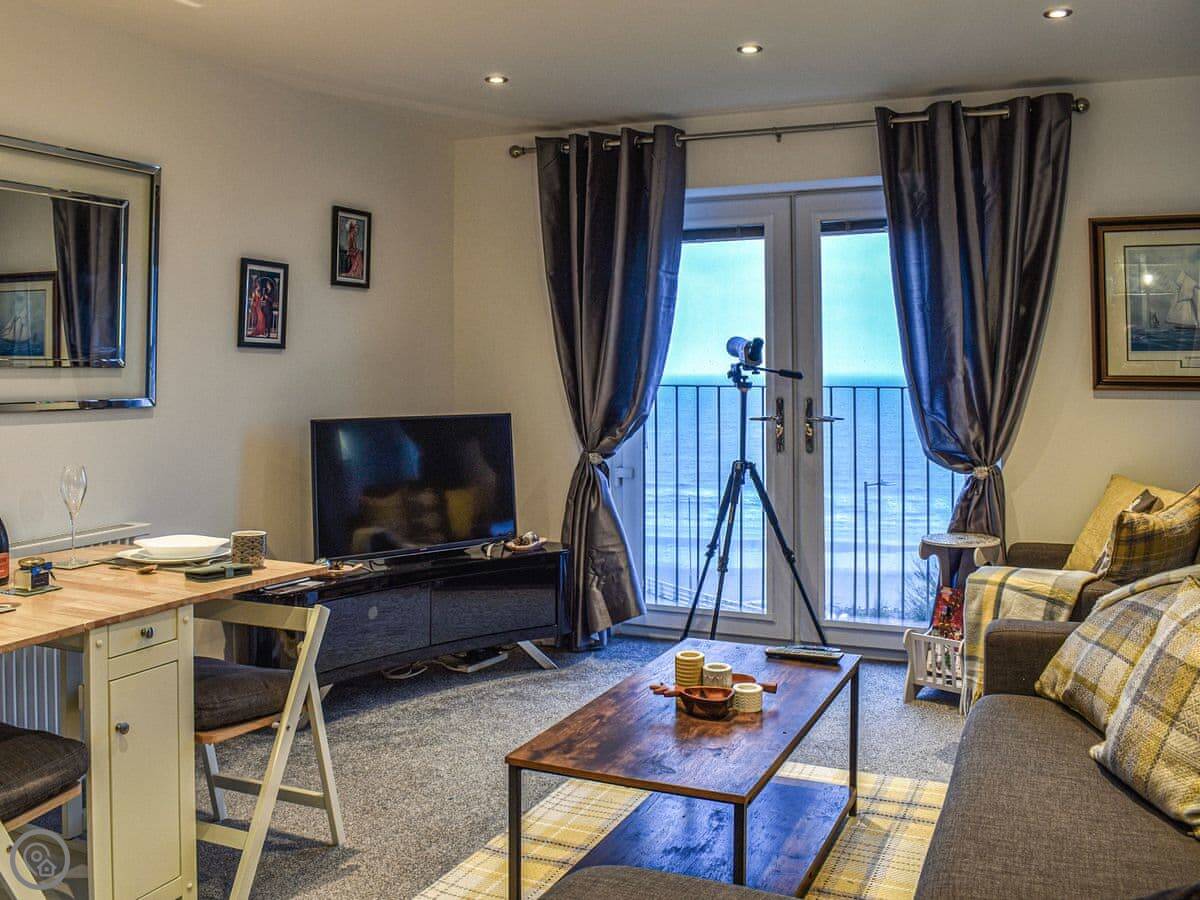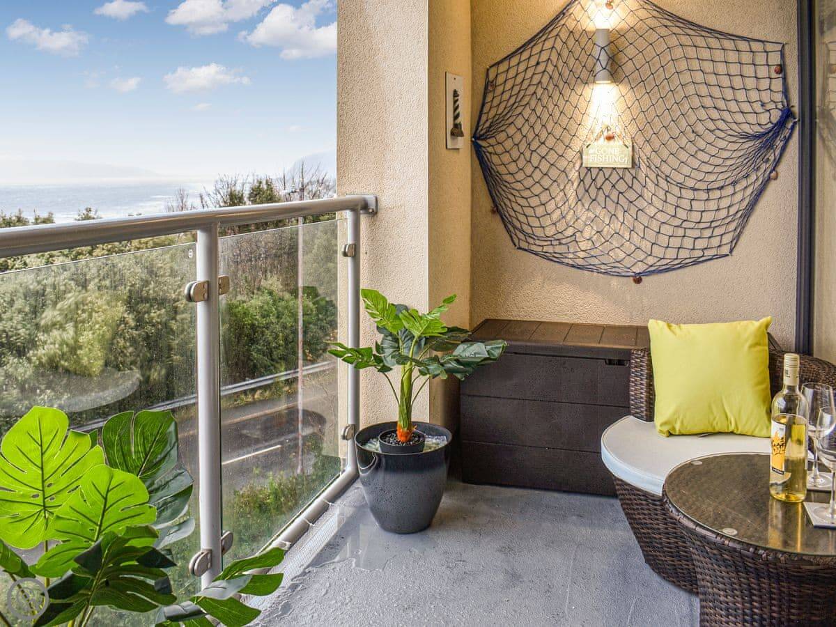 If you are looking for a seaside break with excellent links to all that North Wales has to offer, then look no further than Seascape. This two bedroom, two bathroom penthouse apartment is stylish and modern in design and benefits from a spectacular sea view from both the living/dining area and the master bedroom. Upon entering, you can’t help but be impressed with its 180 degree sea view over towards Puffin Island and the sunsets are really something special too. The property has an open living style with well equipped kitchen, breakfast bar and living area with comfortable sofa, TV and a small balcony with outdoor furniture for that early morning coffee to bring in the sea air and sunshine. Through into the master bedroom you will find a double bed, TV, and en-suite bathroom, this room benefits from sea view. The second bedroom has a double bed and en-suite shower room.