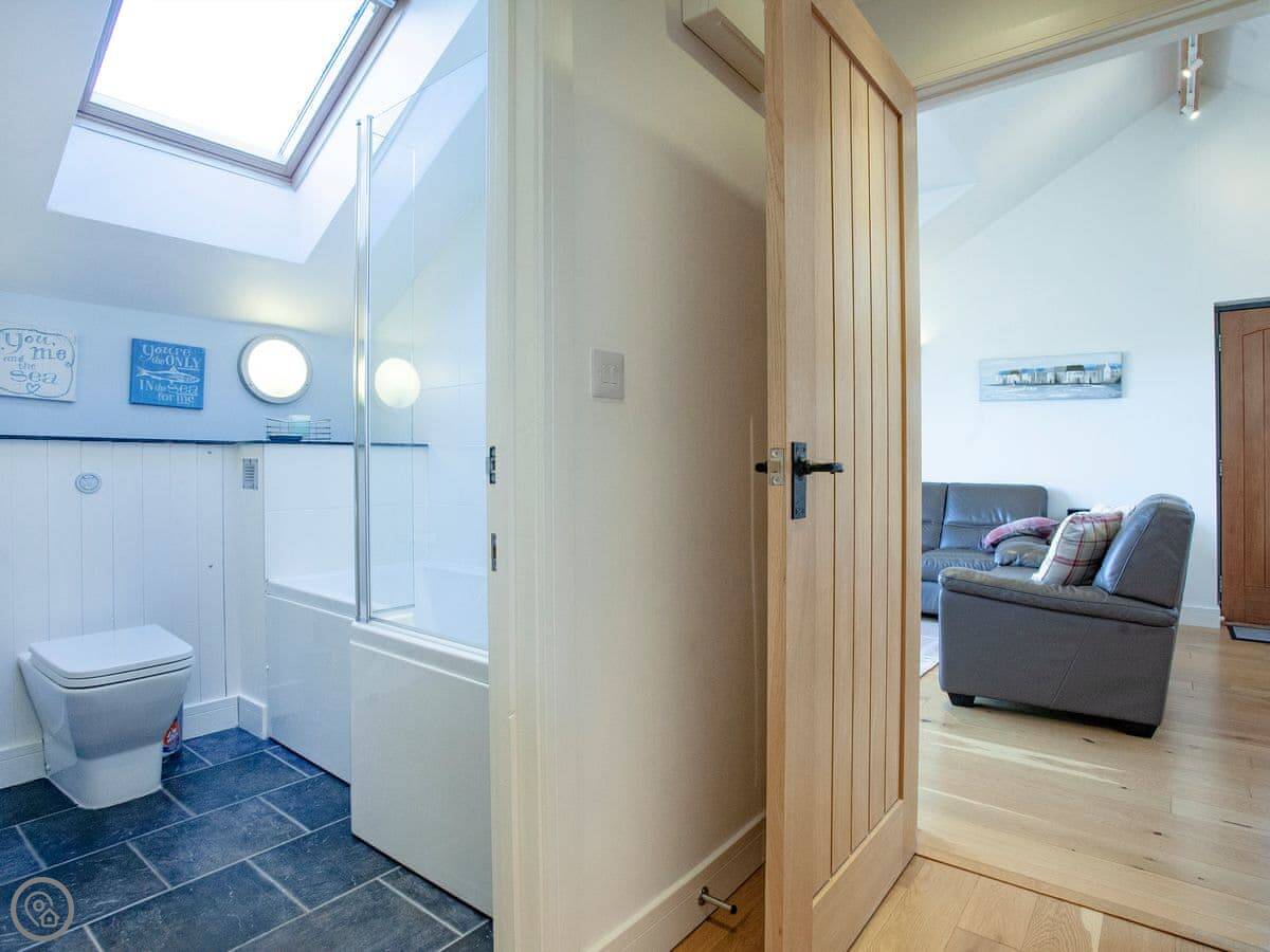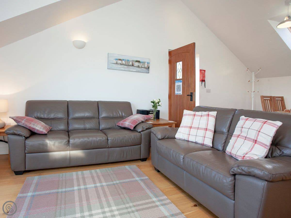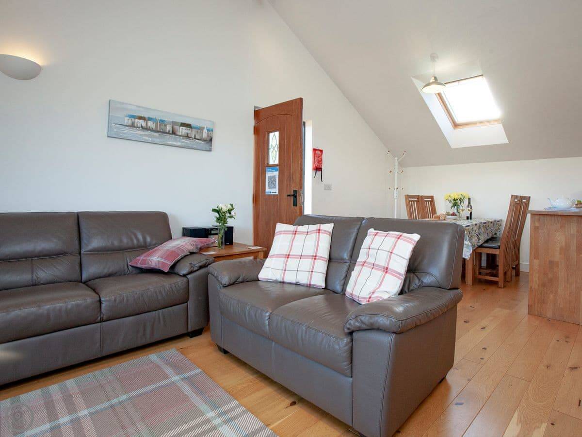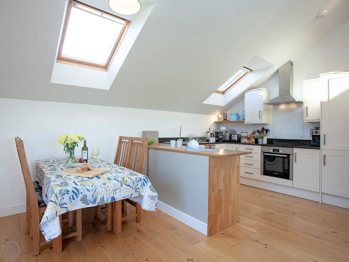 It's a two bedroom place, sleeps four. One bathroom. It's got a 5 Star rating which means it's quite nicely done up. Underfloor heating, oak floors, leather sofas. The kitchen has a granite worktop. It's open plan.