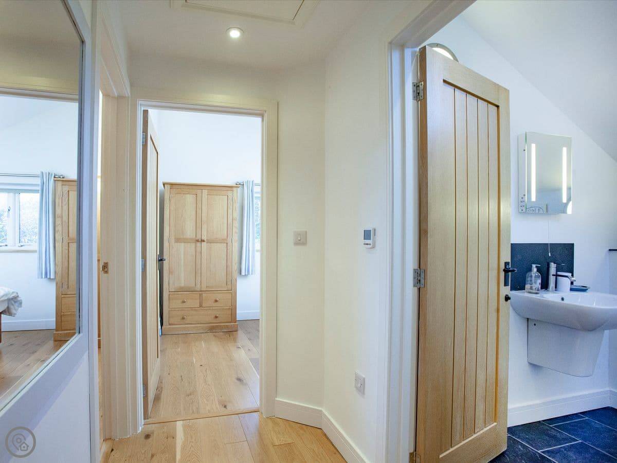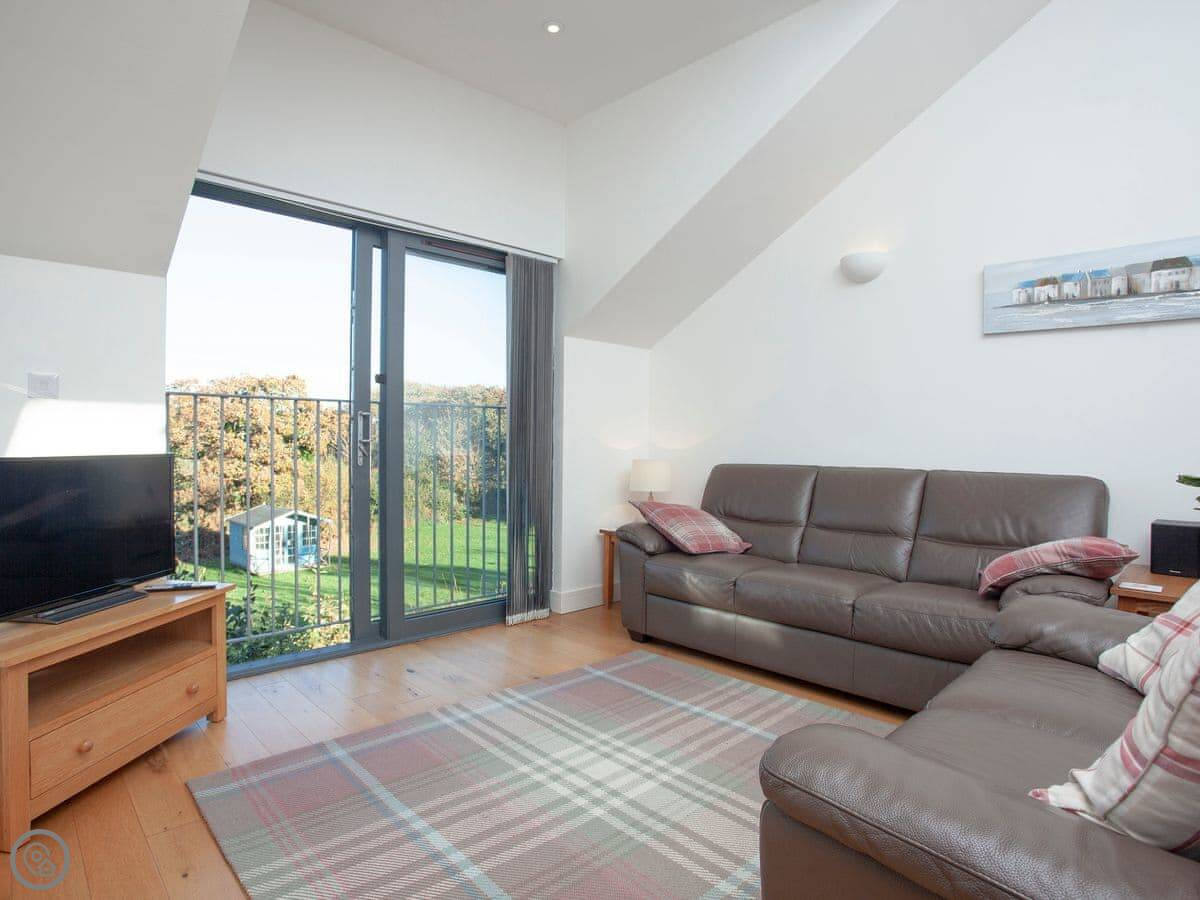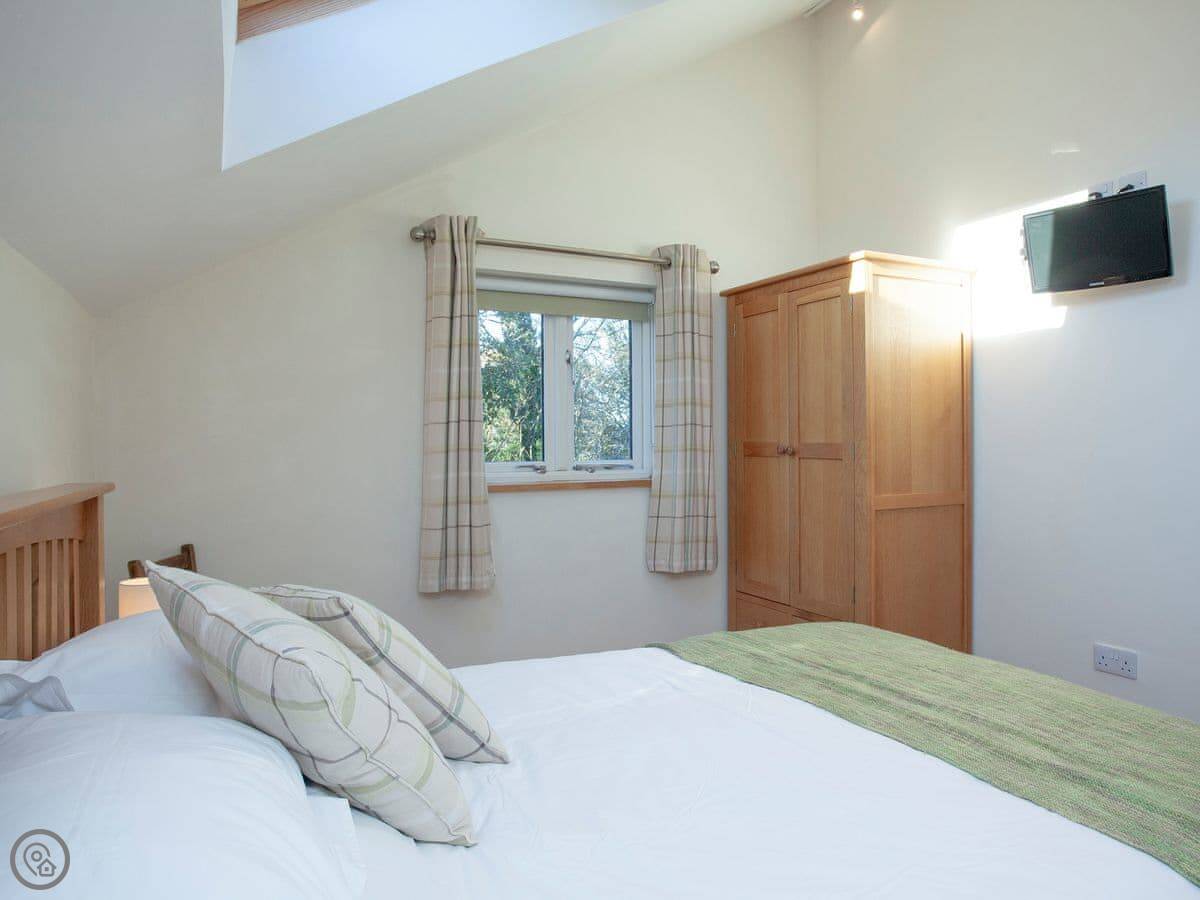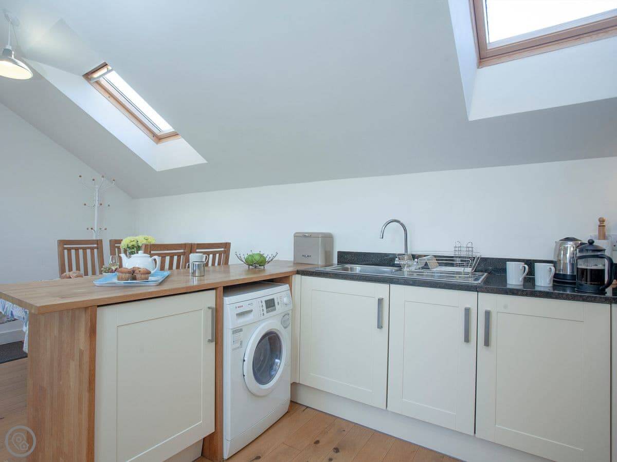 It's a two bedroom place, sleeps four. One bathroom. It's got a 5 Star rating which means it's quite nicely done up. Underfloor heating, oak floors, leather sofas. The kitchen has a granite worktop. It's open plan.