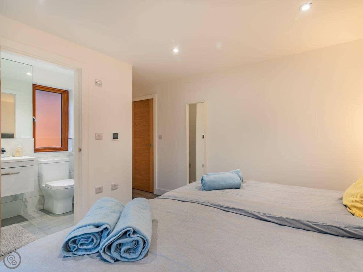 It sleeps eight in four bedrooms. Three bathrooms, which helps with a bigger group. It's a 4 Star place, so it's well-equipped and comfortable. The layout is a bit unusual: the main living area is on the top floor to make the most of the view. There are bi-folding doors that open onto a balcony. One of the bedrooms on the lower level is glass-fronted and opens straight out onto the deck.