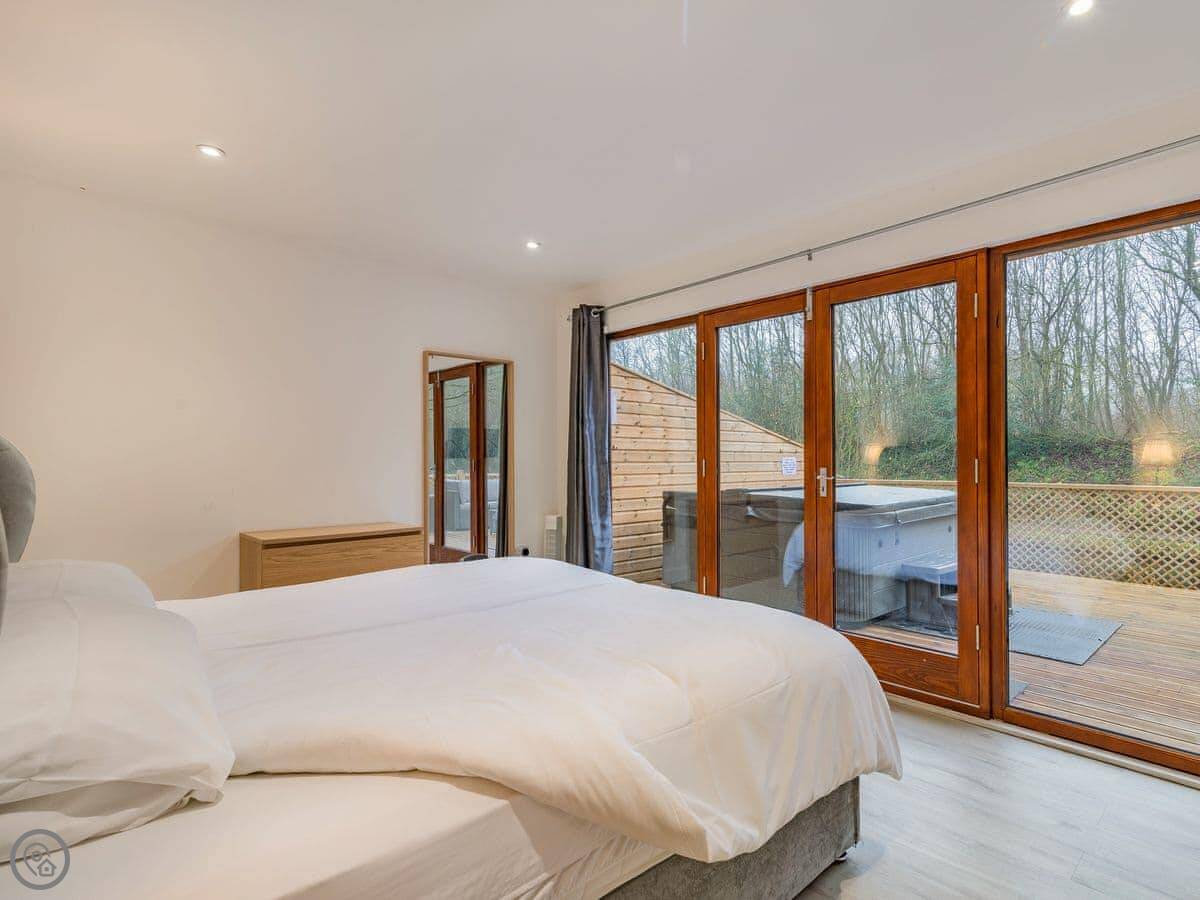 The layout is over three floors. The main living area is on the top floor. It has big folding doors that open onto a deck with good views over the water. There's a bedroom with an ensuite on the middle floor, plus another bedroom and the main bathroom. Downstairs, there are two more bedrooms. One of them has glass doors that open straight out onto a big deck by the water. That's the one most people want. There's a hot tub on one of the decks.
