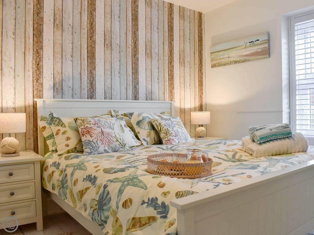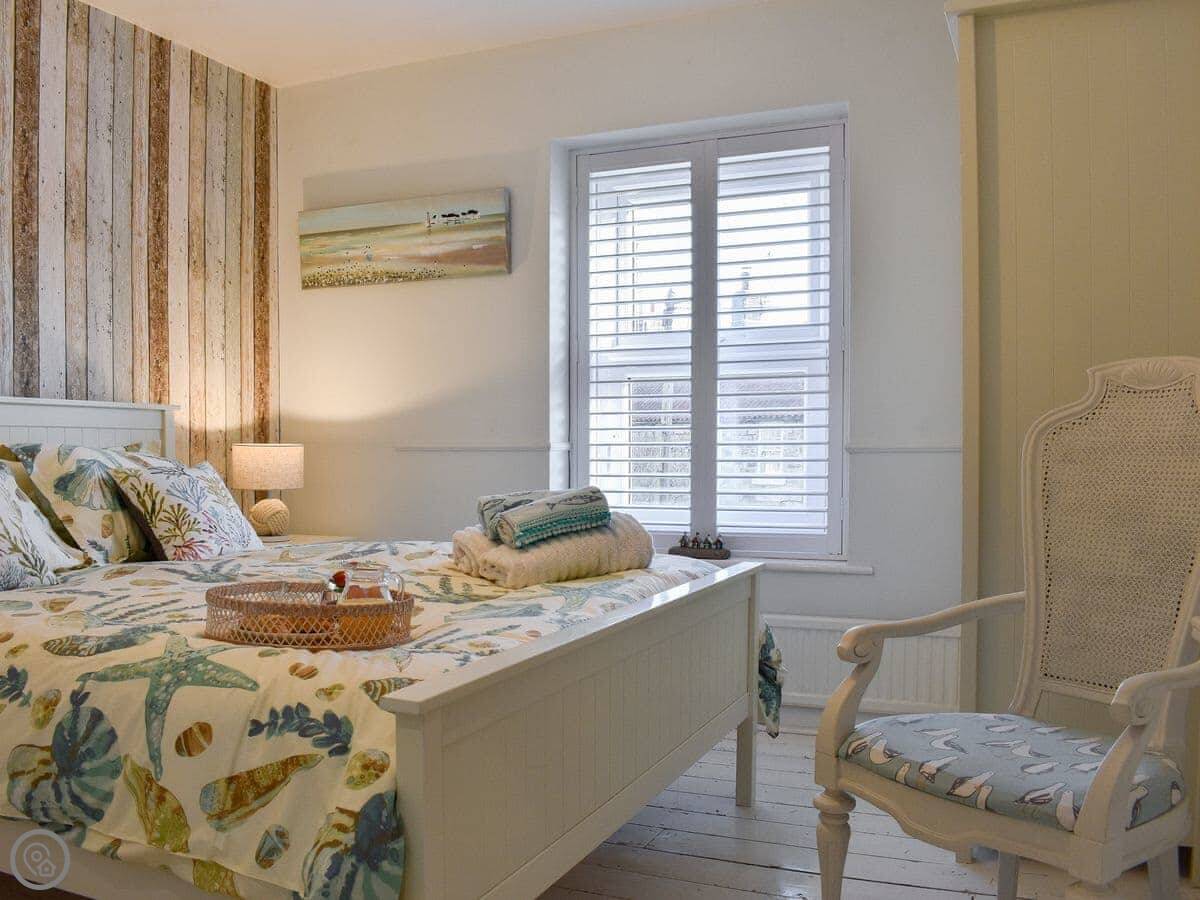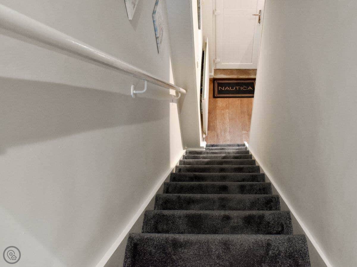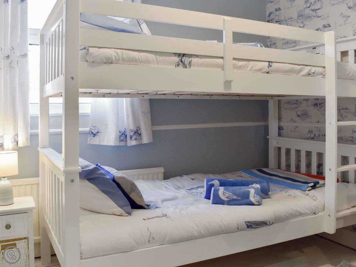 Step down into the dining area which is open plan with the bespoke modern kitchen. There is a door from the kitchen leading out into the small rear yard with outdoor seating. Upstairs there are three beautifully presented bedrooms. A master king bedroom with a wardrobe and drawers for your belongings, plus a double bedroom again with plenty of storage, as well as a bunk bedroom.