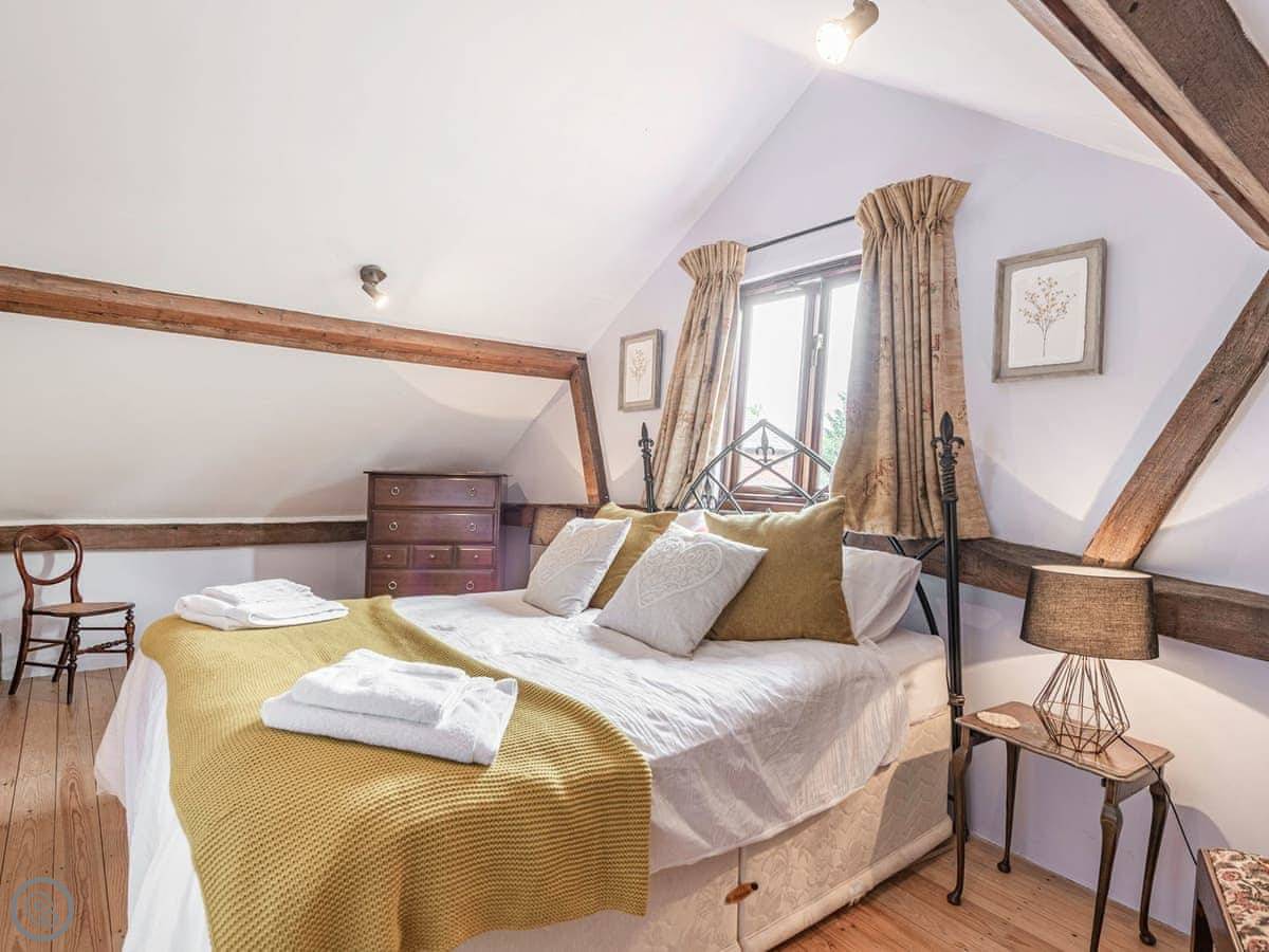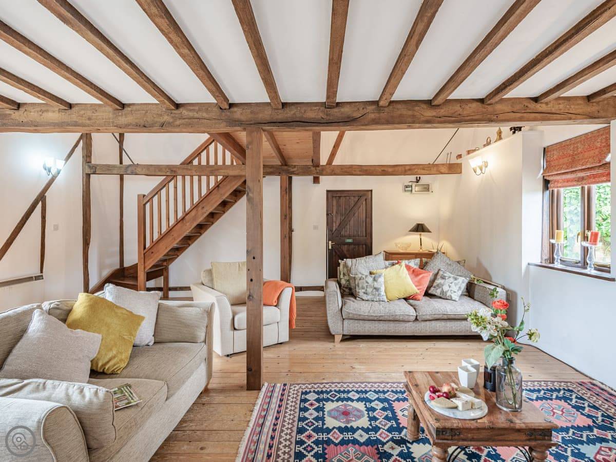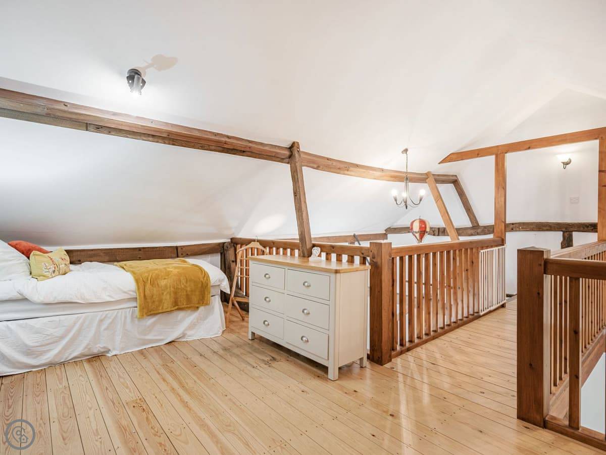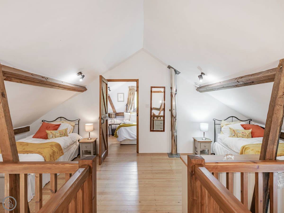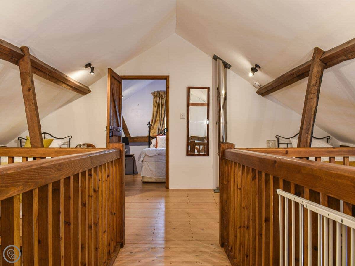 It sleeps four. Two bedrooms and one bathroom. The main living area has a high ceiling with a galleried landing above it. That's where one of the bedrooms is. It's a king size bed up there. The other bedroom is on the ground floor. It's got a traditional feel. It's a 4 Star, so it's comfortable and well equipped.
