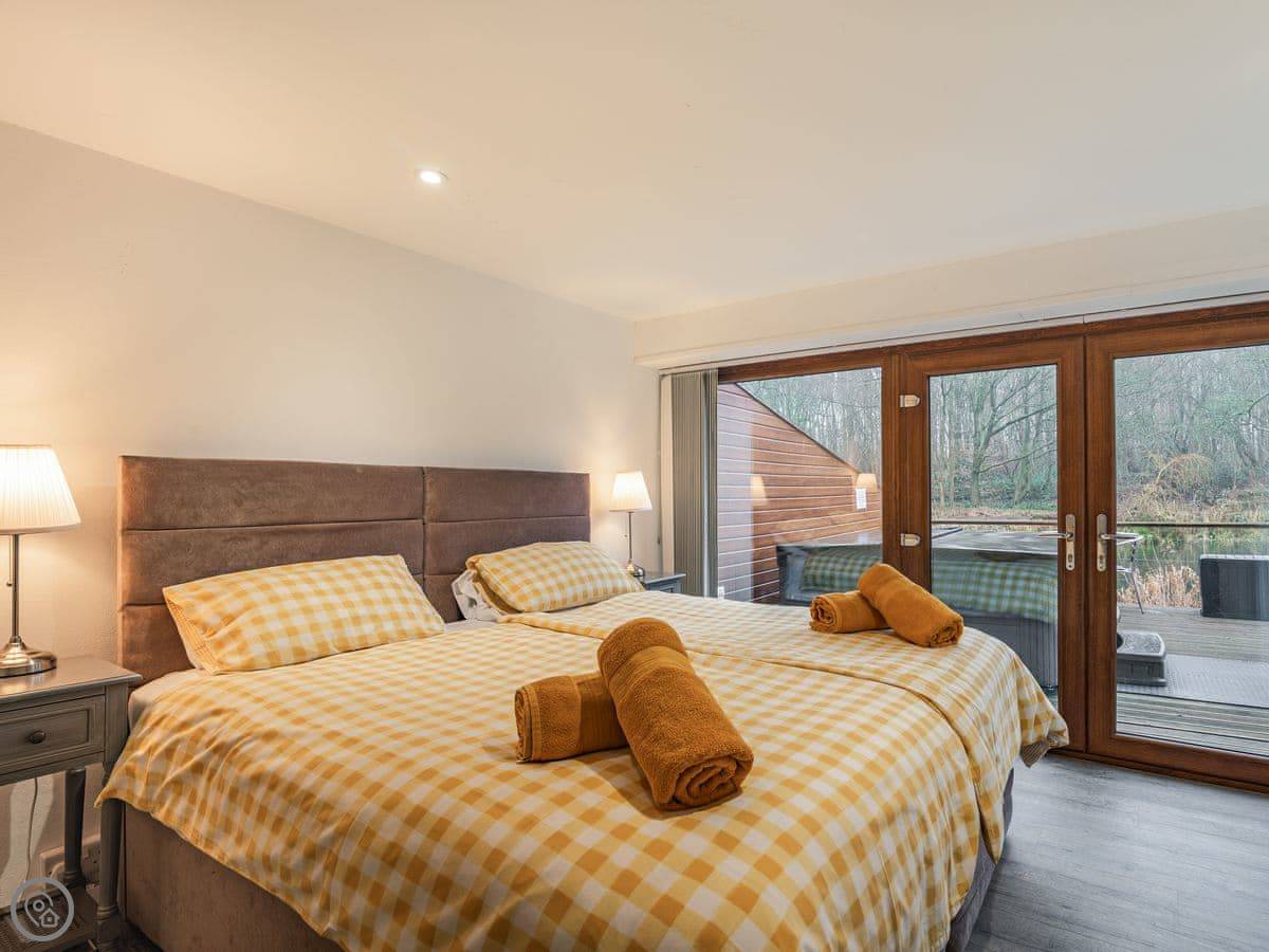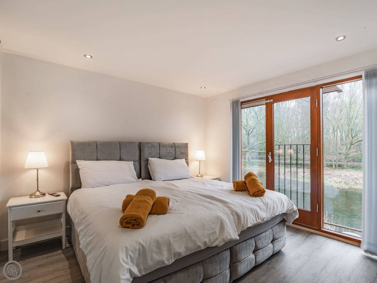 The layout is a bit different. The main living area is on the top floor, with big doors that open onto a balcony. You get a good view from up there. The middle floor has two bedrooms and a bathroom. The third bedroom is on the lower ground floor. It has glass doors that open straight out onto a decked area by the water. That one's quite nice.