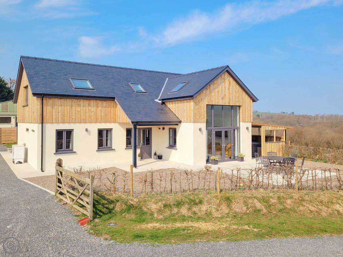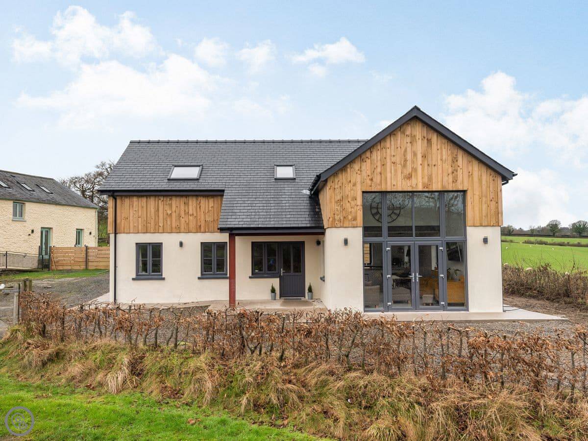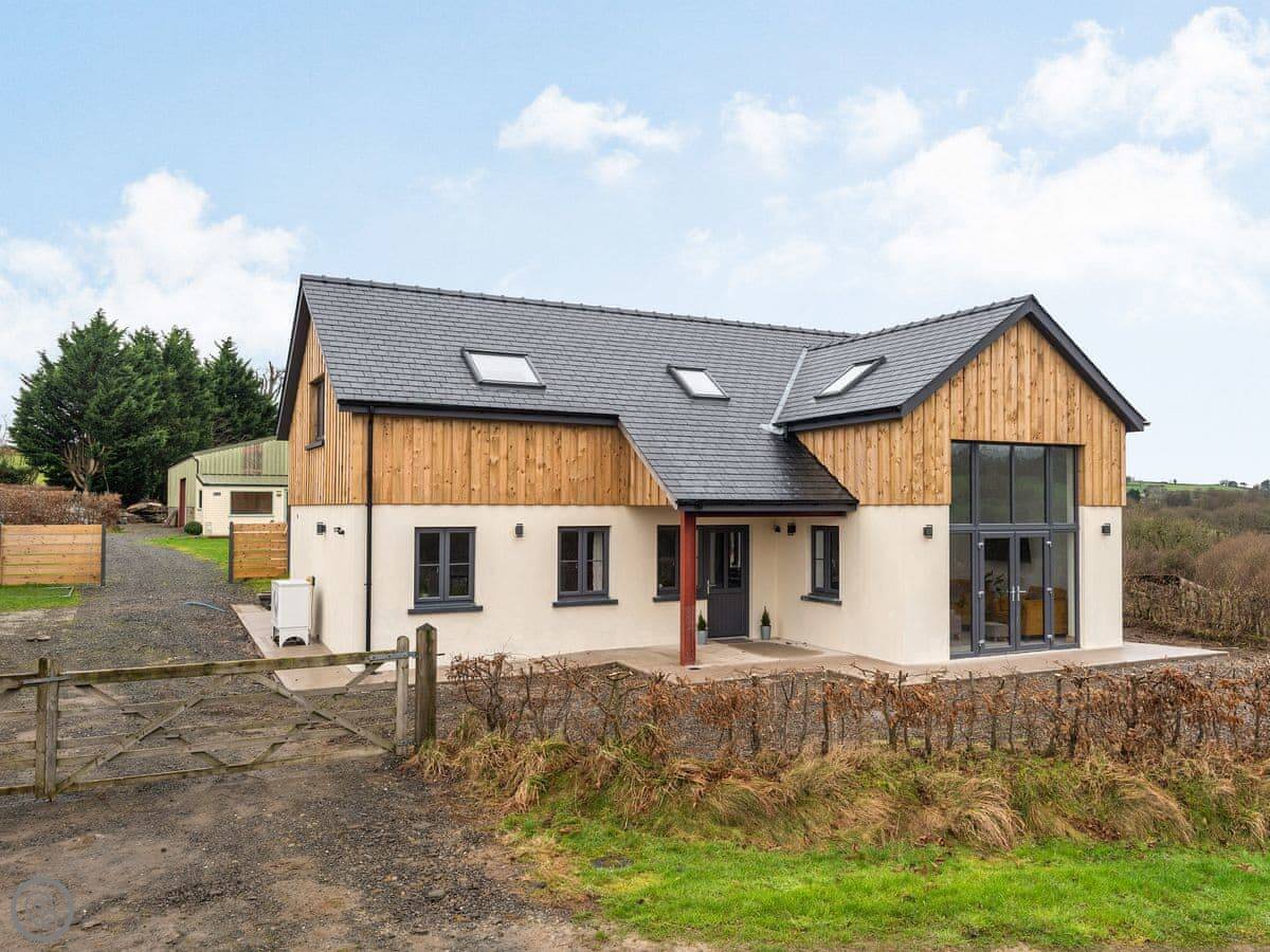 Right, Red Kite Lodge. It's a new build, finished in 2020. It's detached, on our smallholding here at Stags Head. Sleeps seven across four bedrooms, and there are three bathrooms, which helps with a full house.