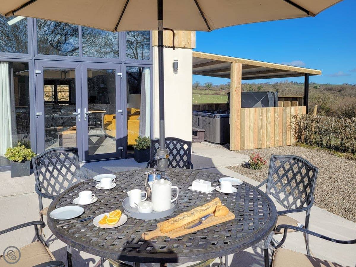 Everything's on one level except for two of the bedrooms, which are upstairs. The main living space has those patio doors out to the garden and the hot tub. The hot tub is private, in its own gated bit at the front. The garden at the back is enclosed.
