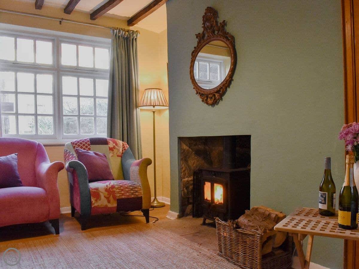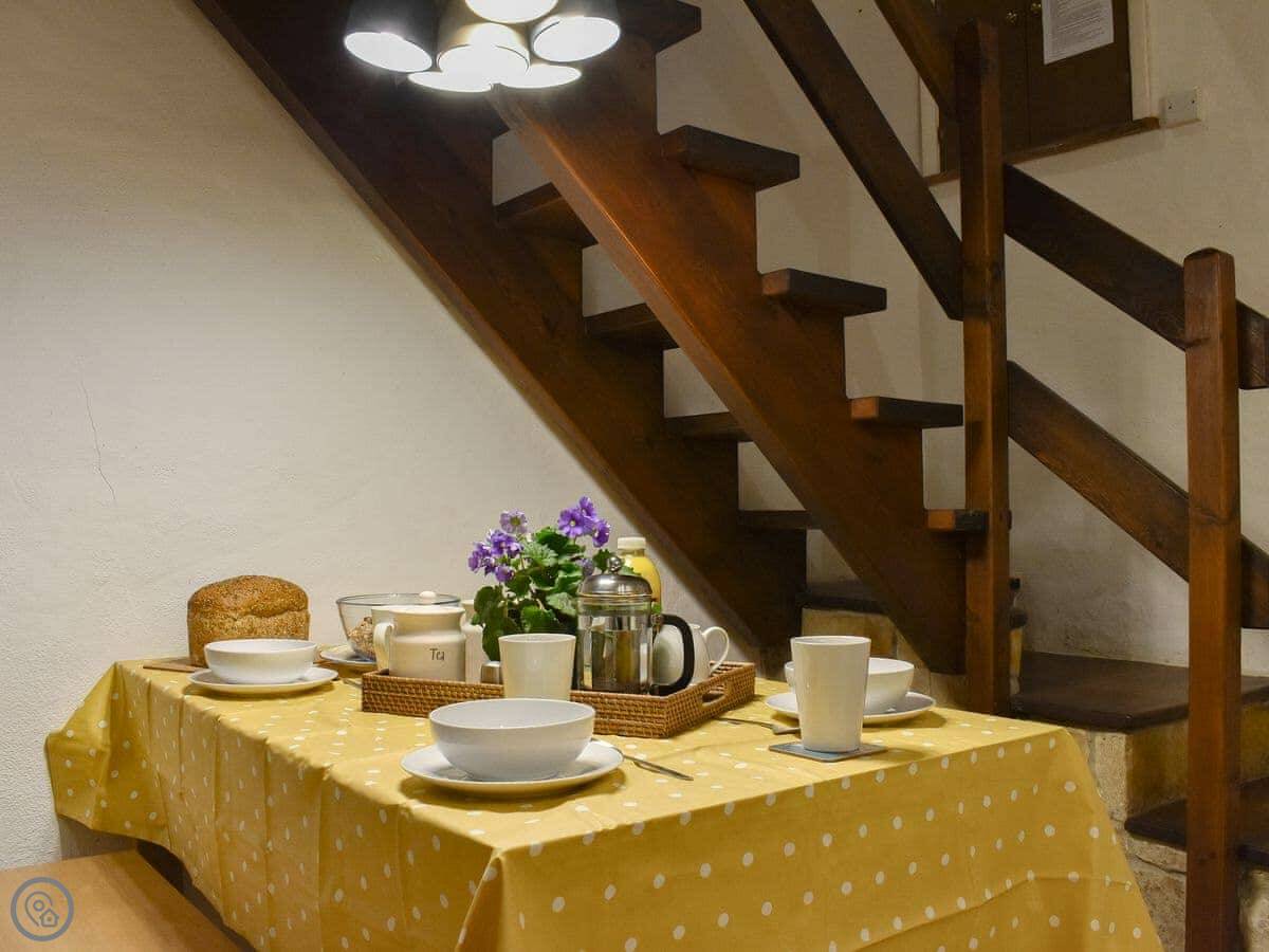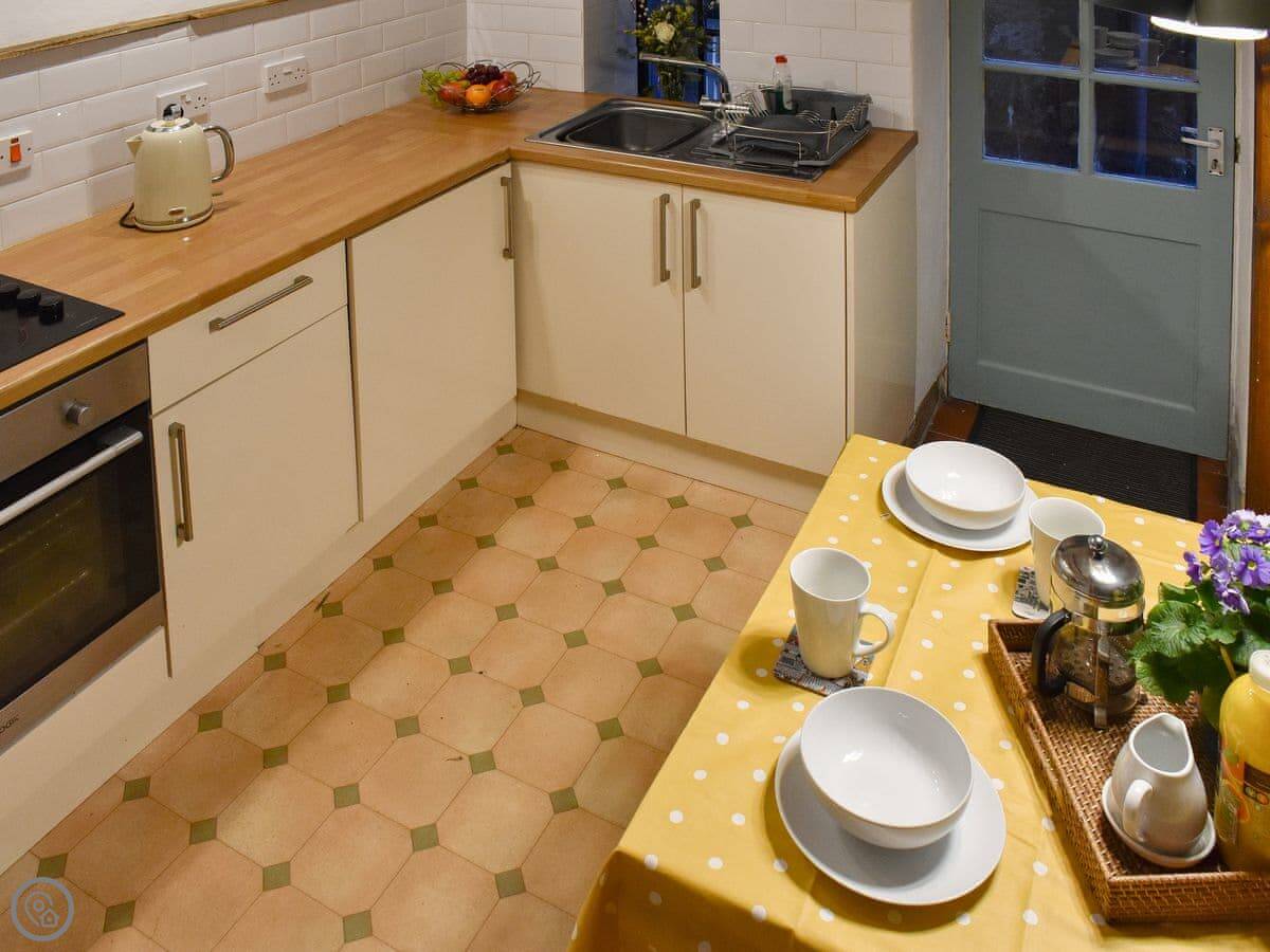 There's a wood burner in the living room. The kitchen is downstairs on the lower ground floor. It's compact, but it has what you need. There's a table for four in there.
