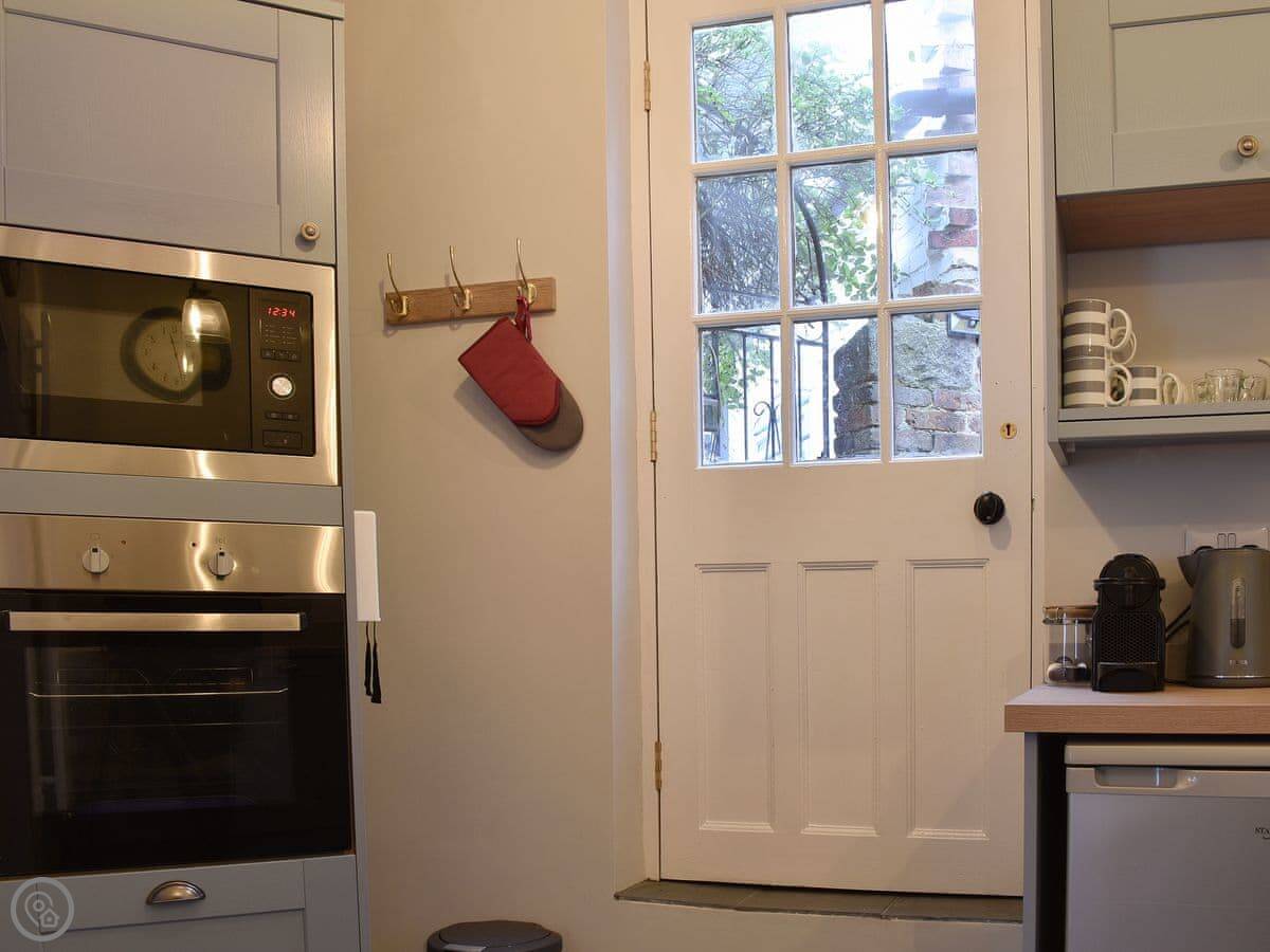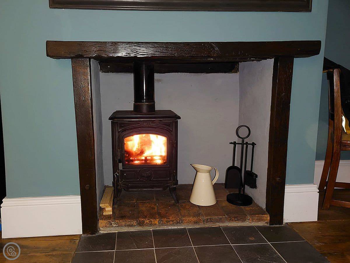 Downstairs is the living room. It's a decent size, with a wood burner, a sofa, chairs and a table for four. The kitchen is off there, it's blue. It's got a dishwasher and a washing machine in the garage. You can park one car in that garage.