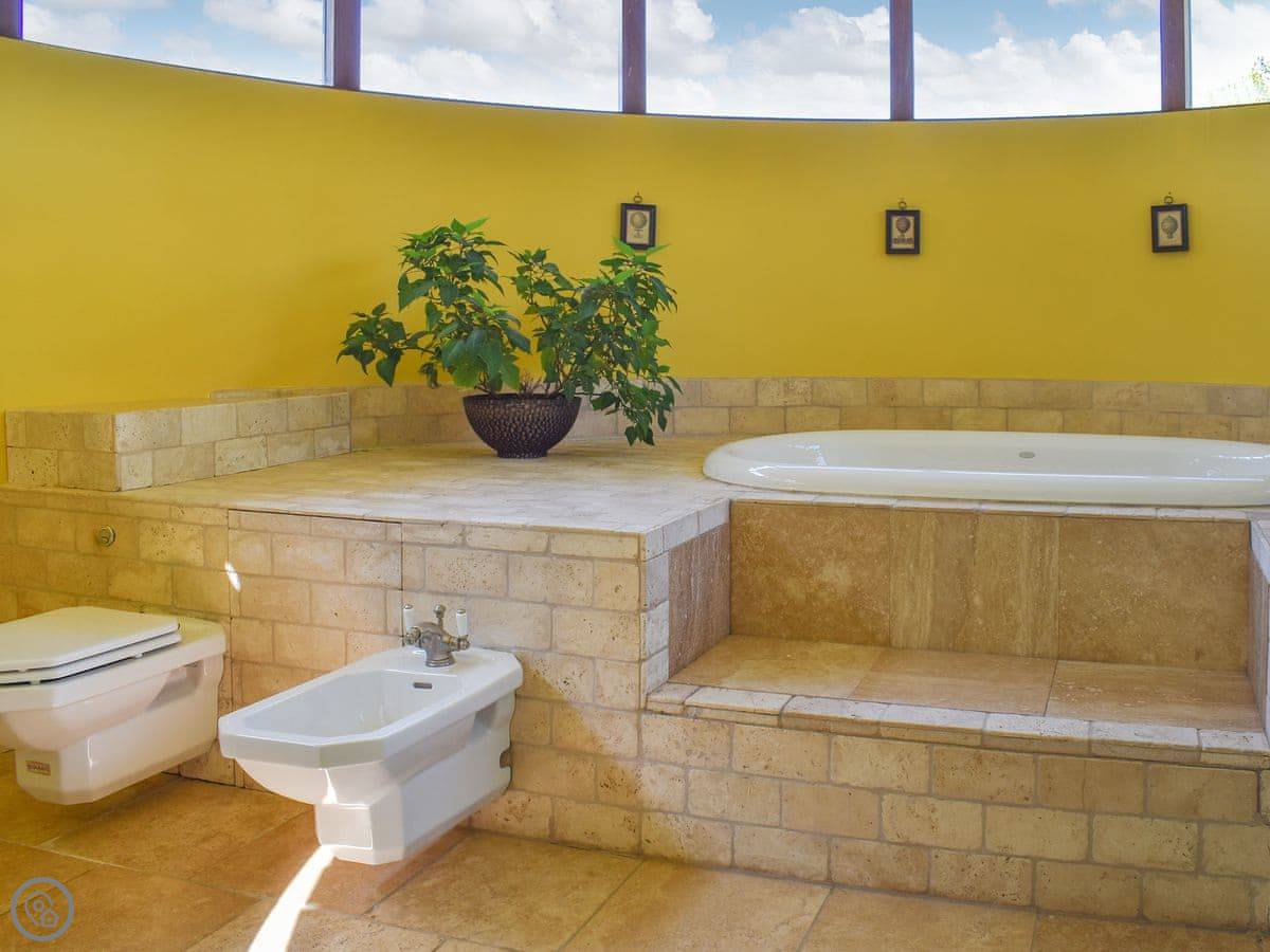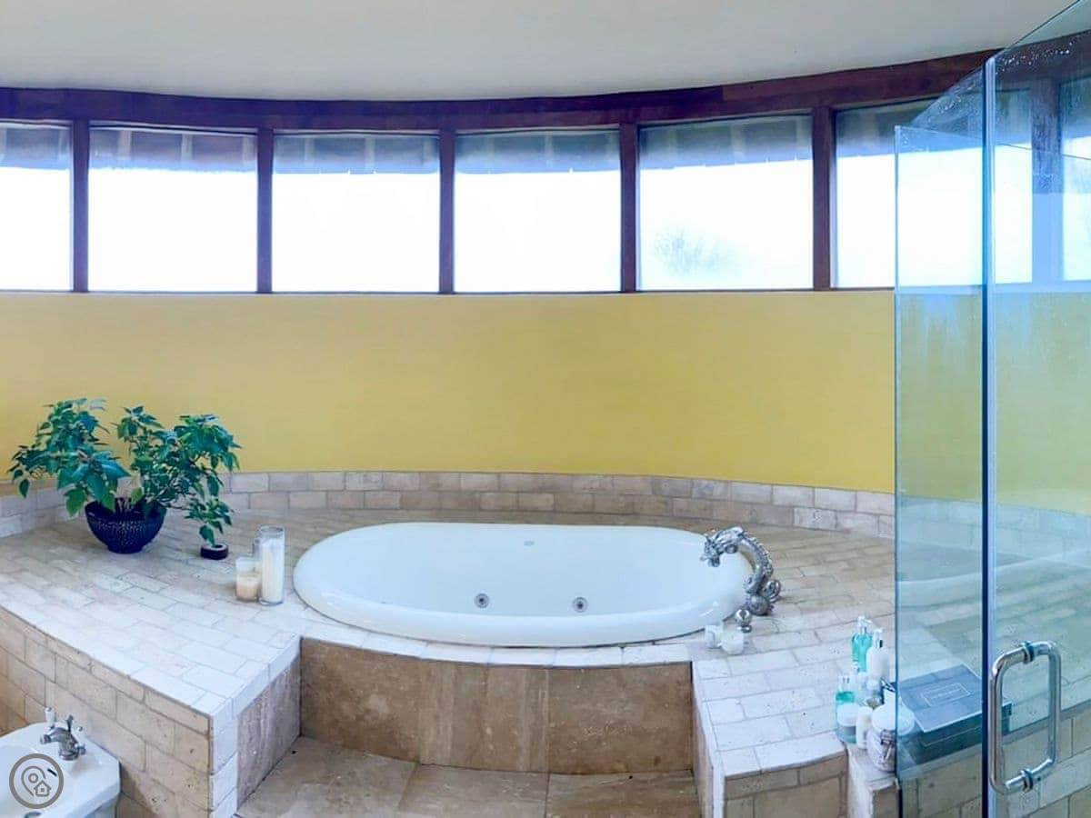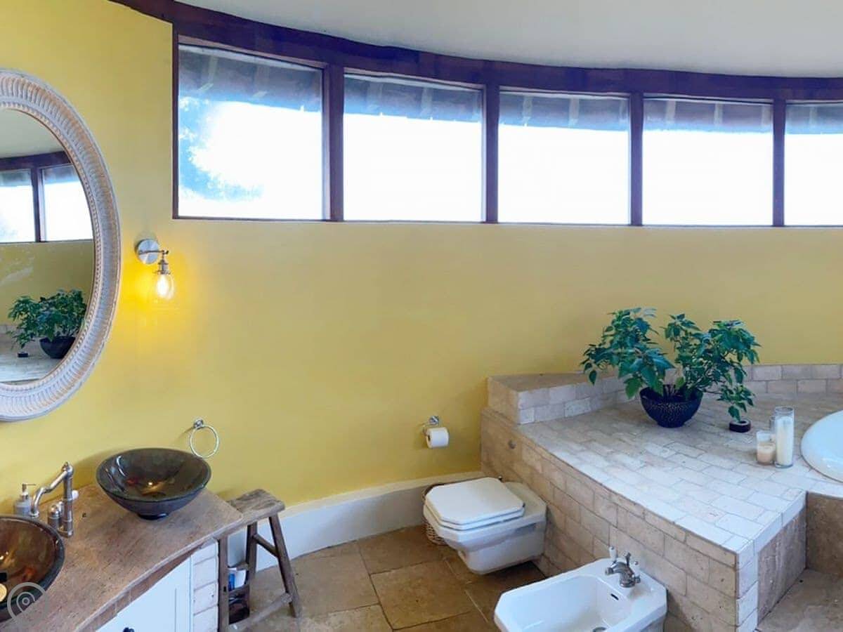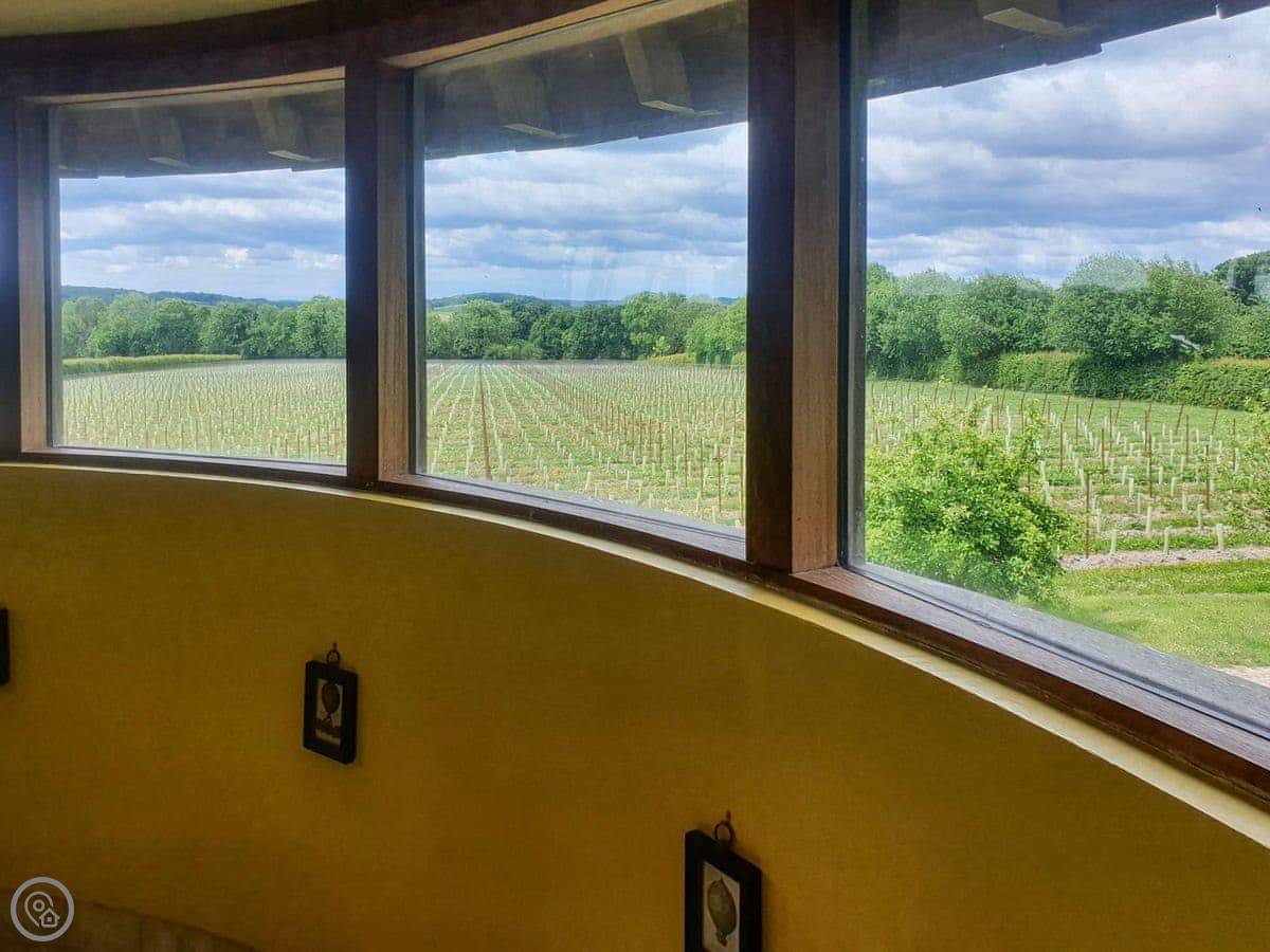 Sleeps two, one bedroom up in the round bit. You get views from that window straight across the vineyard, which is quite nice. Big bathroom downstairs with a jacuzzi bath.