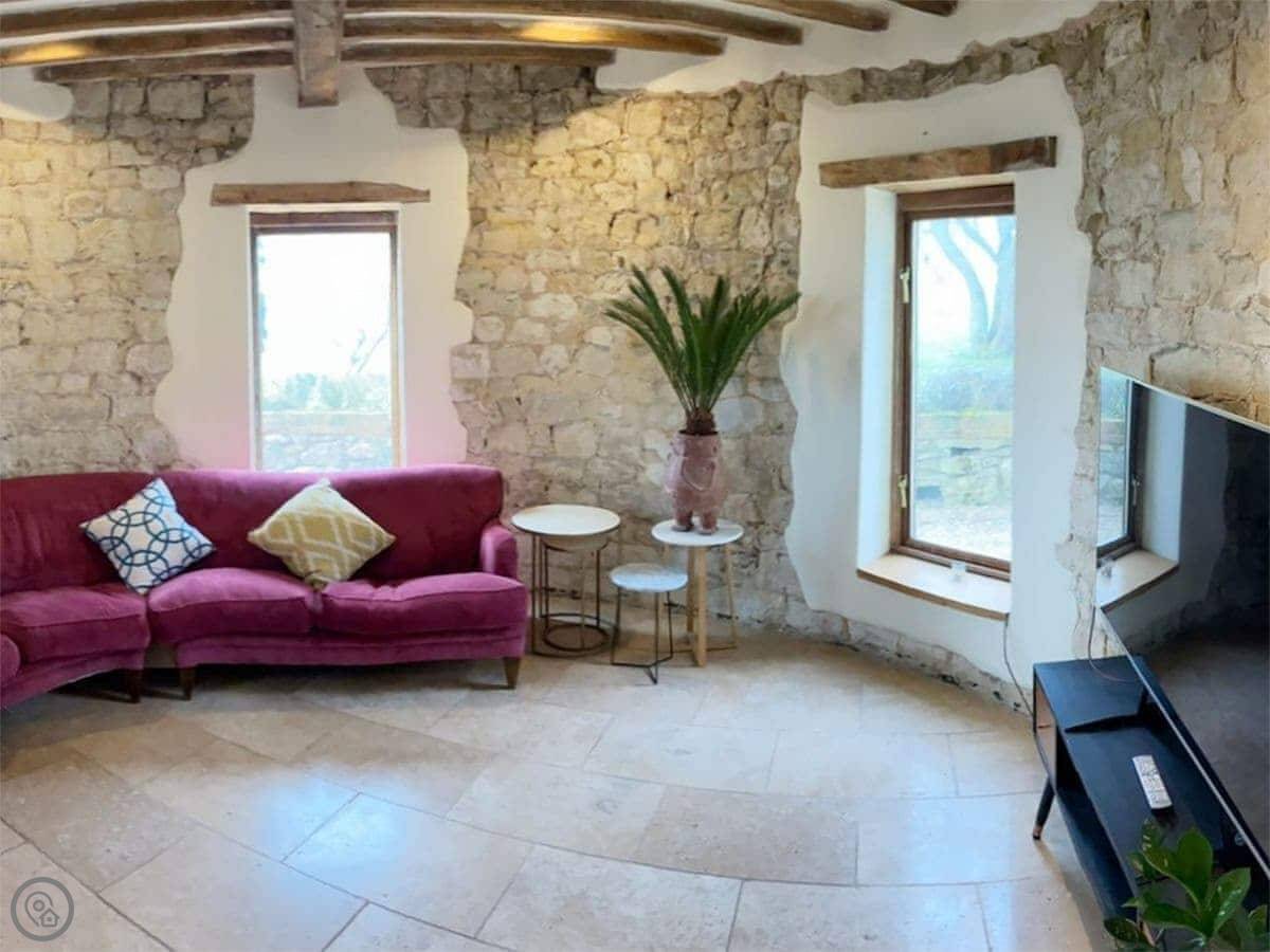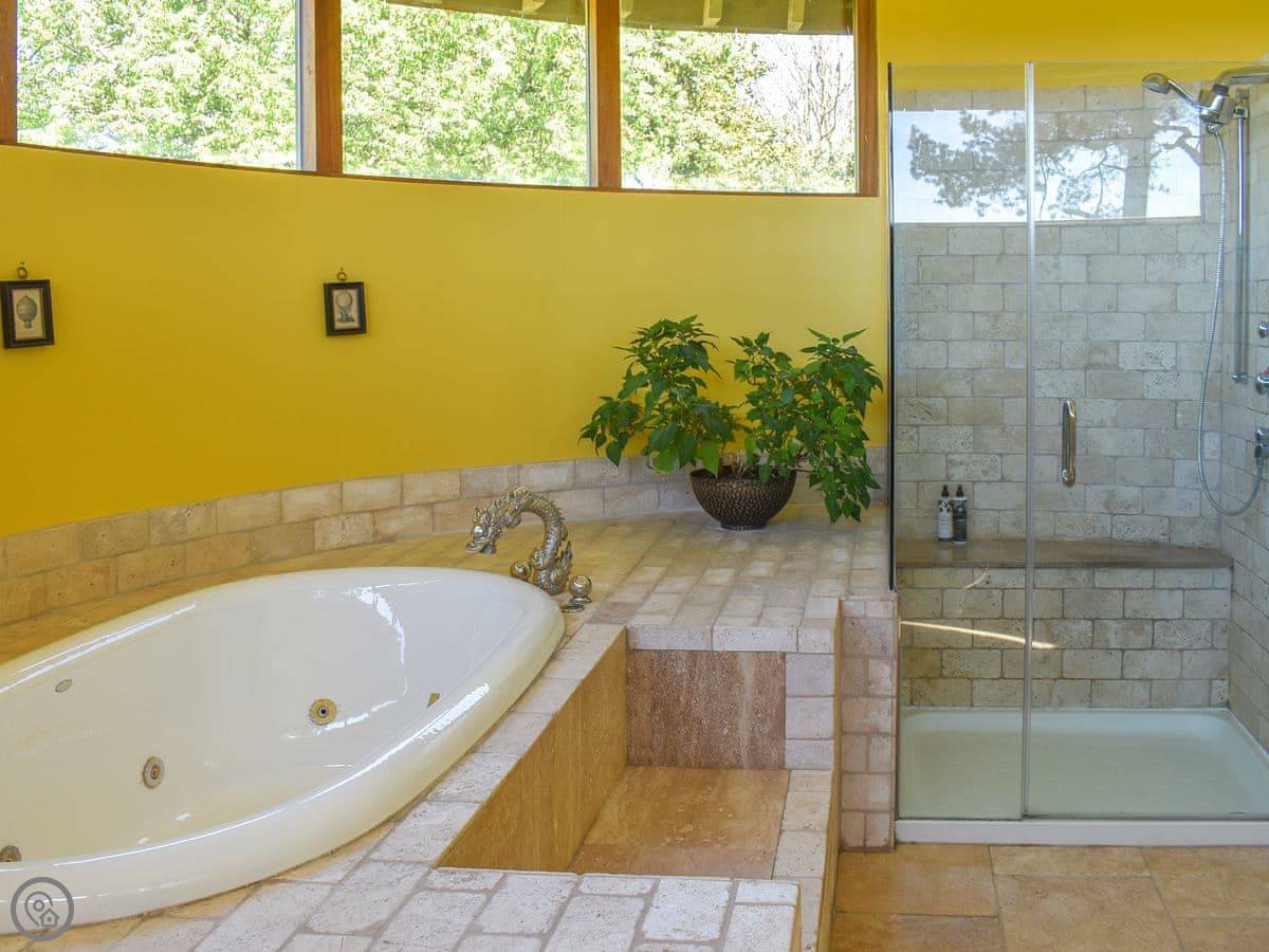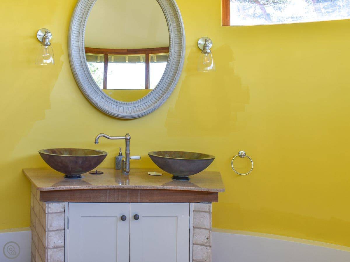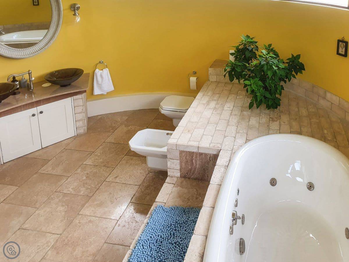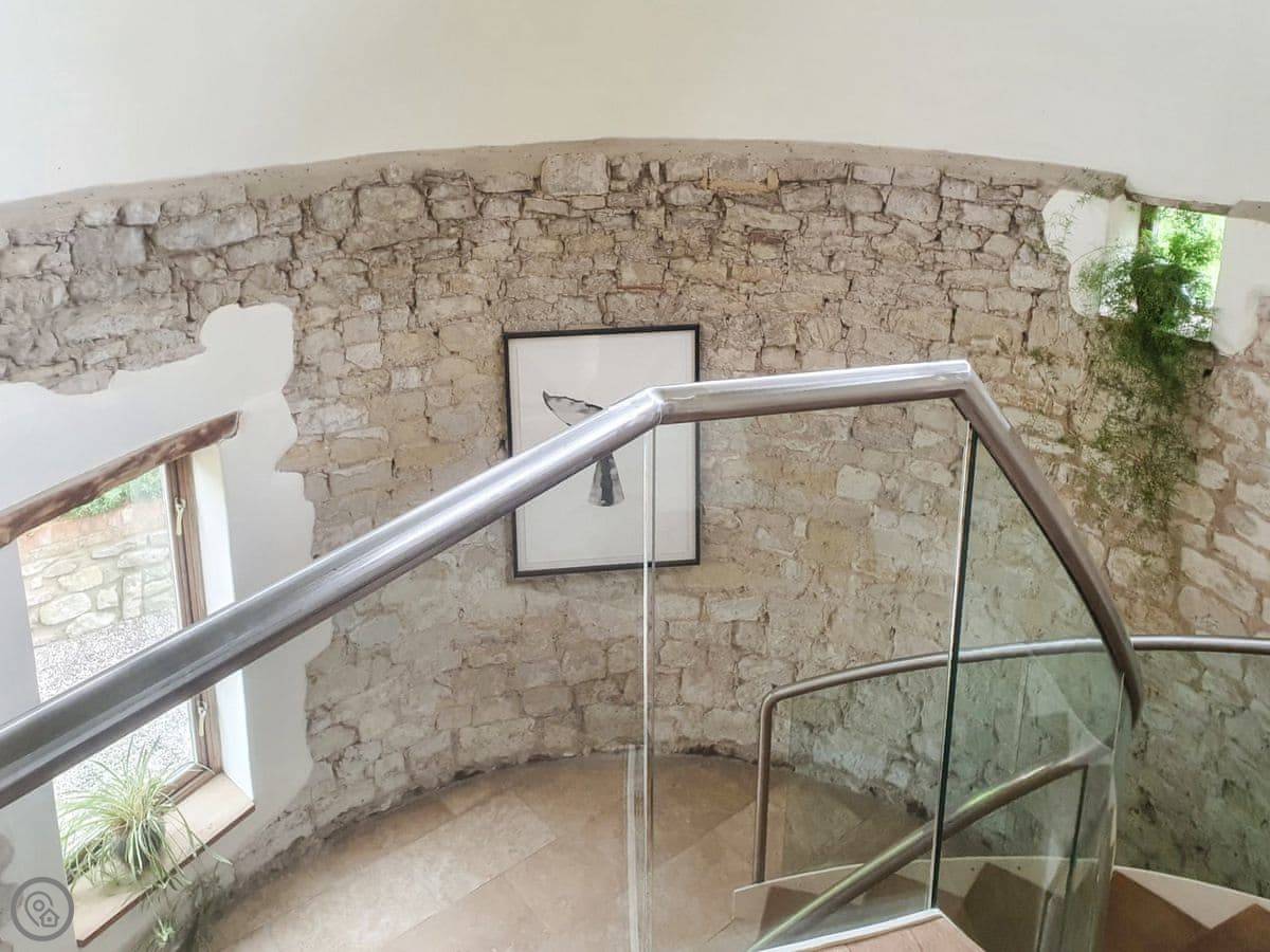 Sleeps two, one bedroom up in the round bit. You get views from that window straight across the vineyard, which is quite nice. Big bathroom downstairs with a jacuzzi bath.
