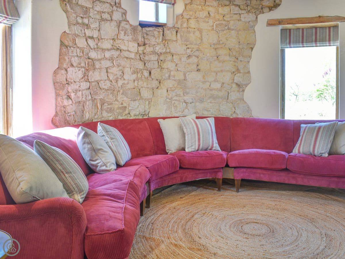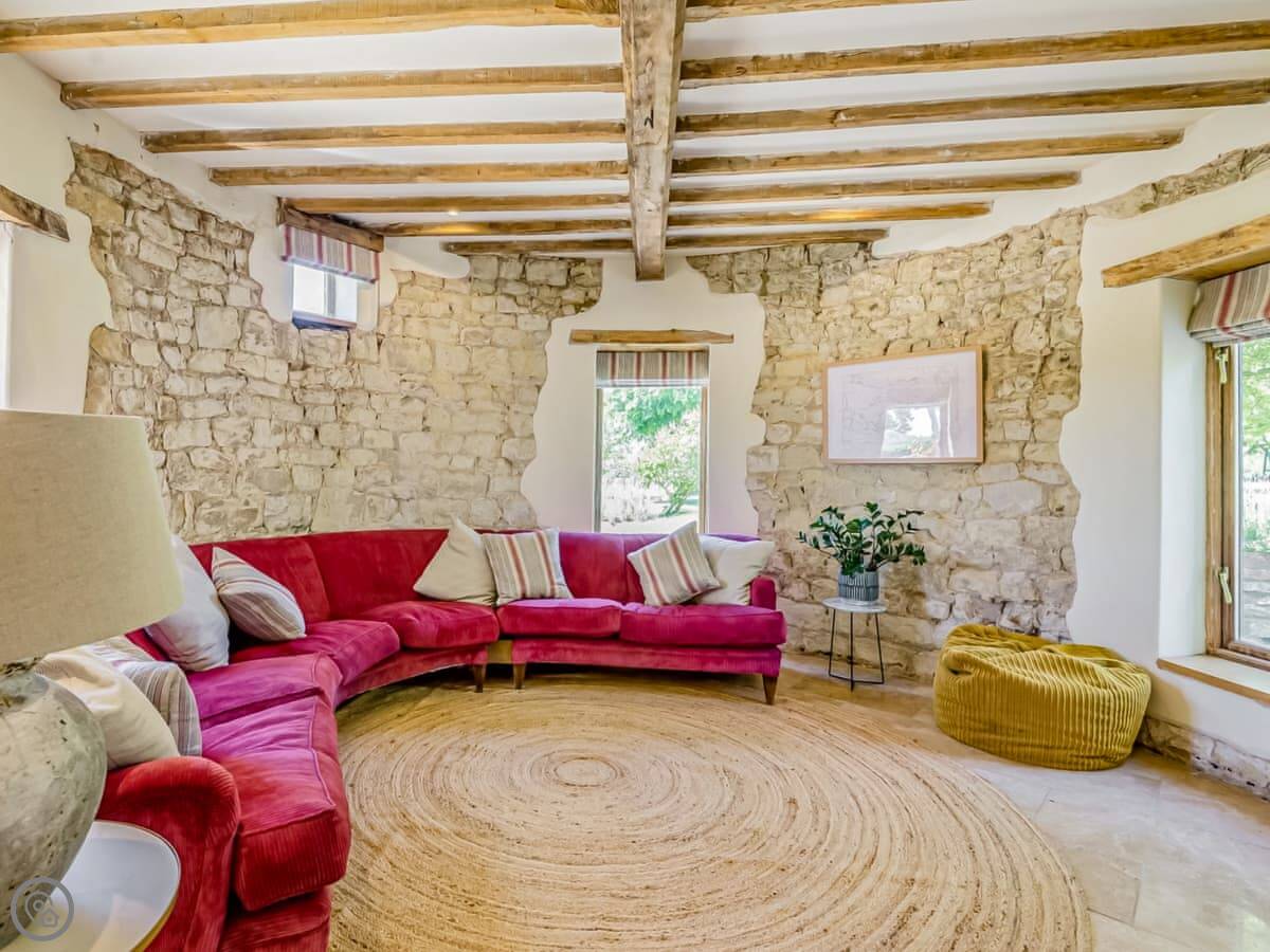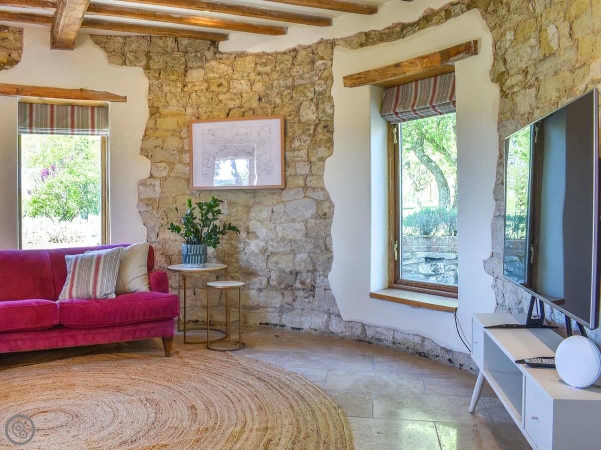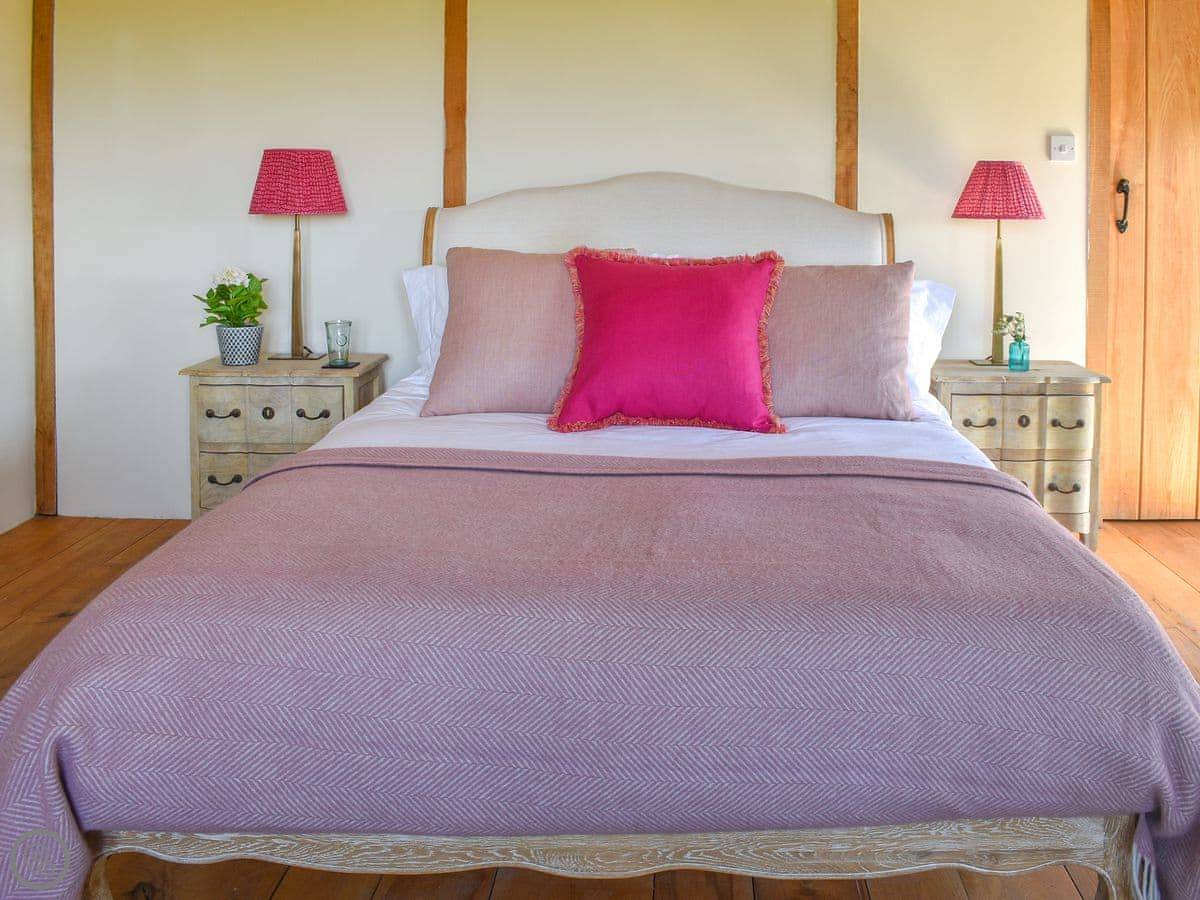Sleeps two, one bedroom up in the round bit. You get views from that window straight across the vineyard, which is quite nice. Big bathroom downstairs with a jacuzzi bath.
