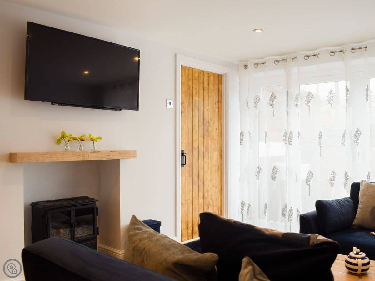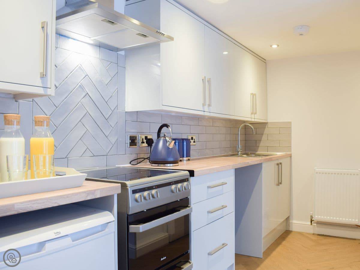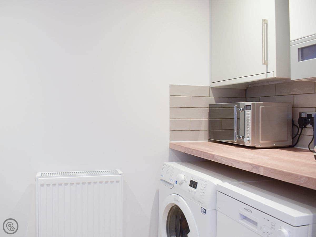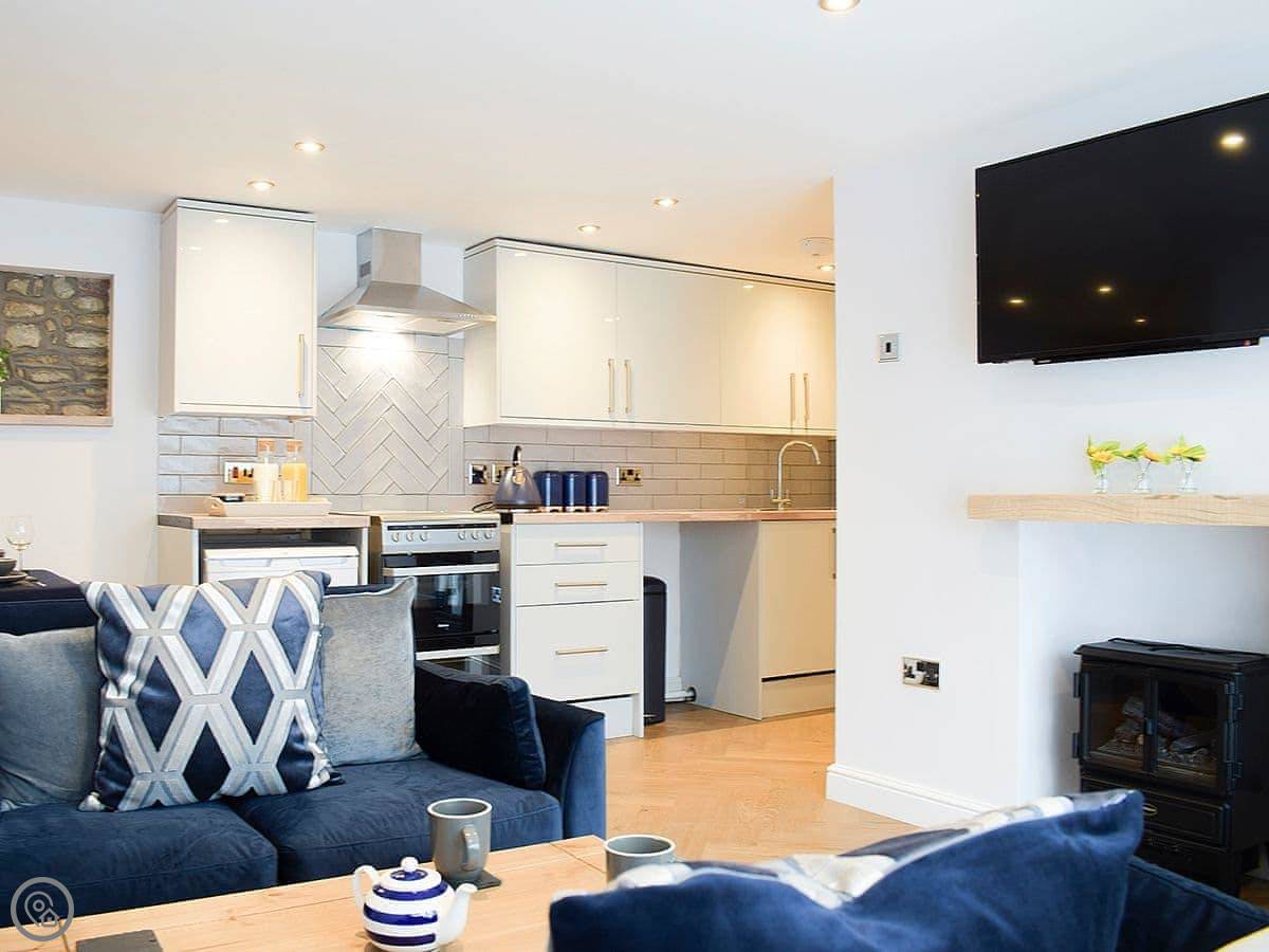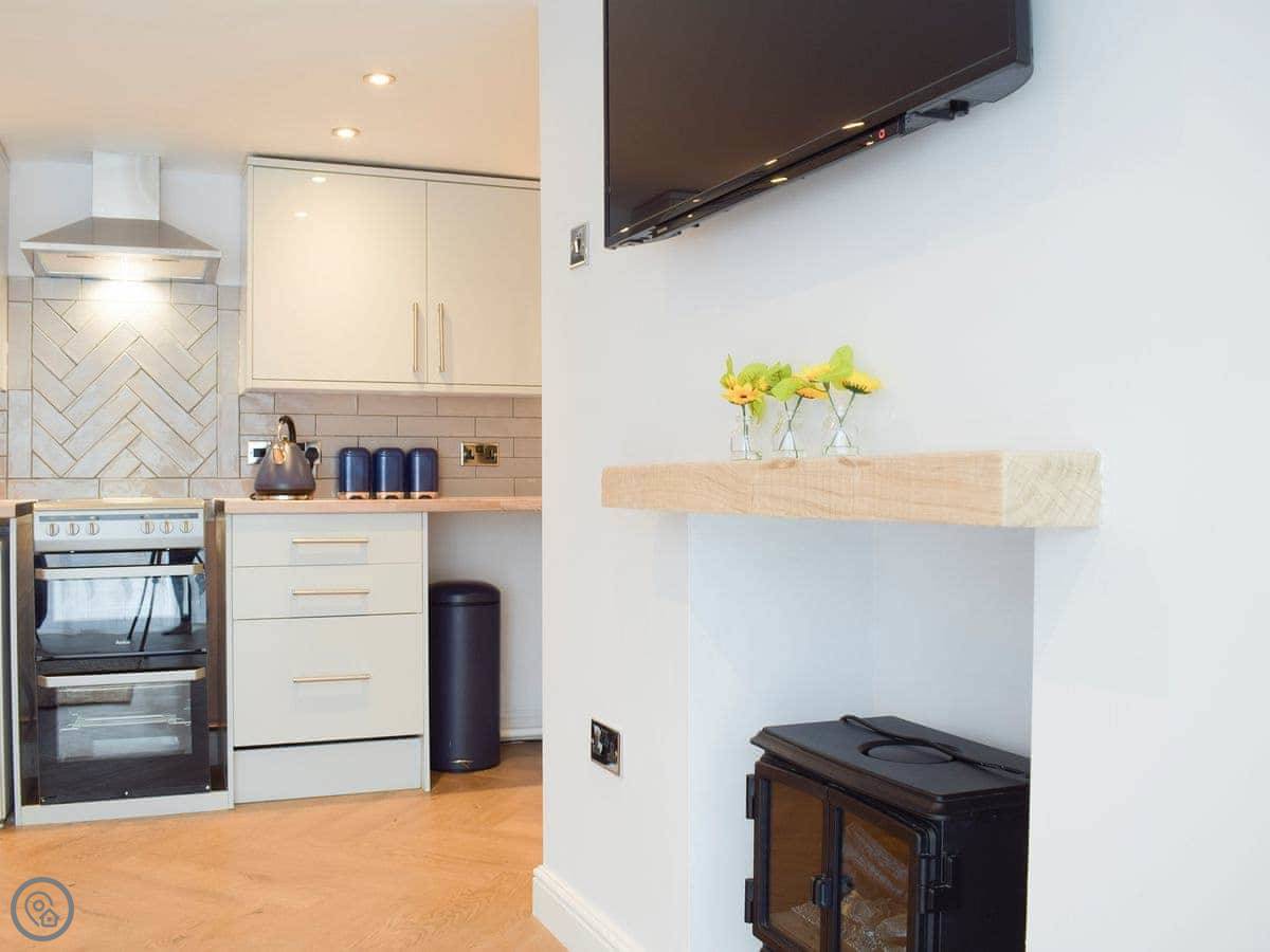 Inside, it's open plan. Kitchen with a dishwasher and washing machine, then the living area. Bedding and towels are included. We can provide a cot and highchair if you need them. There's WiFi and parking right outside.