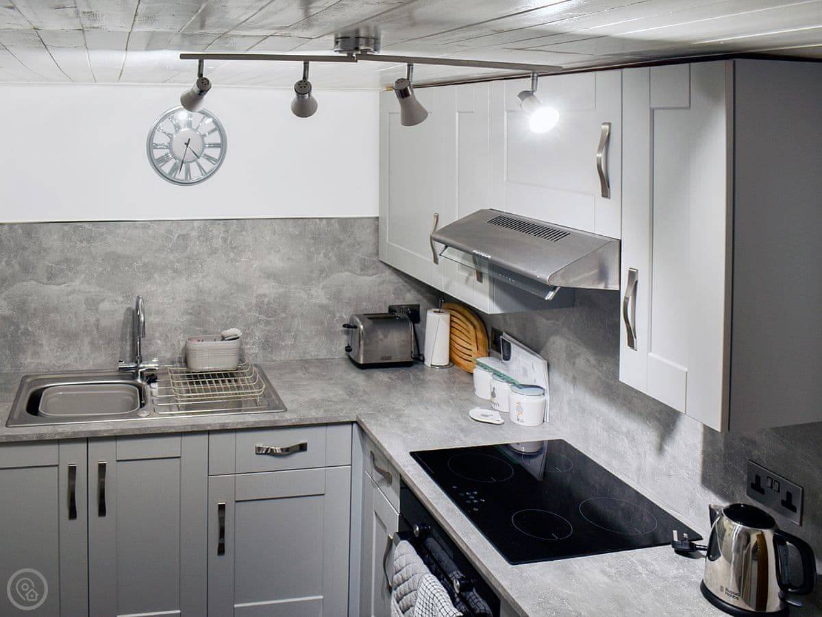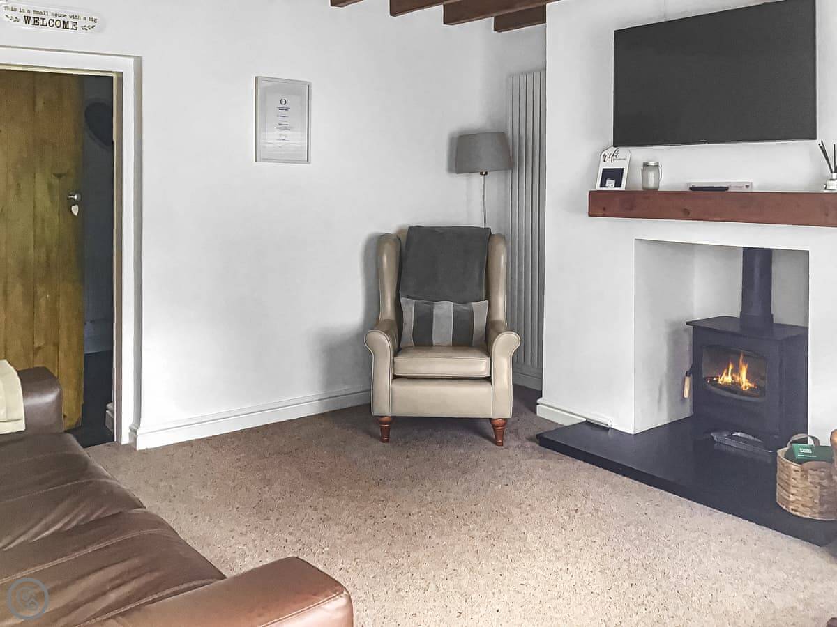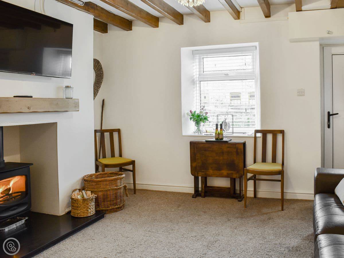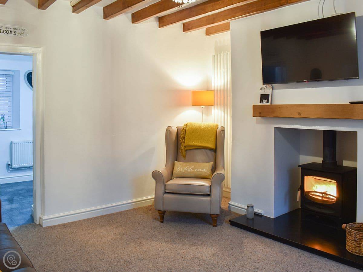 The living room has a wood burner and exposed beams. The stairs are a spiral staircase, so they're a bit tight. Something to be aware of. The kitchen is decent if you want to cook, and there's a utility room at the back. One bathroom with a shower.