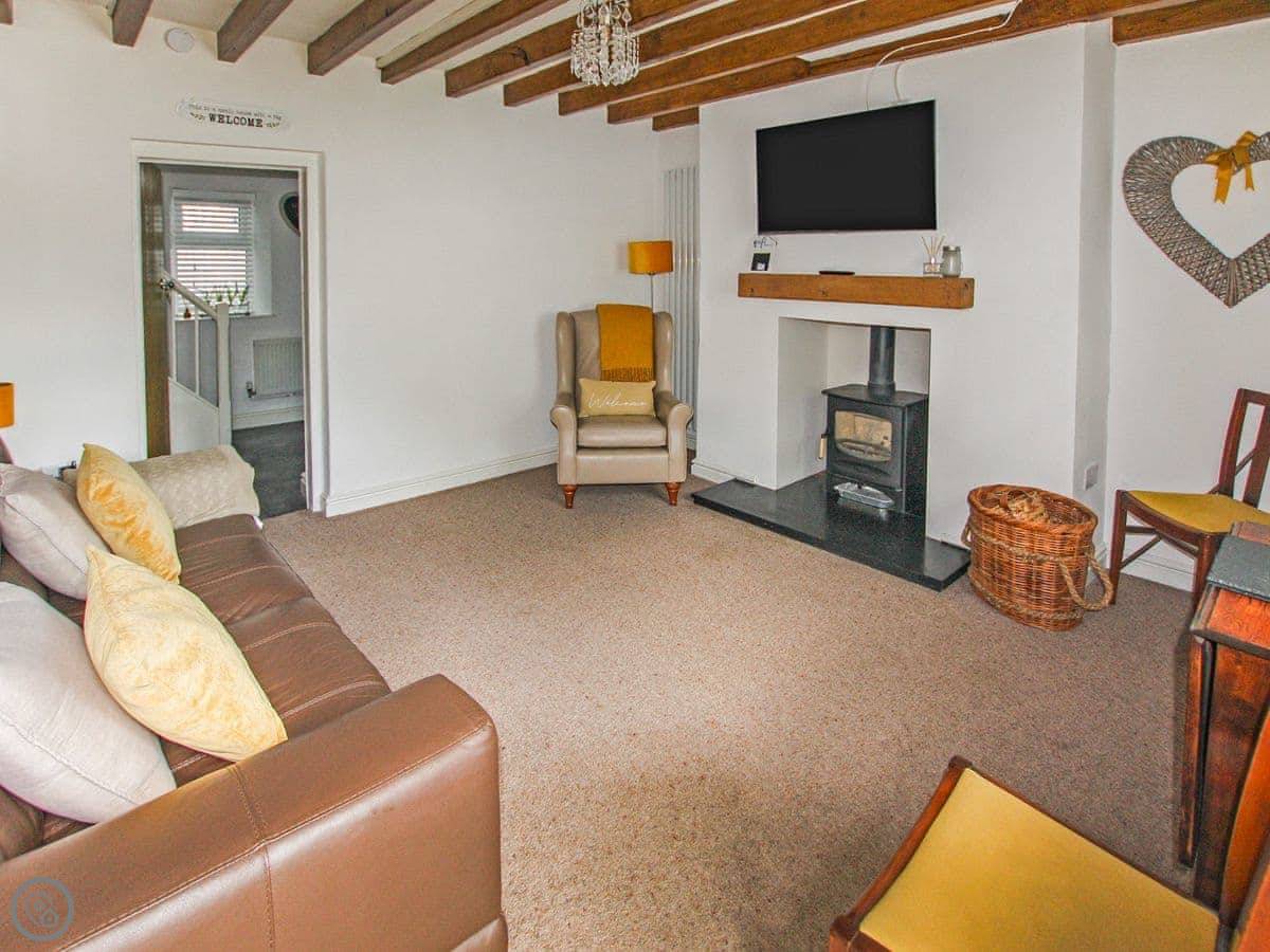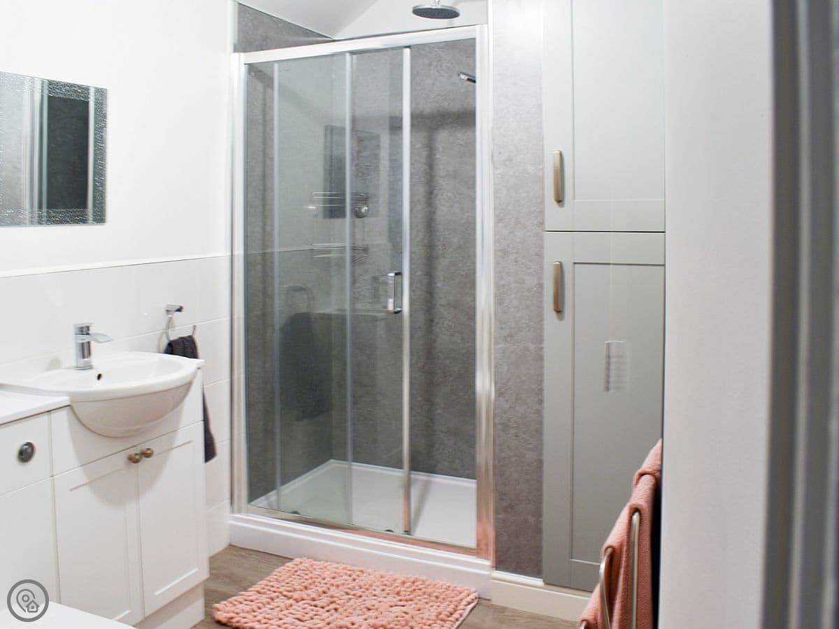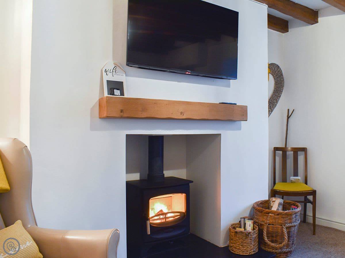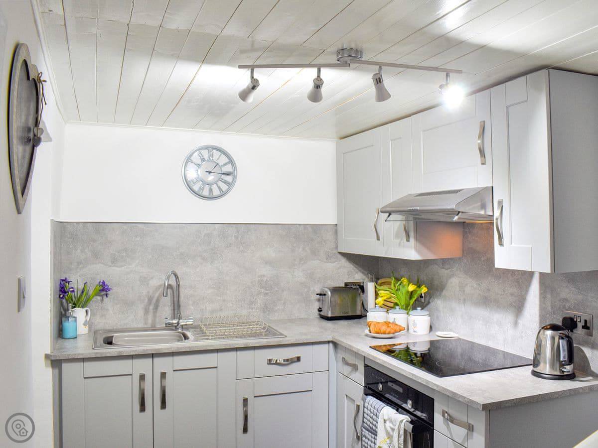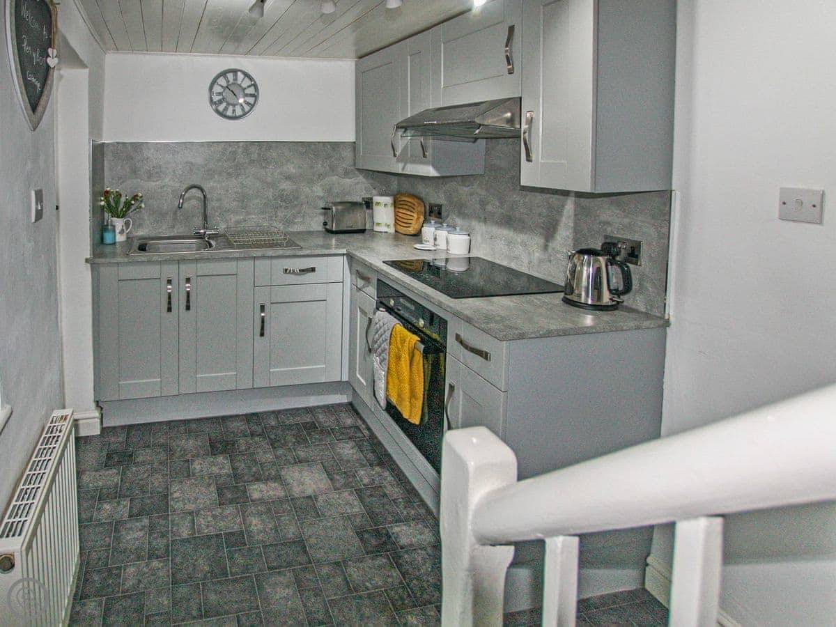 The living room has a wood burner and exposed beams. The stairs are a spiral staircase, so they're a bit tight. Something to be aware of. The kitchen is decent if you want to cook, and there's a utility room at the back. One bathroom with a shower.