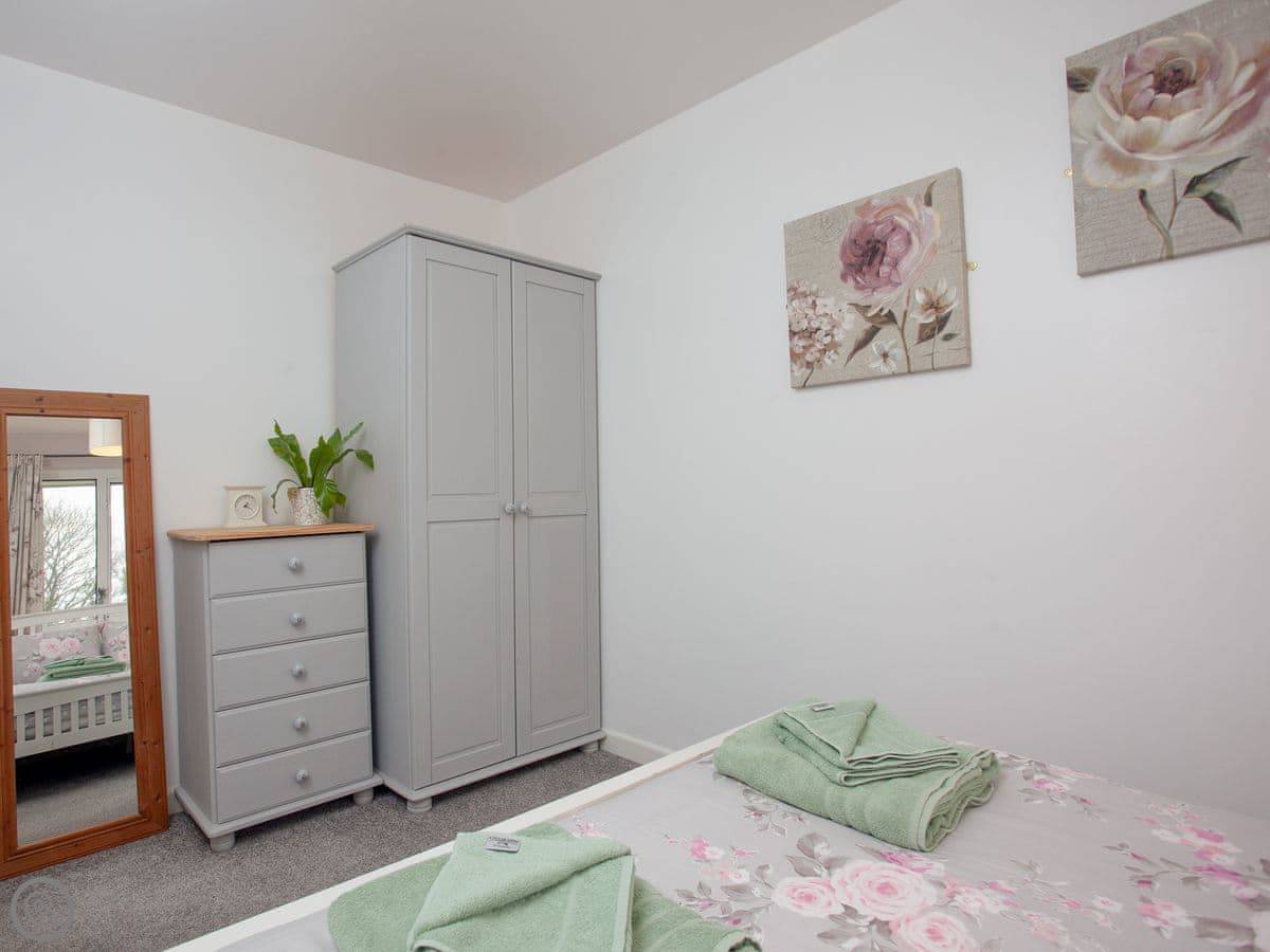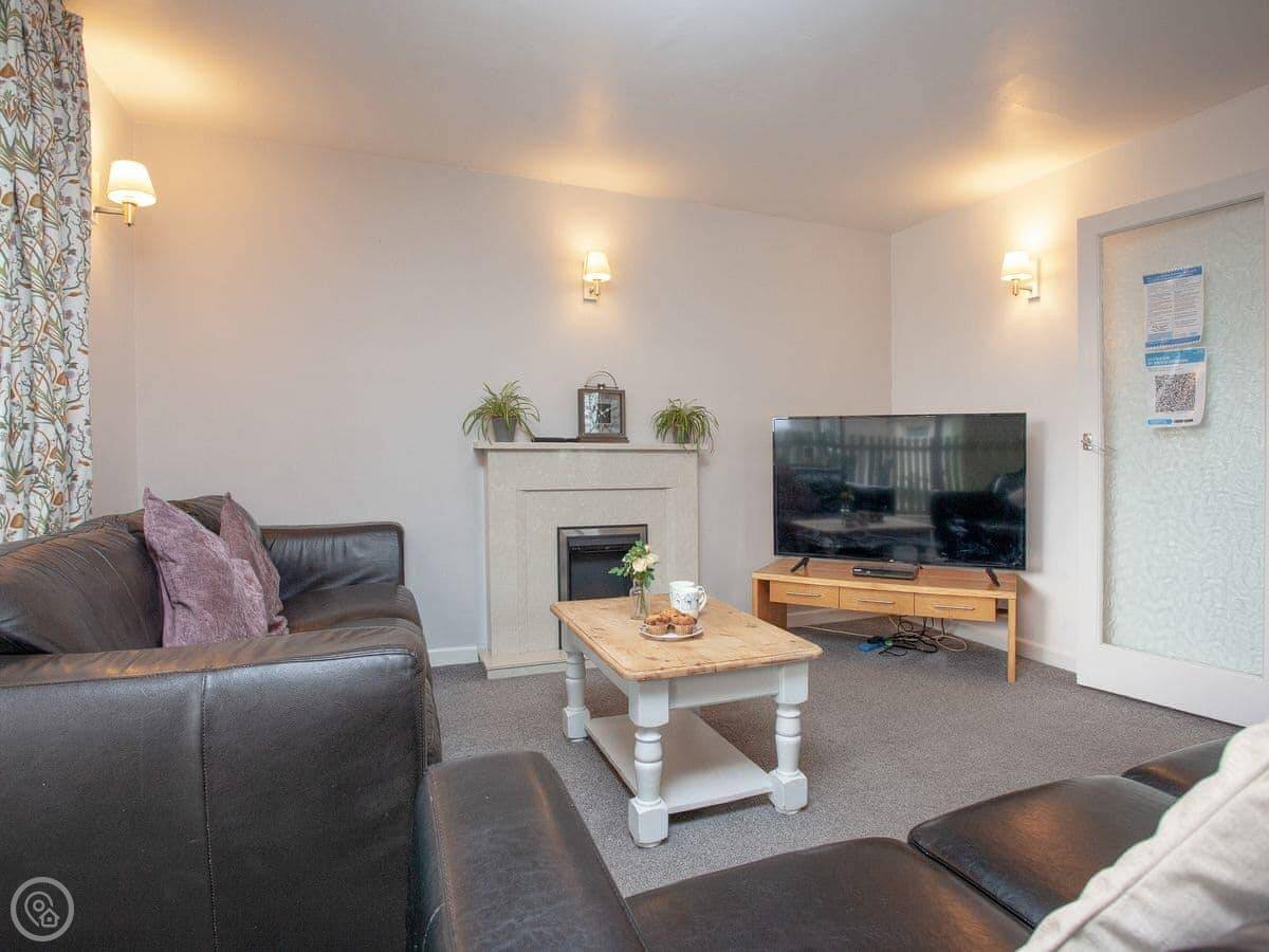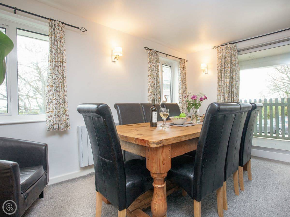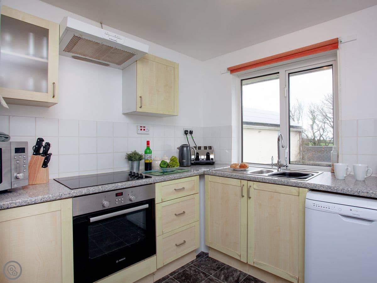Inside, it's open plan. There's a washing machine, a dishwasher, and WiFi. Bedding and towels are included. We've got a cot, highchair, and stairgate if you need them. There's parking right outside. You can bring up to two dogs.