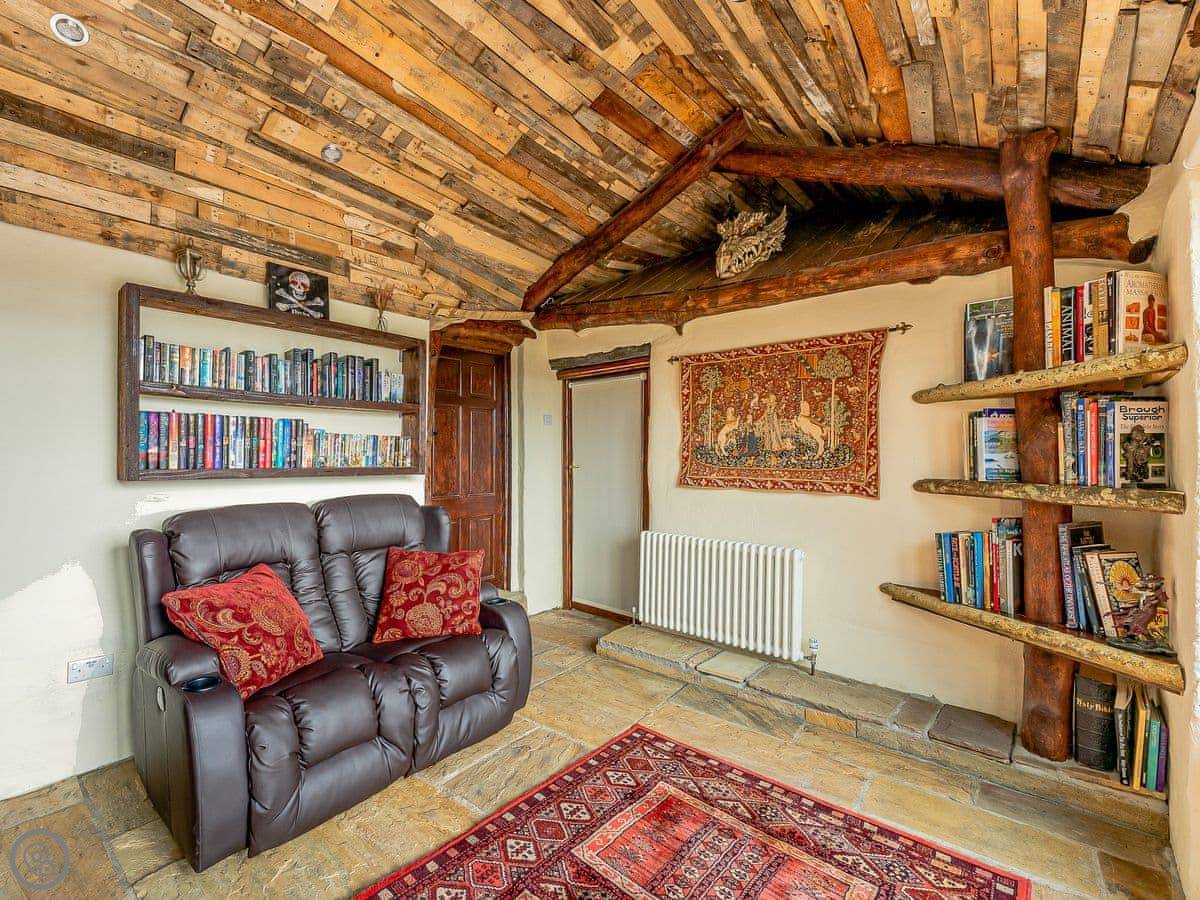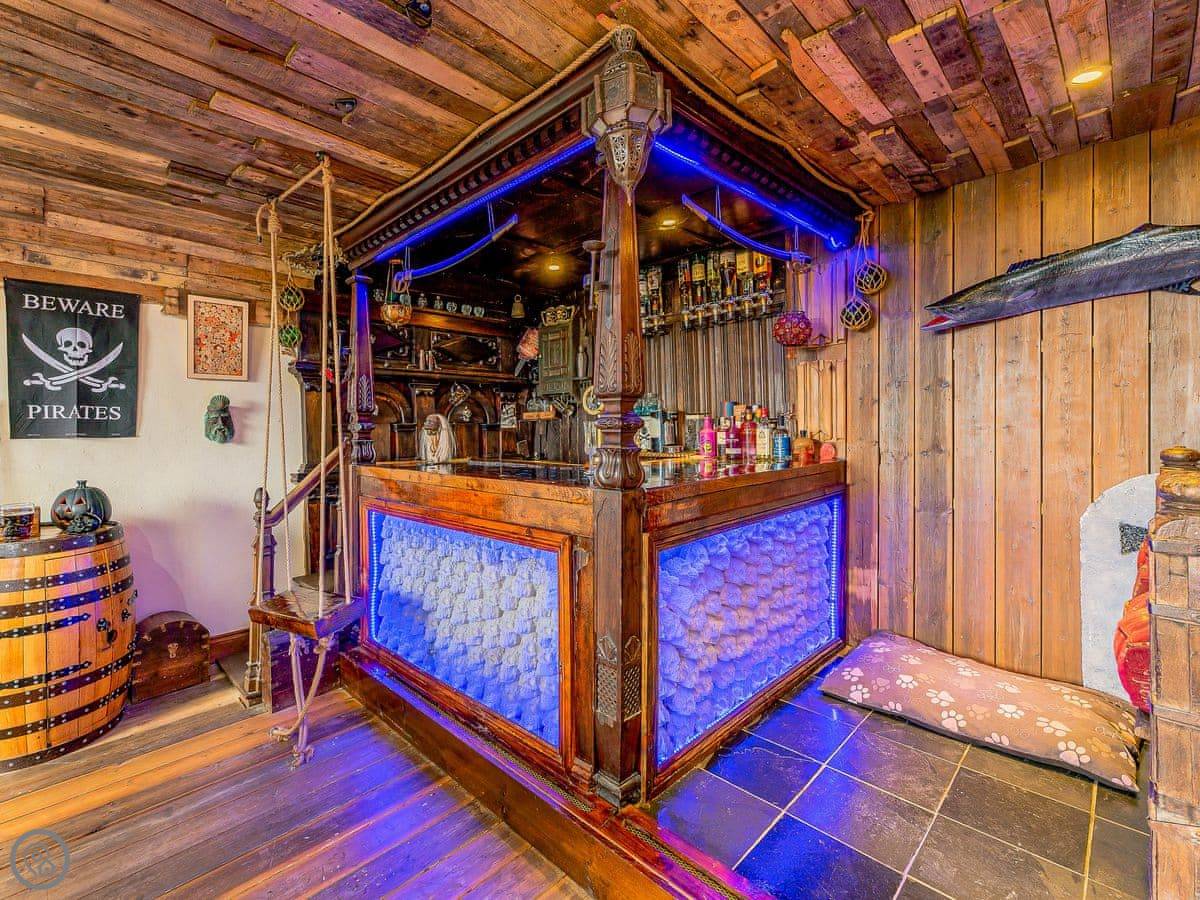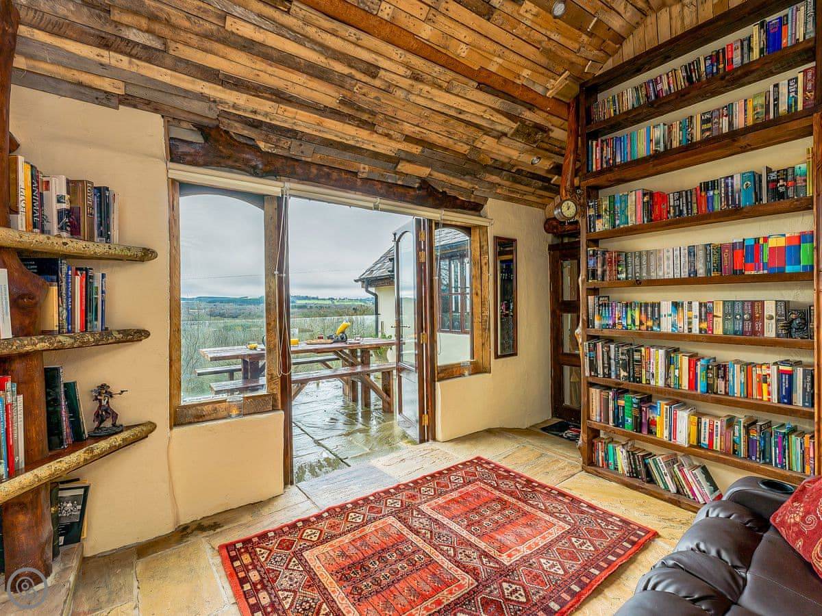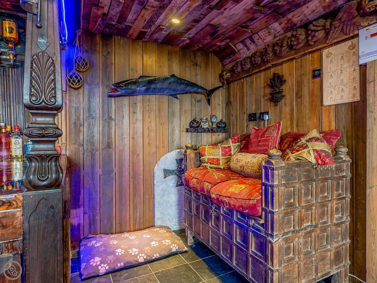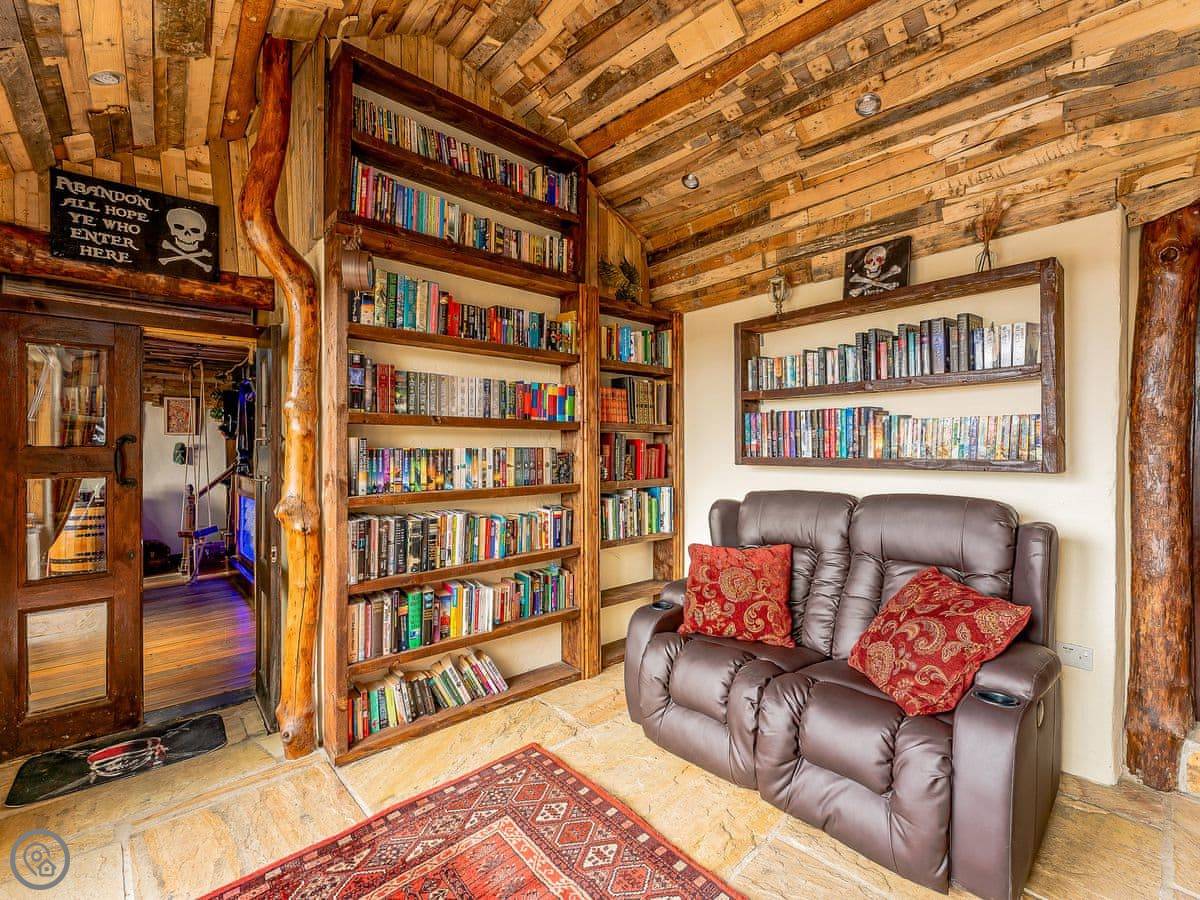 As you enter the front door, there is a bathroom on the ground floor with a shower cubicle and a double bath. A double bedroom with a bespoke handmade kingsize bed is to the right up a staircase. To the left side of the property, there is an open plan living and kitchen space that houses an 85” Smart TV, sound systems and games console. The kitchen has an American fridge/freezer, dishwasher, washing machine, electric range cooker, and tumble dryer. There is a fabulous mezzanine with a custom handmade four poster bed. The library leads onto the south-facing private terrace area overlooking the valley, has a superb seating area for relaxing in the sun and watching the sunset; the perfect spot for watching the kites and buzzards feeding! Following the library is a sizeable nautical-themed bar with a full-size pool table, Smart TV, and sound system . There is also a mezzanine bedroom with a double bed – access to this is via an external staircase.