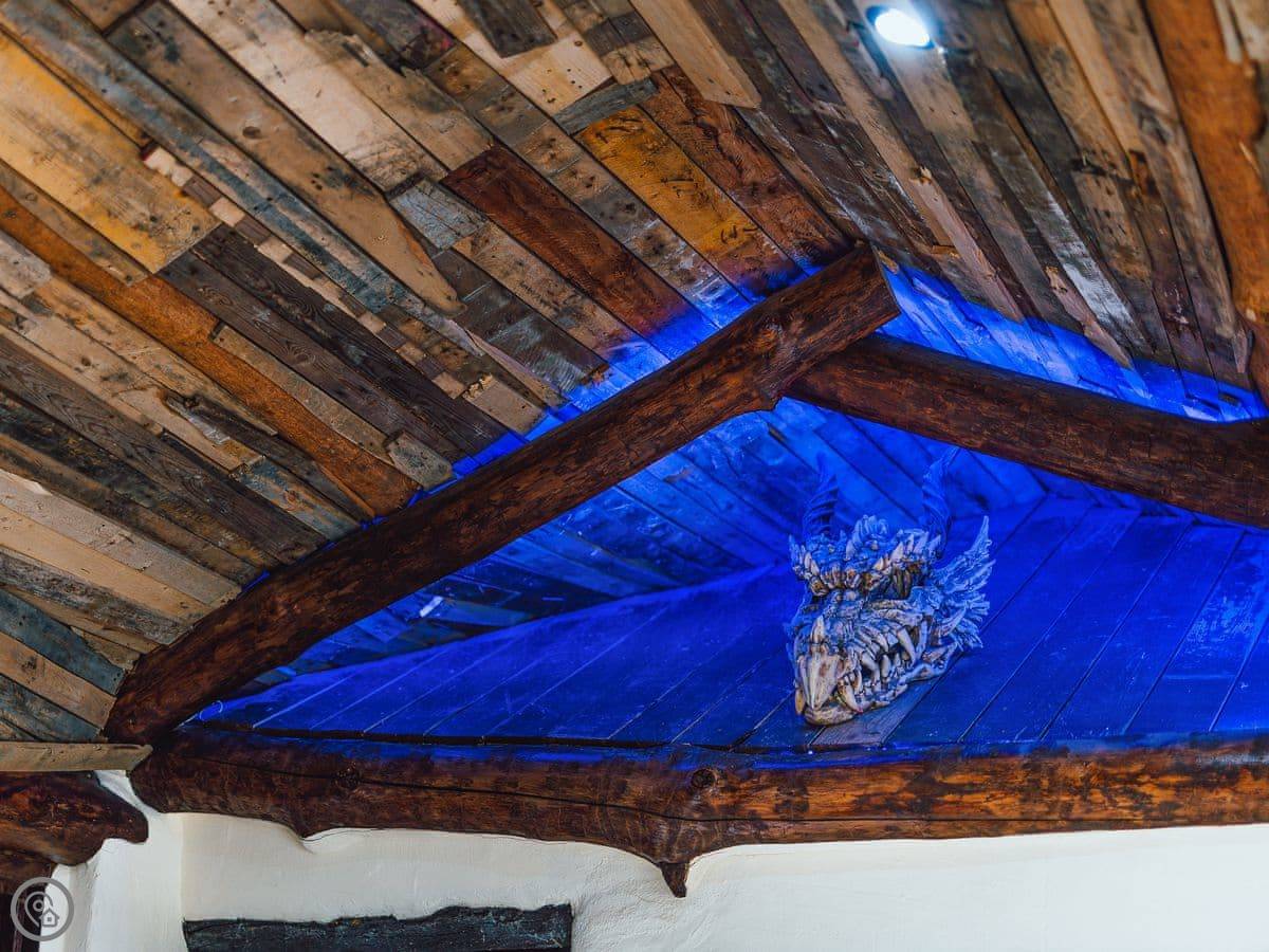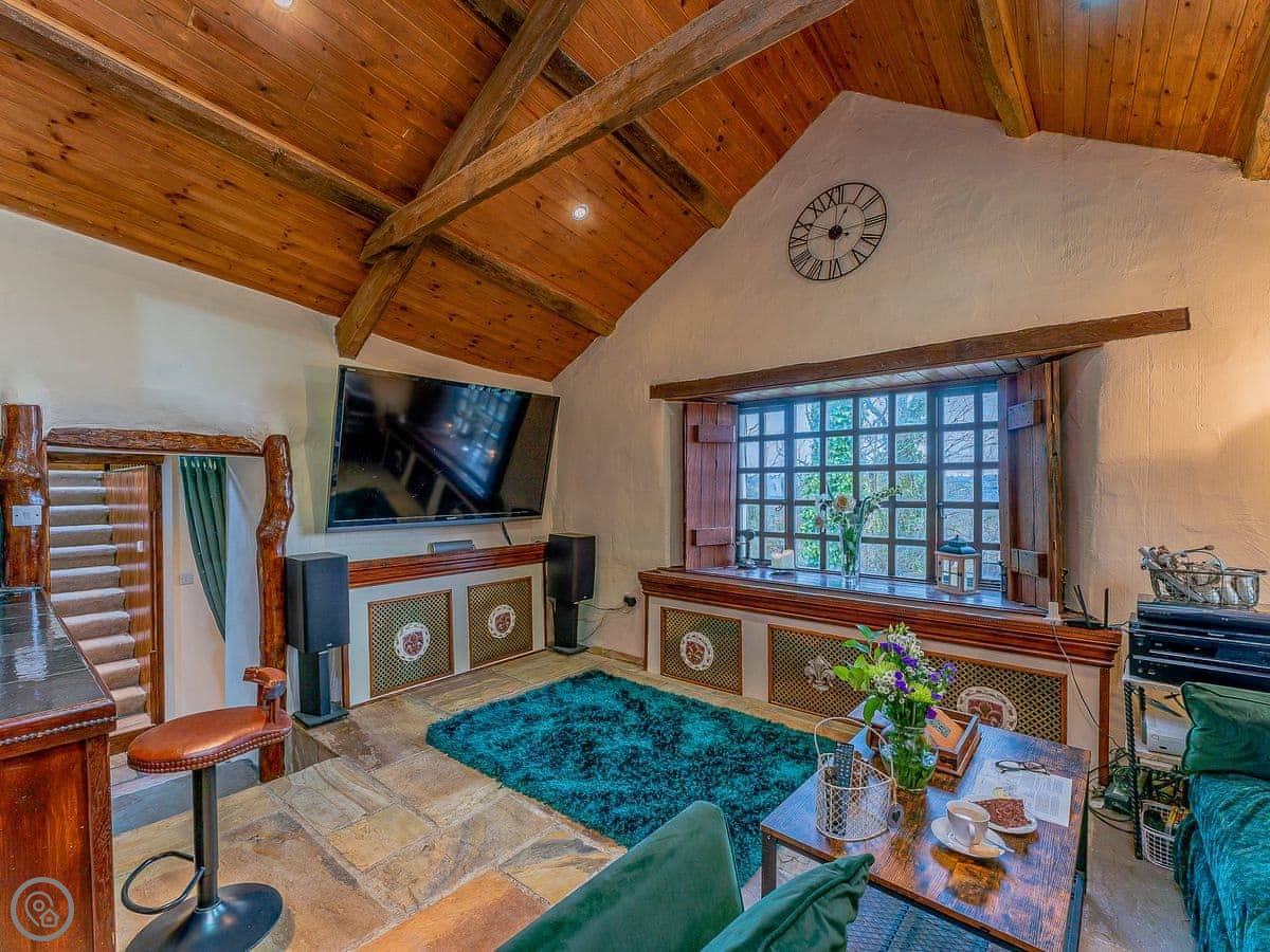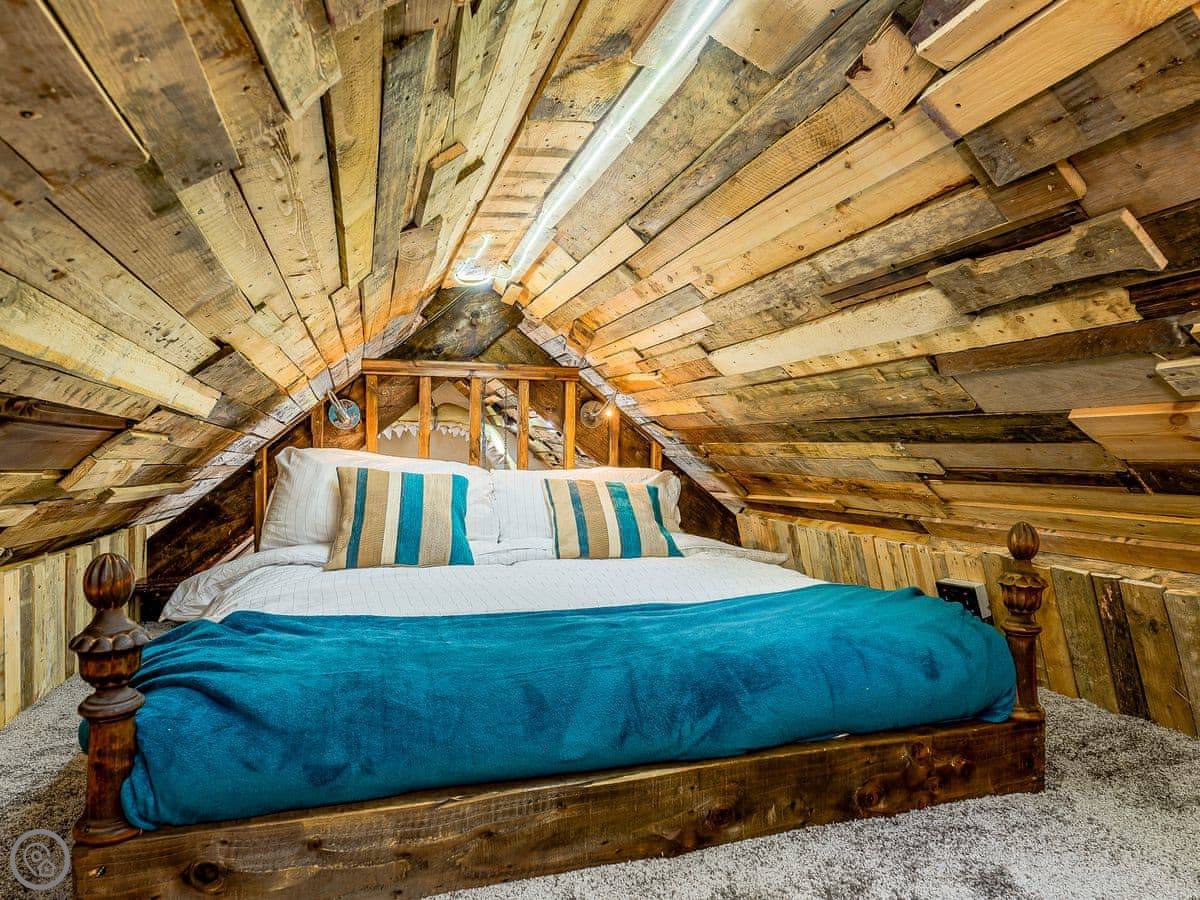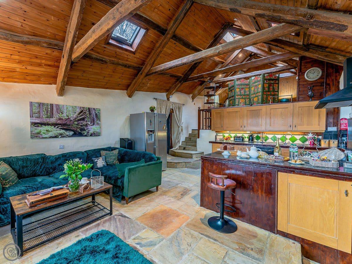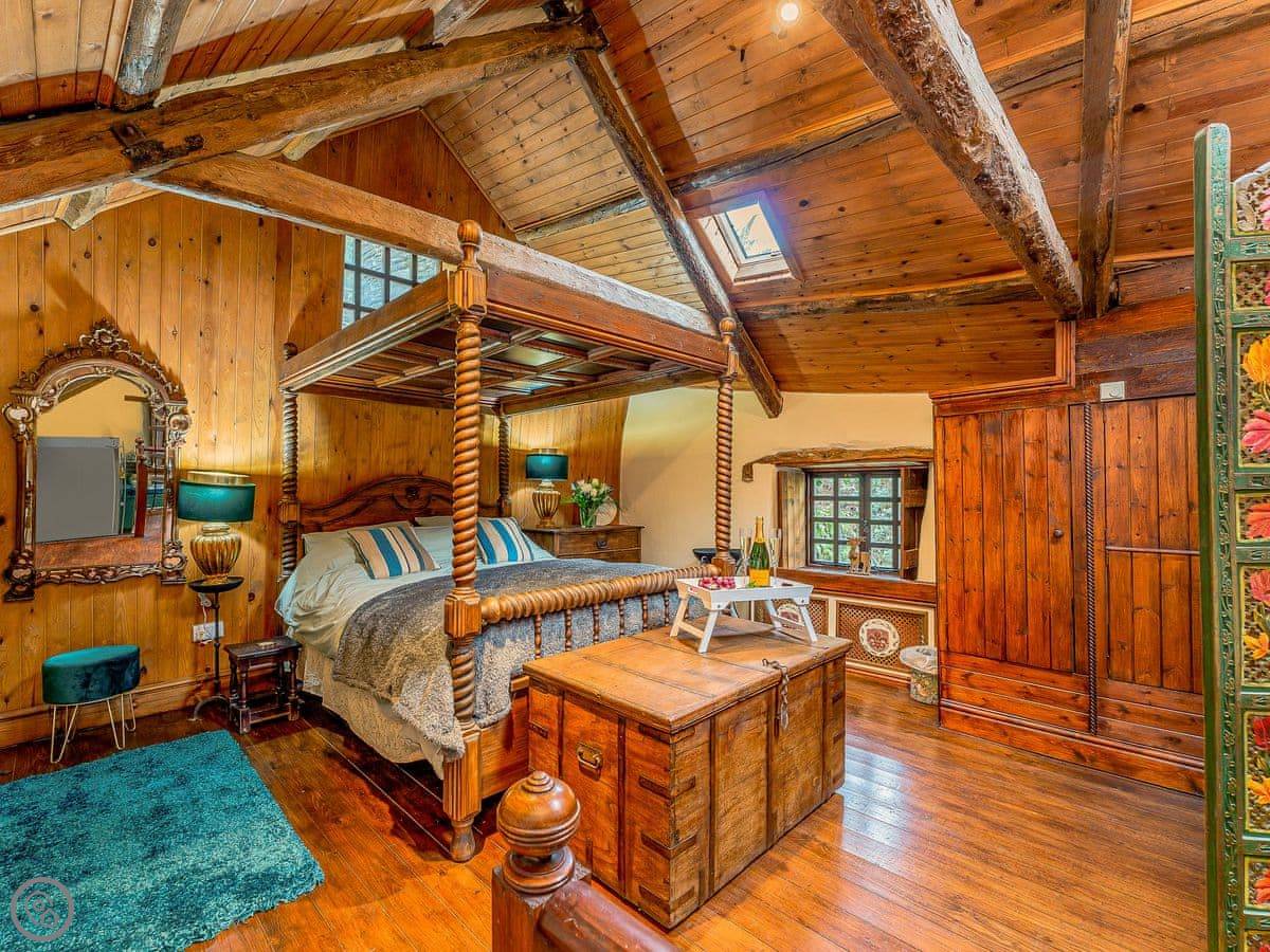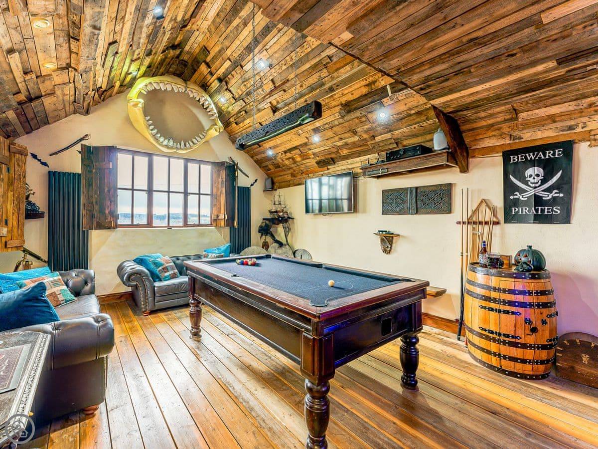 As you enter the front door, there is a bathroom on the ground floor with a shower cubicle and a double bath. A double bedroom with a bespoke handmade kingsize bed is to the right up a staircase. To the left side of the property, there is an open plan living and kitchen space that houses an 85” Smart TV, sound systems and games console. The kitchen has an American fridge/freezer, dishwasher, washing machine, electric range cooker, and tumble dryer. There is a fabulous mezzanine with a custom handmade four poster bed. The library leads onto the south-facing private terrace area overlooking the valley, has a superb seating area for relaxing in the sun and watching the sunset; the perfect spot for watching the kites and buzzards feeding! Following the library is a sizeable nautical-themed bar with a full-size pool table, Smart TV, and sound system . There is also a mezzanine bedroom with a double bed – access to this is via an external staircase.