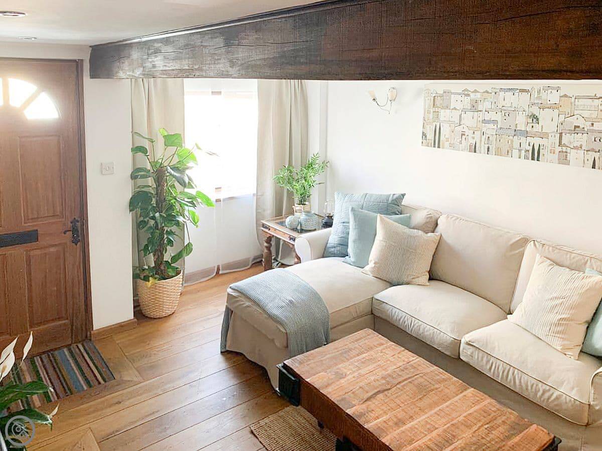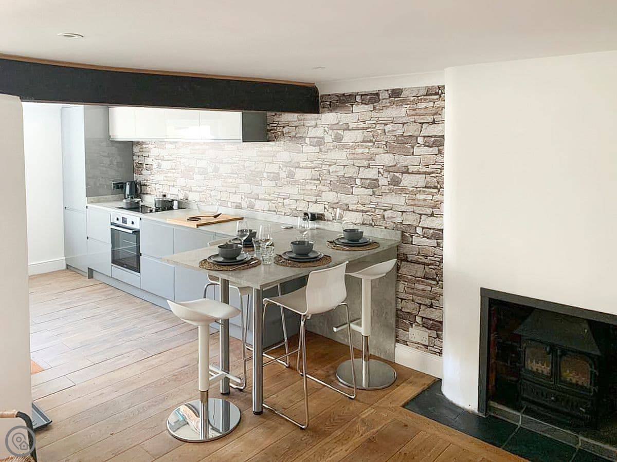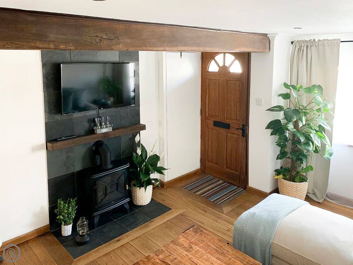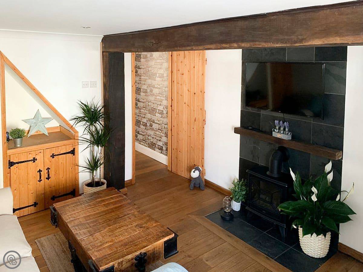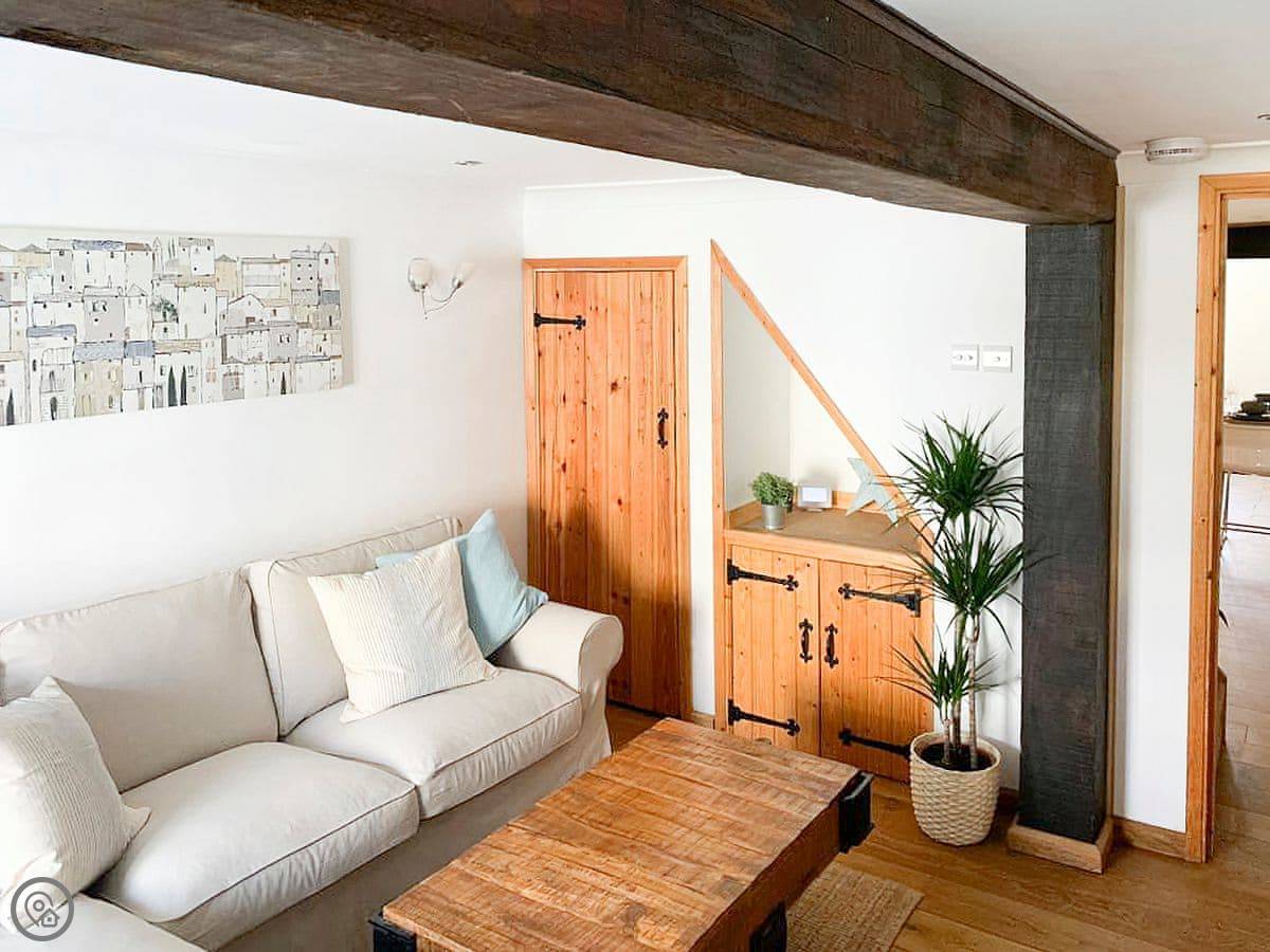 This semi-detached cottage has been beautifully designed and has a separate living room with a large, widescreen television and a feature fireplace with an electric wood burner, perfect for relaxing in front of after a busy day. The modern kitchen has a large breakfast bar and a nice seating area, with everything you need for a self-catering break. If you don’t fancy cooking while you are away, then you can enjoy one of the many take-out restaurants the town has to offer. The characterful old staircase to the first floor is steep, open-sided and has only a handrail to one side and leads to the bedroom, with a queensize bed and lovely Juliet balcony, which is perfect for letting a gentle breeze in during the summer months; it also offers sea views in the distance. The bathroom offers a roll-top bath, perfect for relaxing in with a glass of wine, but also has a shower over if you prefer.