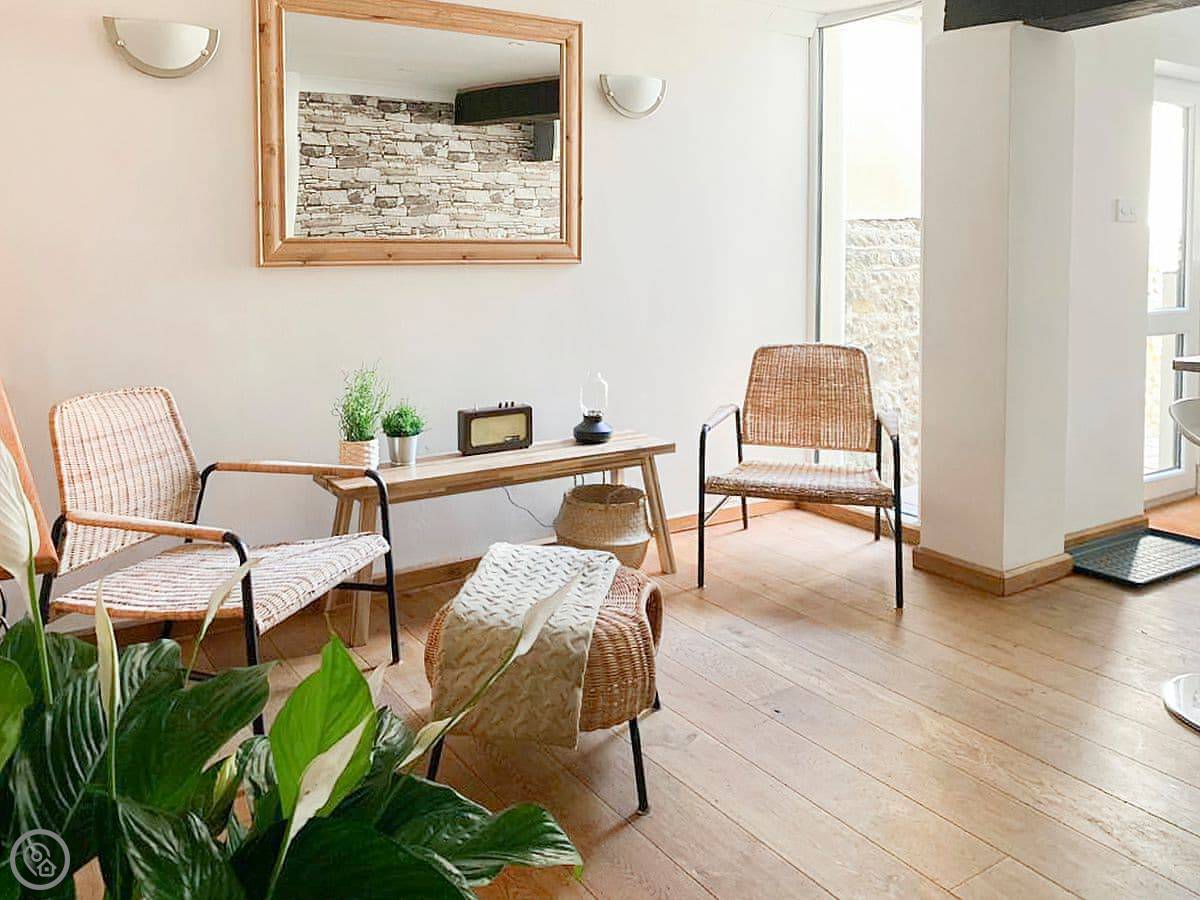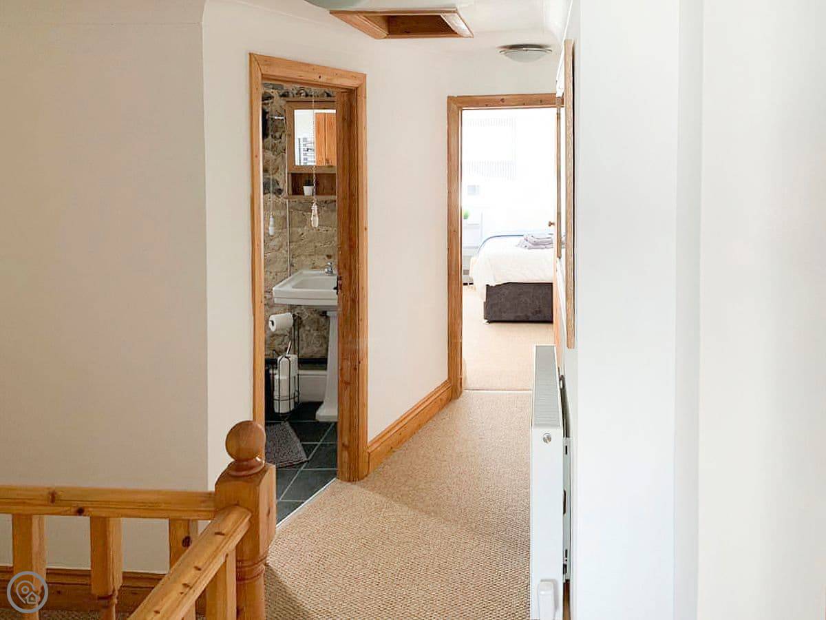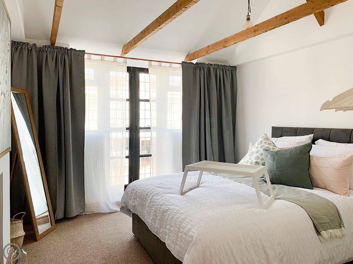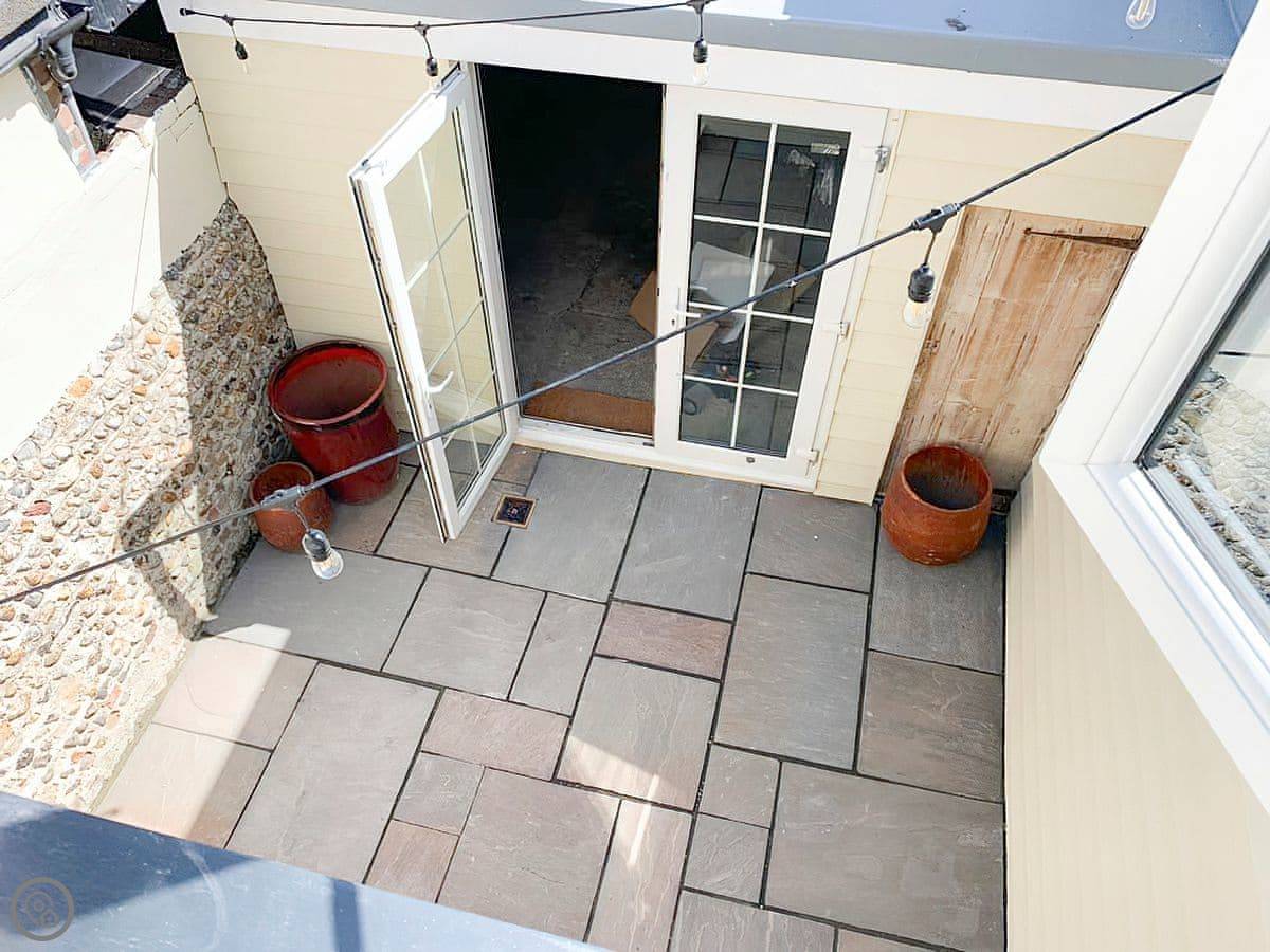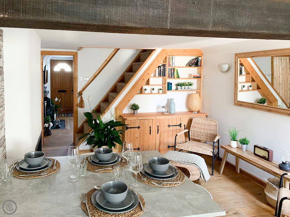 This semi-detached cottage has been beautifully designed and has a separate living room with a large, widescreen television and a feature fireplace with an electric wood burner, perfect for relaxing in front of after a busy day. The modern kitchen has a large breakfast bar and a nice seating area, with everything you need for a self-catering break. If you don’t fancy cooking while you are away, then you can enjoy one of the many take-out restaurants the town has to offer. The characterful old staircase to the first floor is steep, open-sided and has only a handrail to one side and leads to the bedroom, with a queensize bed and lovely Juliet balcony, which is perfect for letting a gentle breeze in during the summer months; it also offers sea views in the distance. The bathroom offers a roll-top bath, perfect for relaxing in with a glass of wine, but also has a shower over if you prefer.