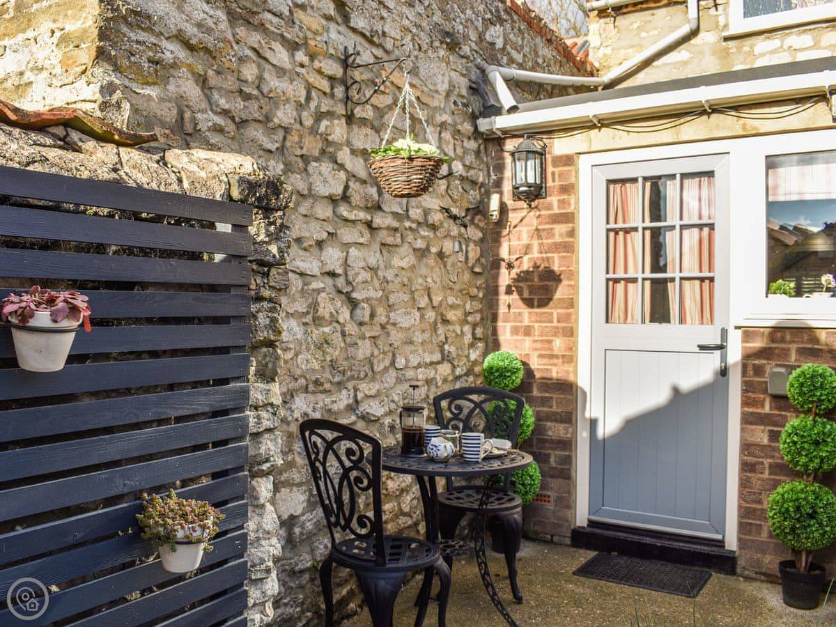 Outside, there's a parking bay. The access lane is narrow, so big cars might struggle. There's a bike shed and a little seating area with a table for two.