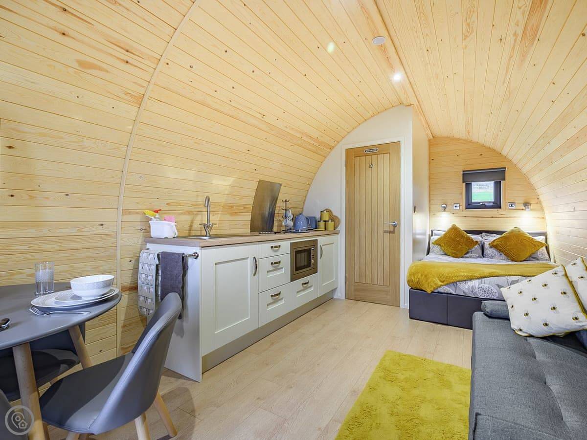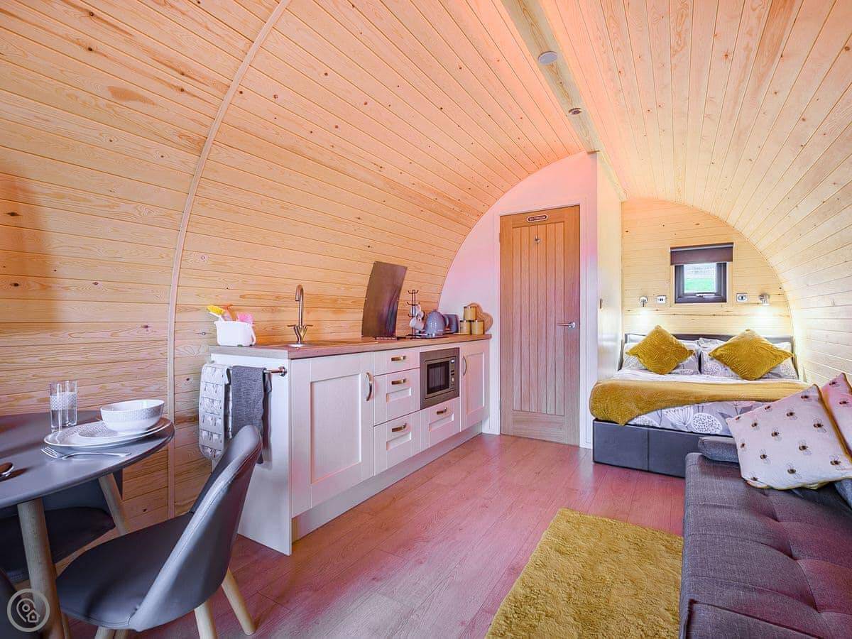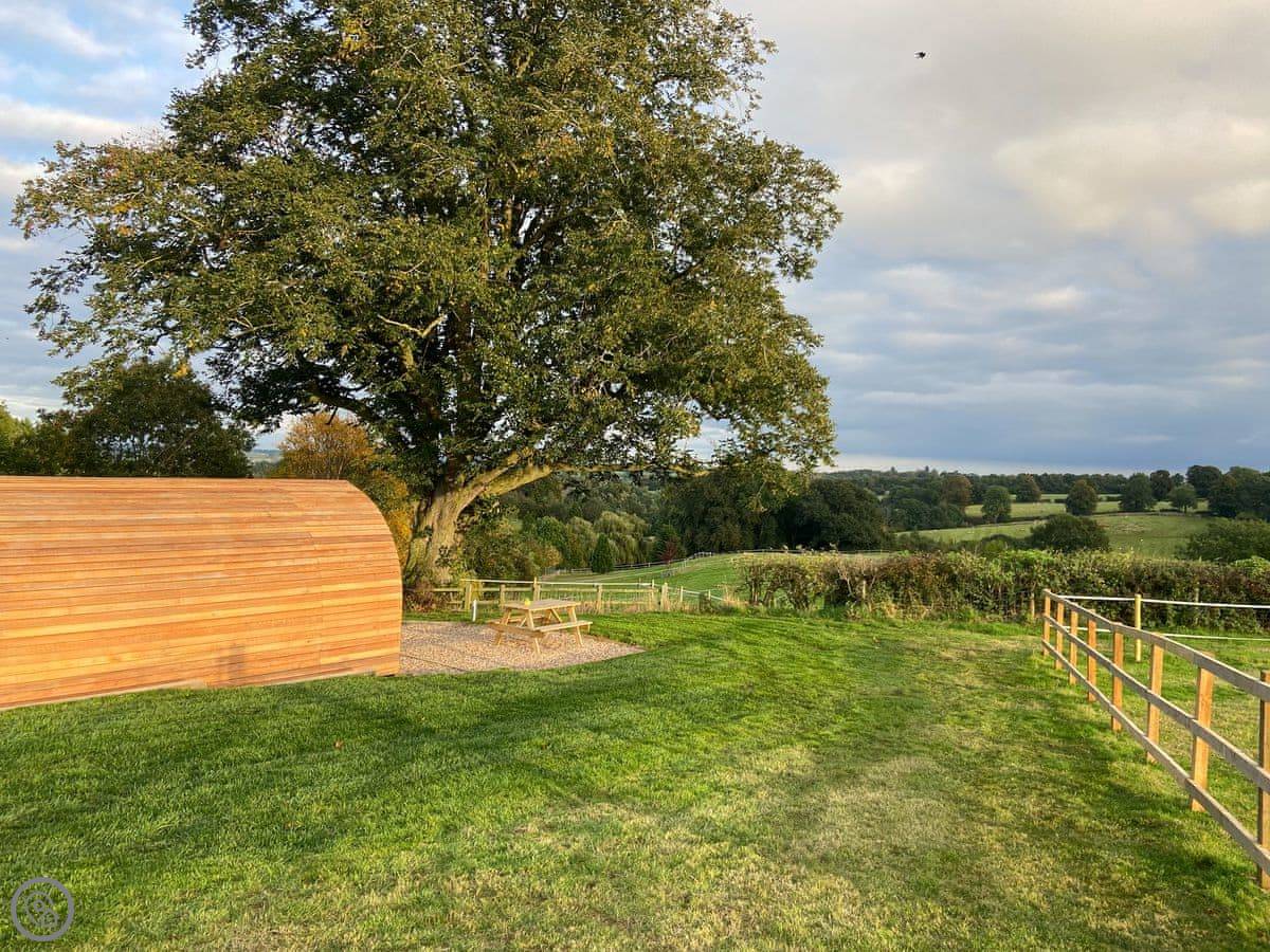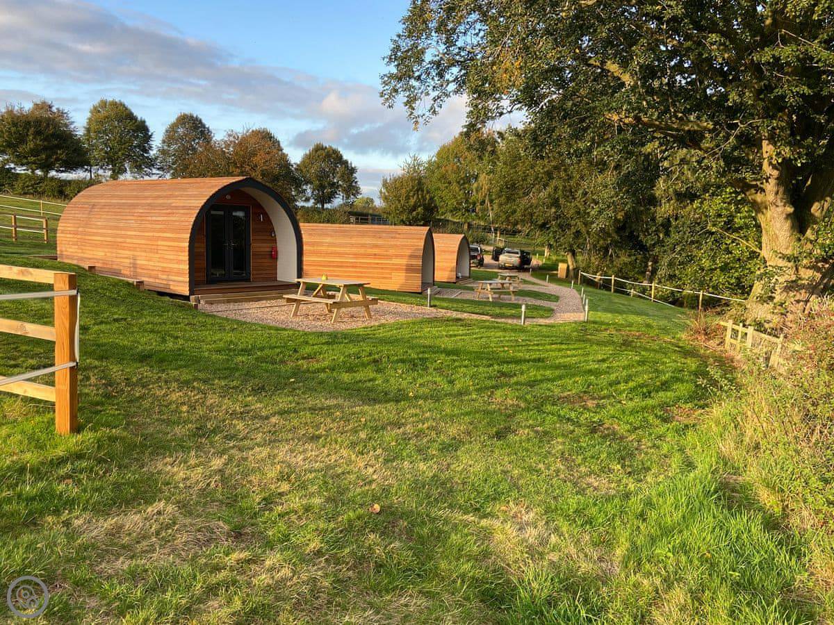 You're on a working farm. You'll see the animals and the general comings and goings. There are woods to walk in right from your door, and paths across the farm land. There's parking next to the pod.