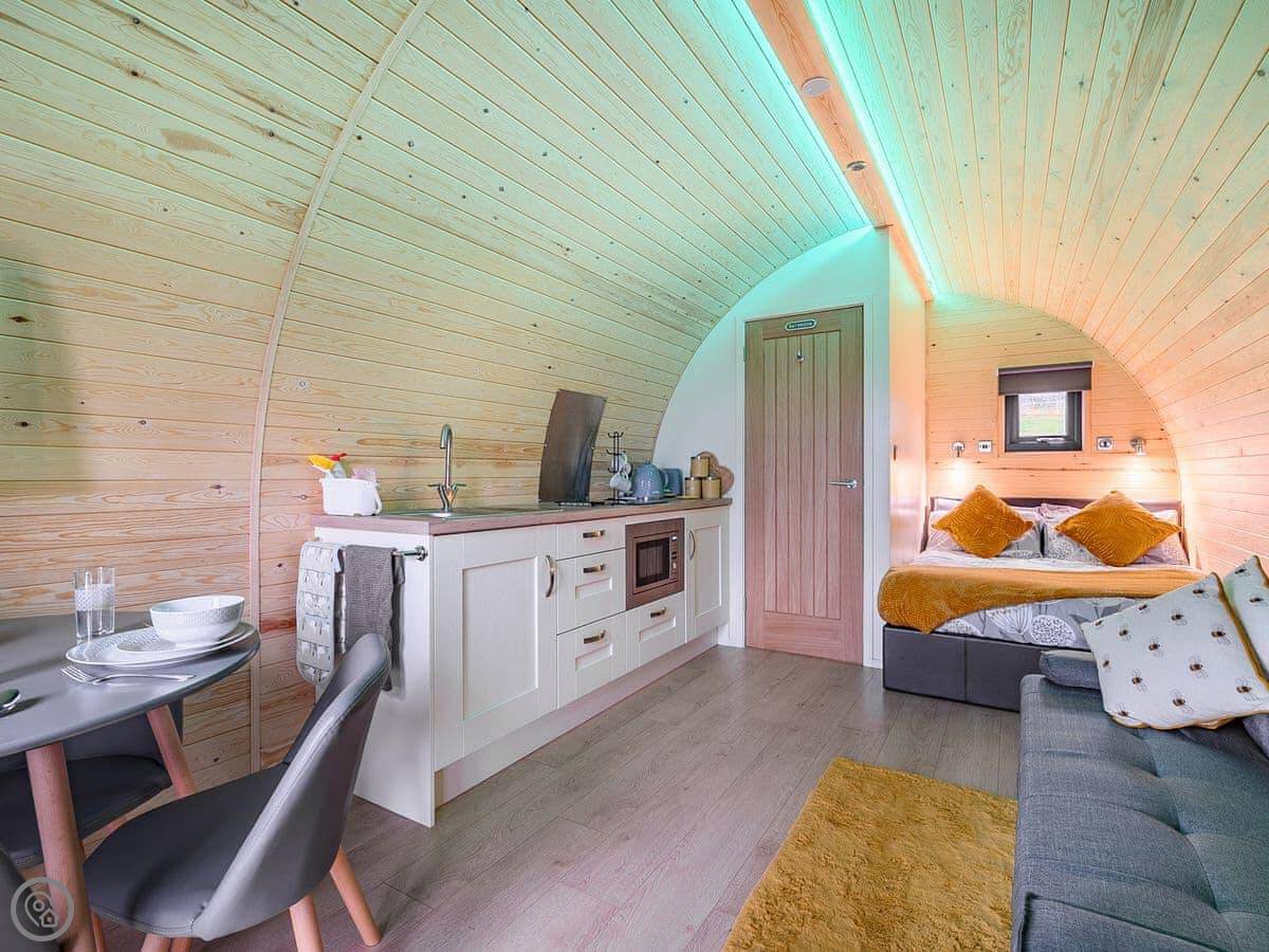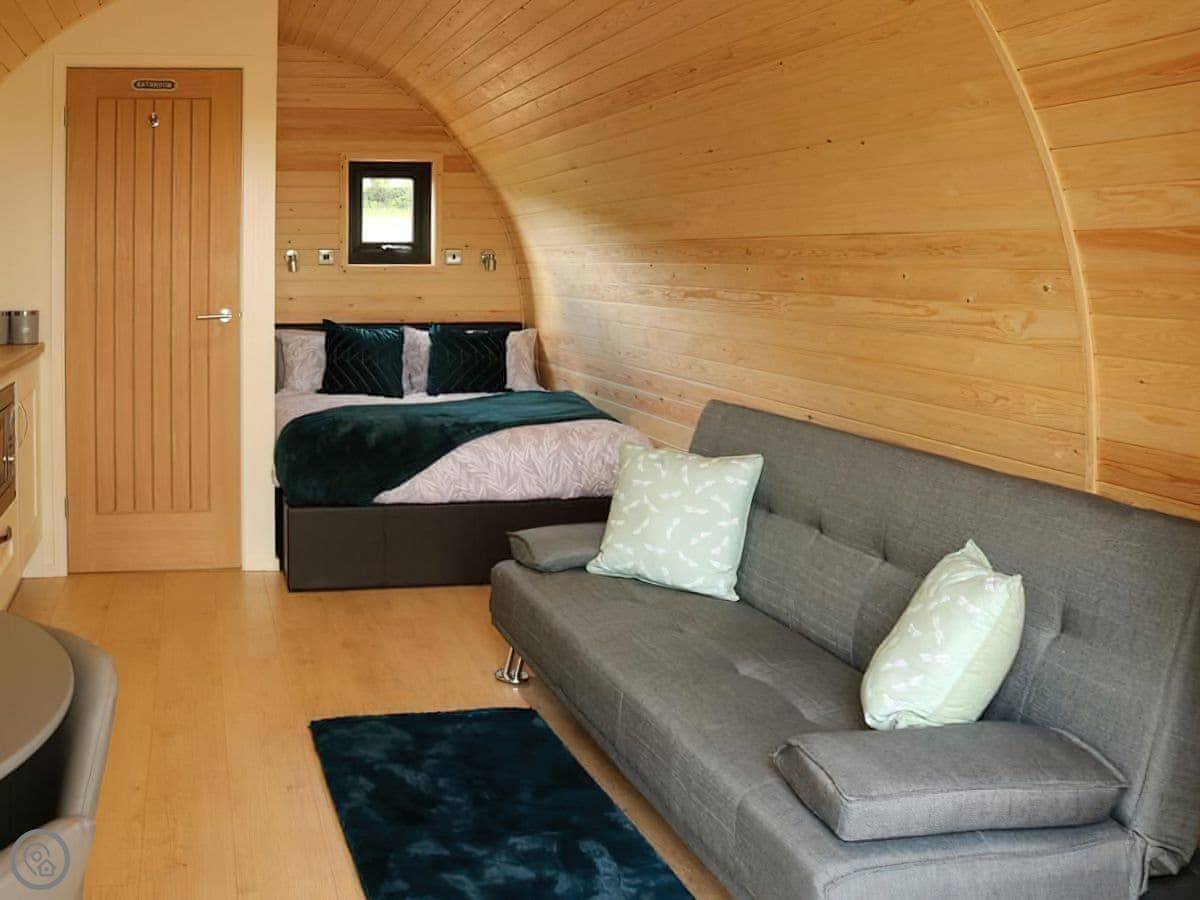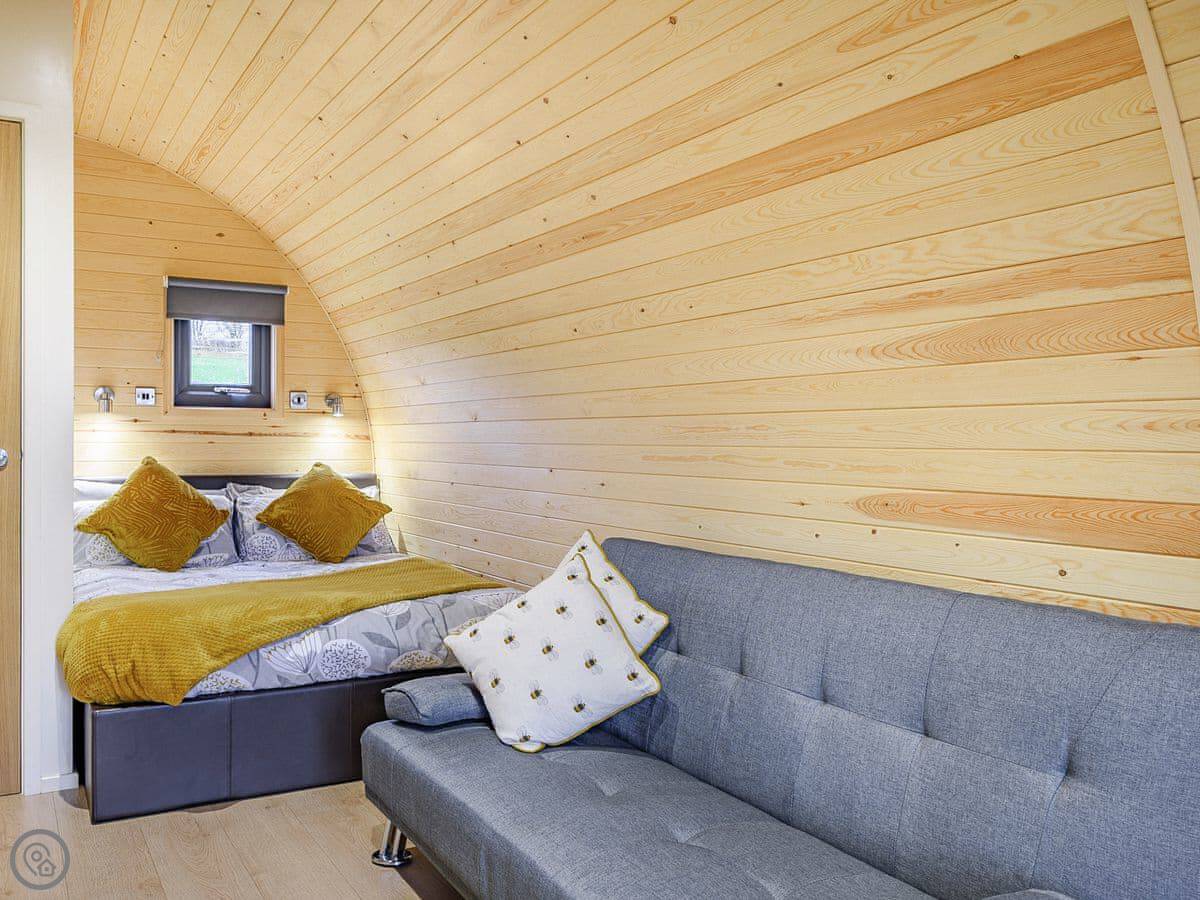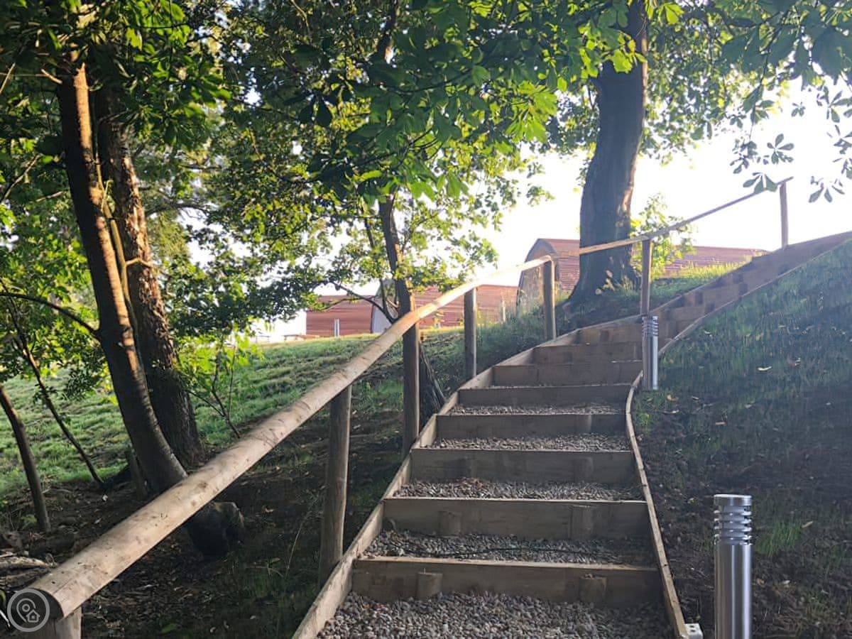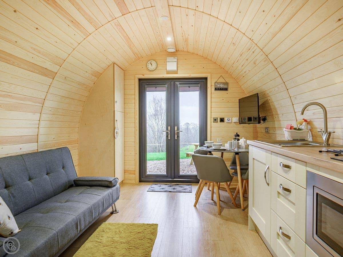 You're on a working farm. You'll see the animals and the general comings and goings. There are woods to walk in right from your door, and paths across the farm land. There's parking next to the pod.
