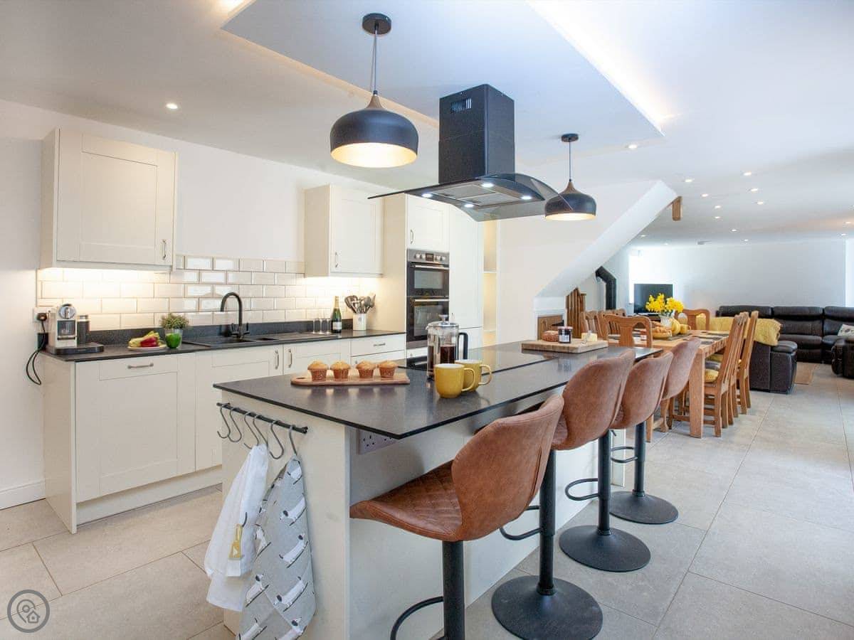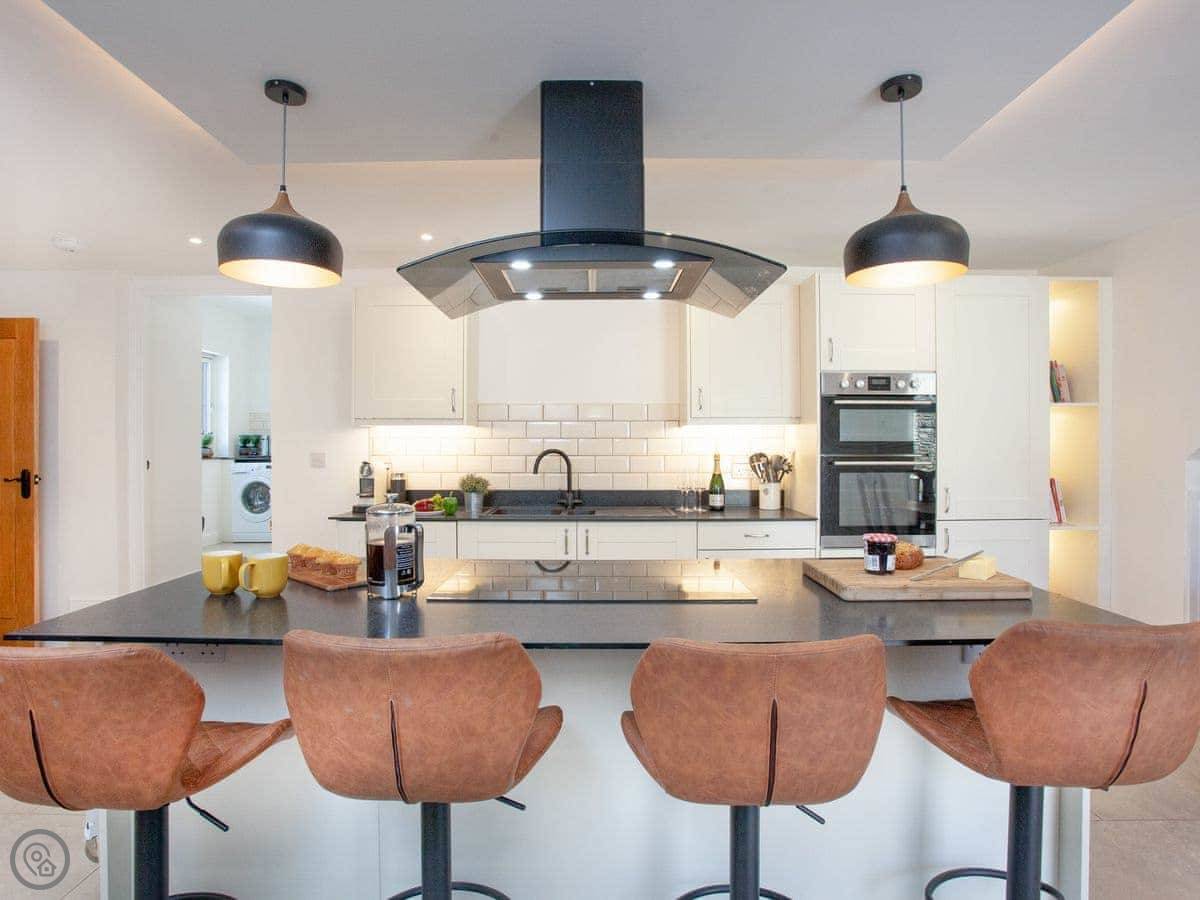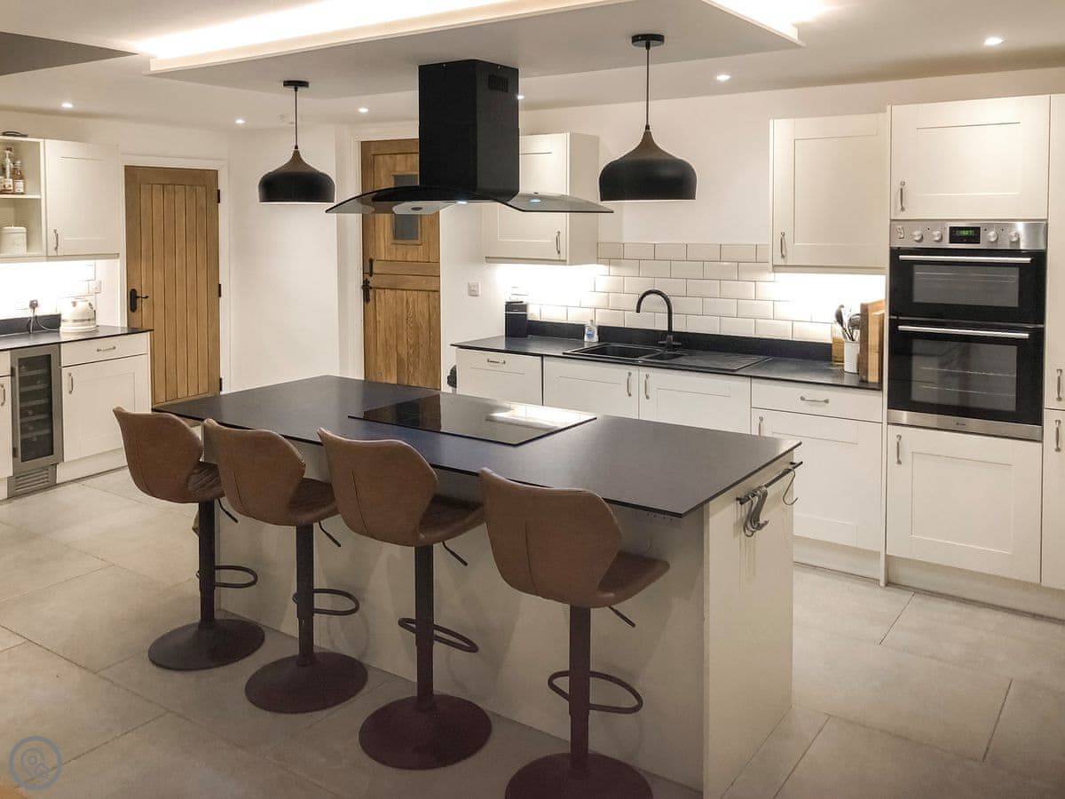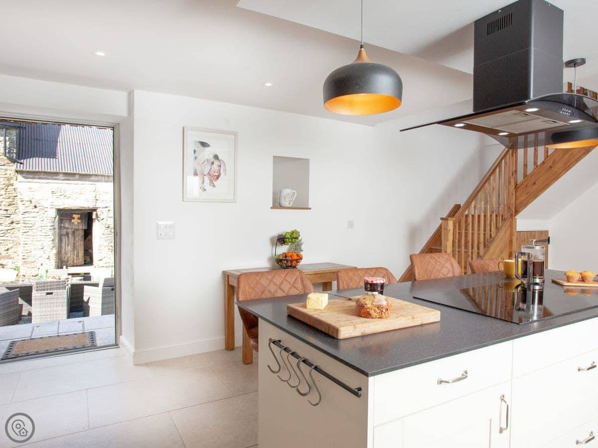 There's a woodburning stove for cooler nights. The kitchen is big, with an island and an induction hob. It's a good space for people to gather while someone's cooking.