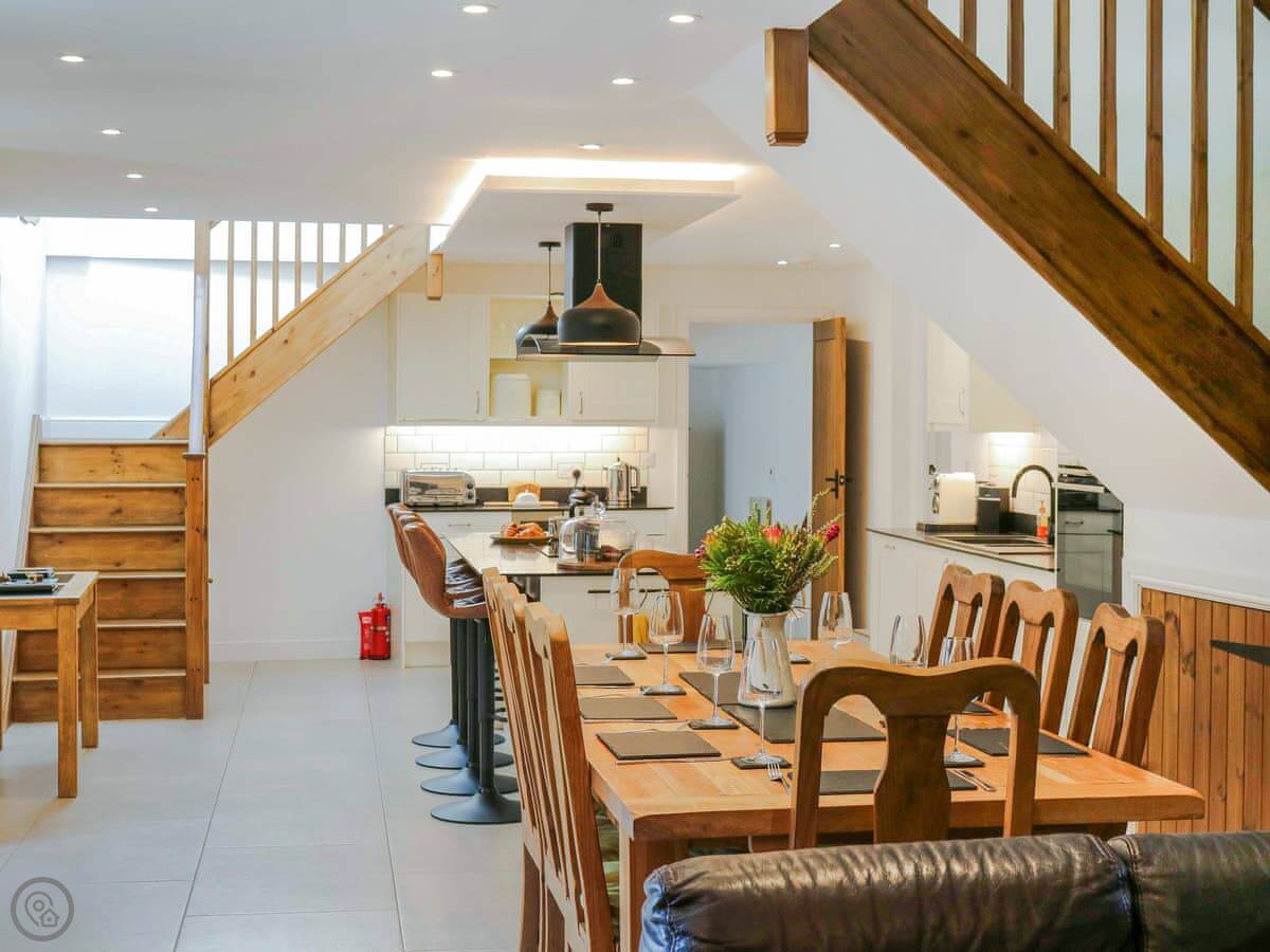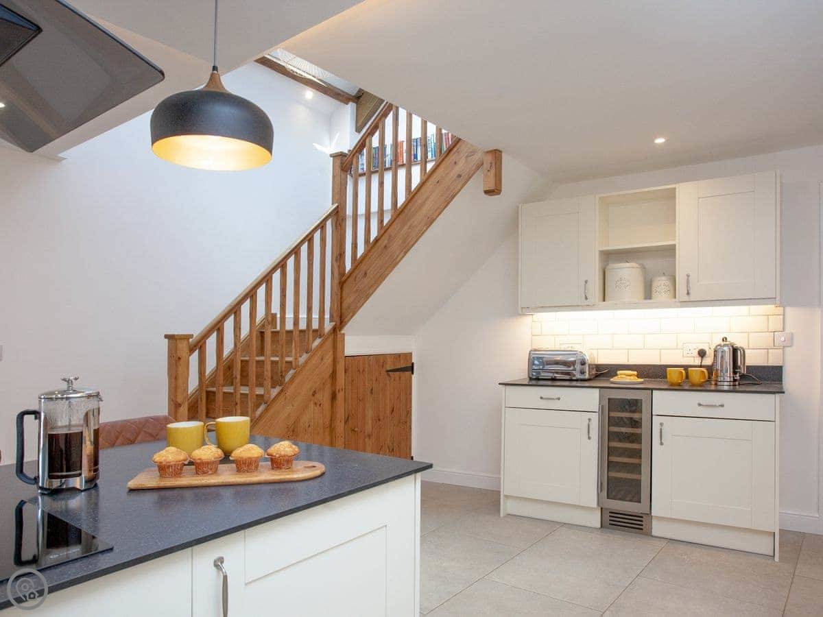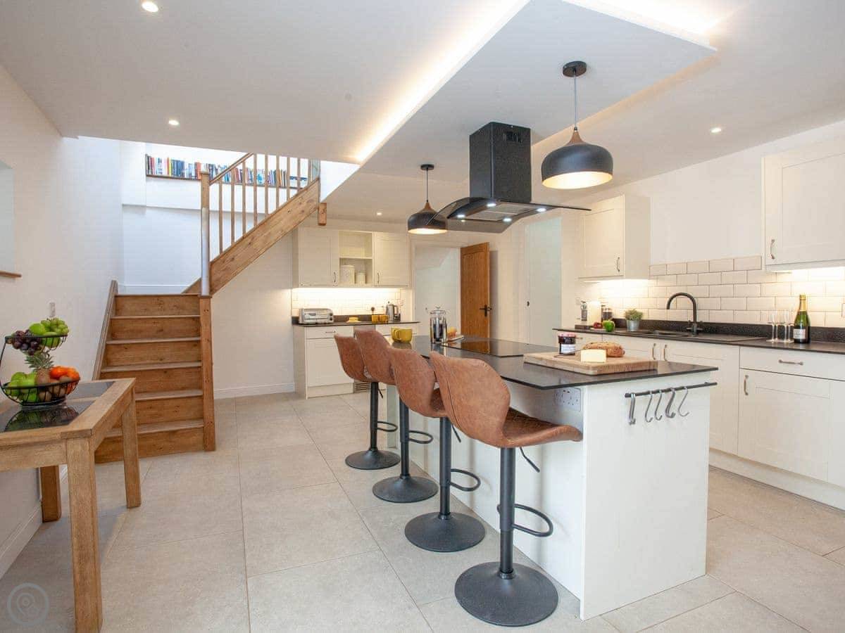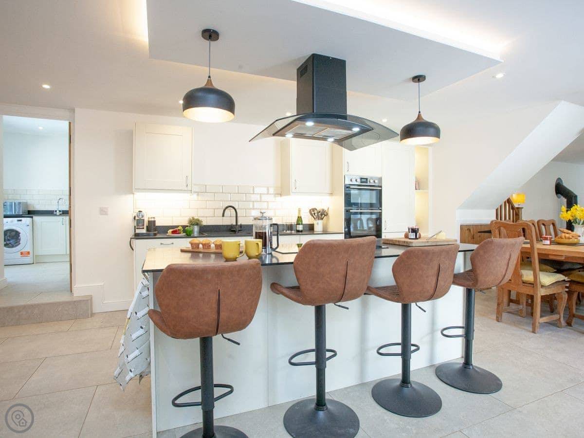 There's a woodburning stove for cooler nights. The kitchen is big, with an island and an induction hob. It's a good space for people to gather while someone's cooking.