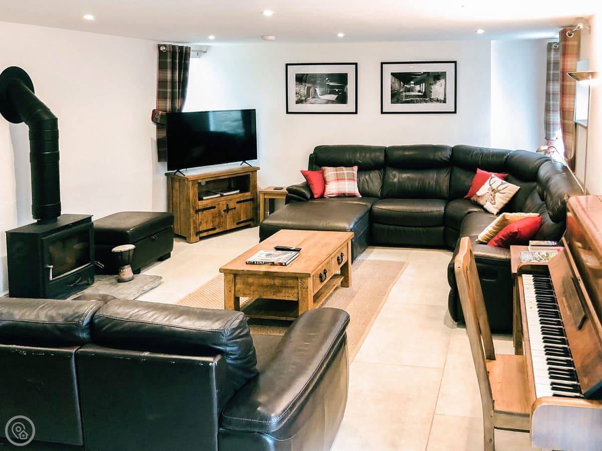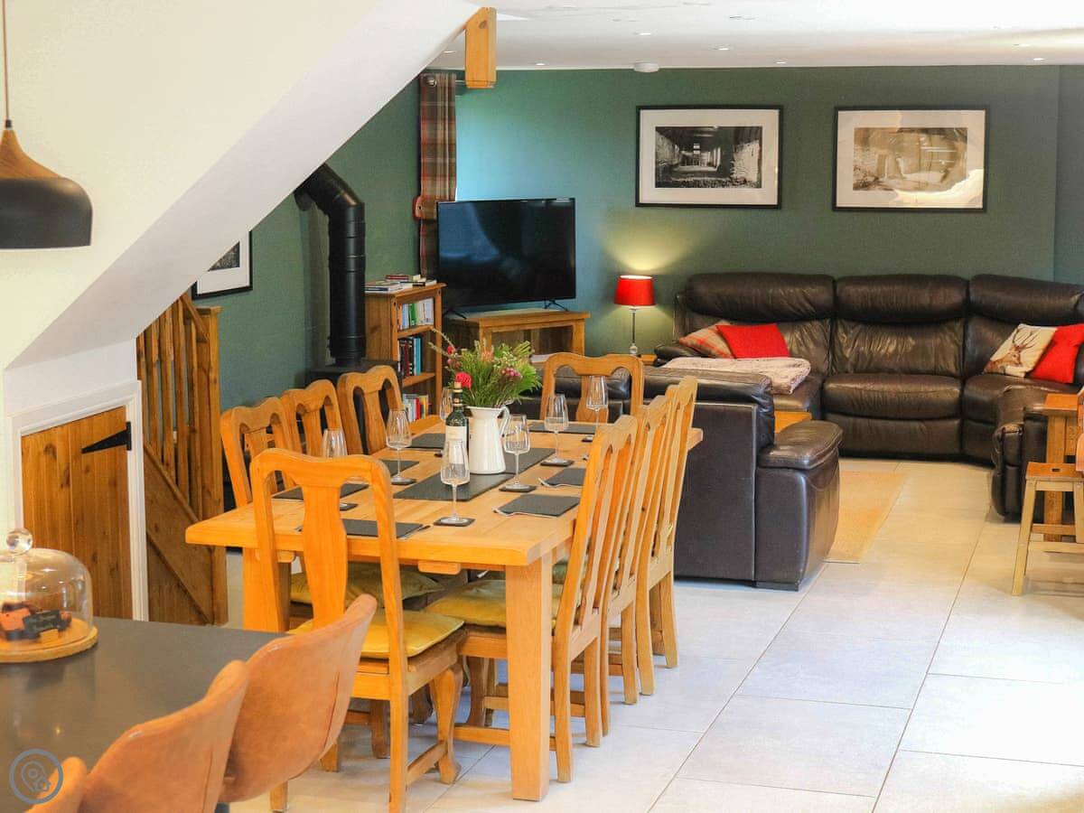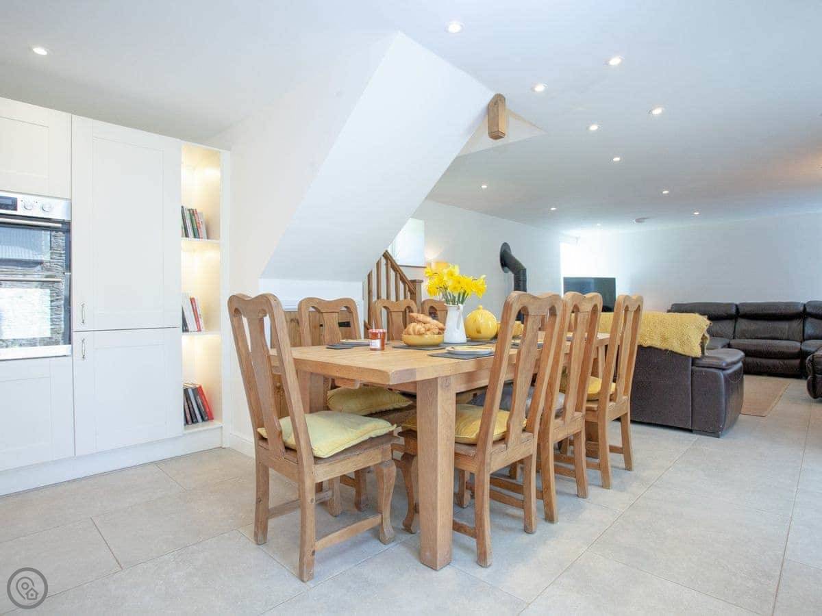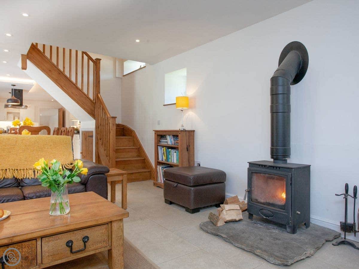 There's a woodburning stove for cooler nights. The kitchen is big, with an island and an induction hob. It's a good space for people to gather while someone's cooking.