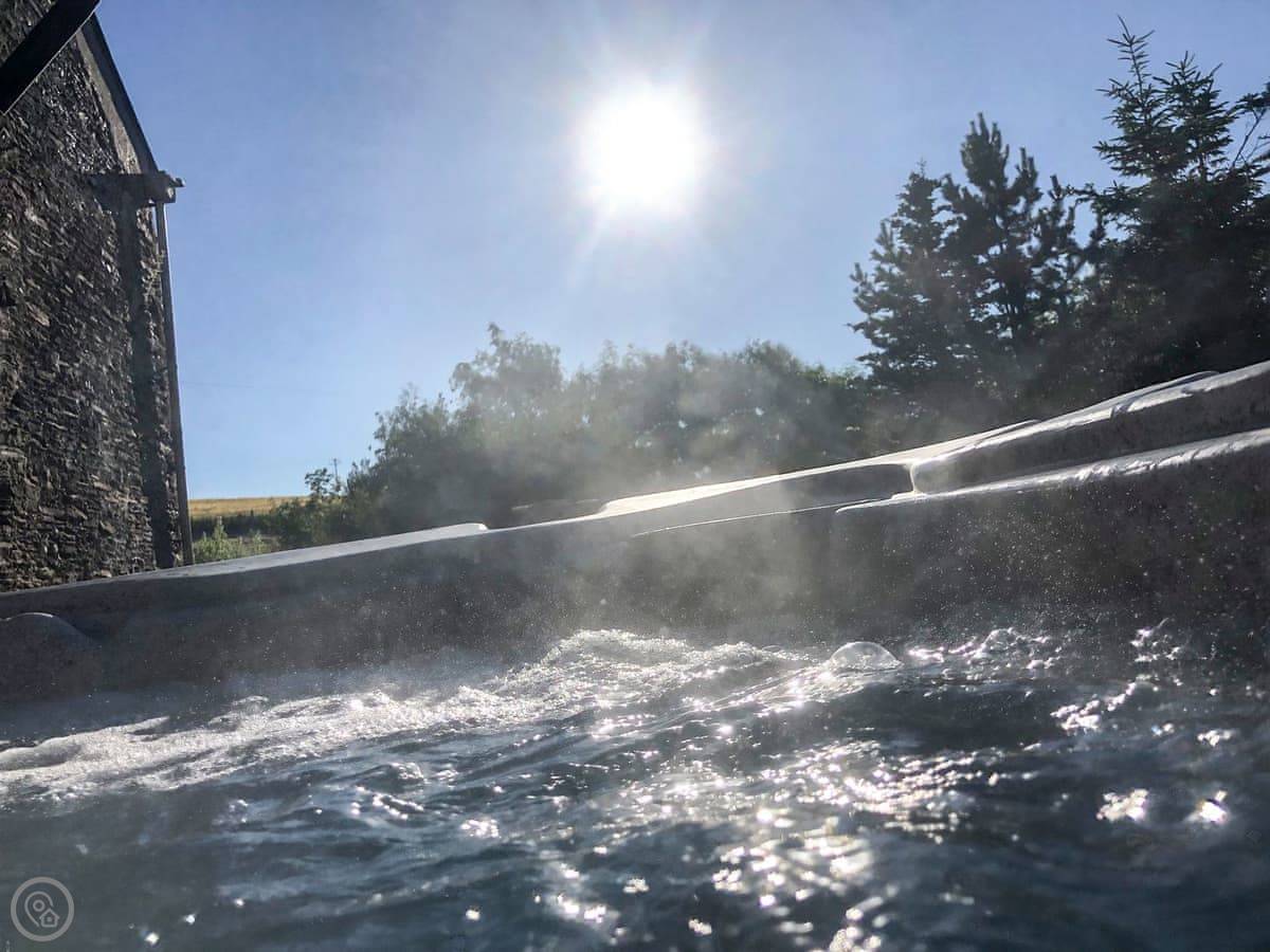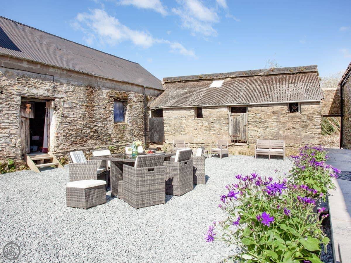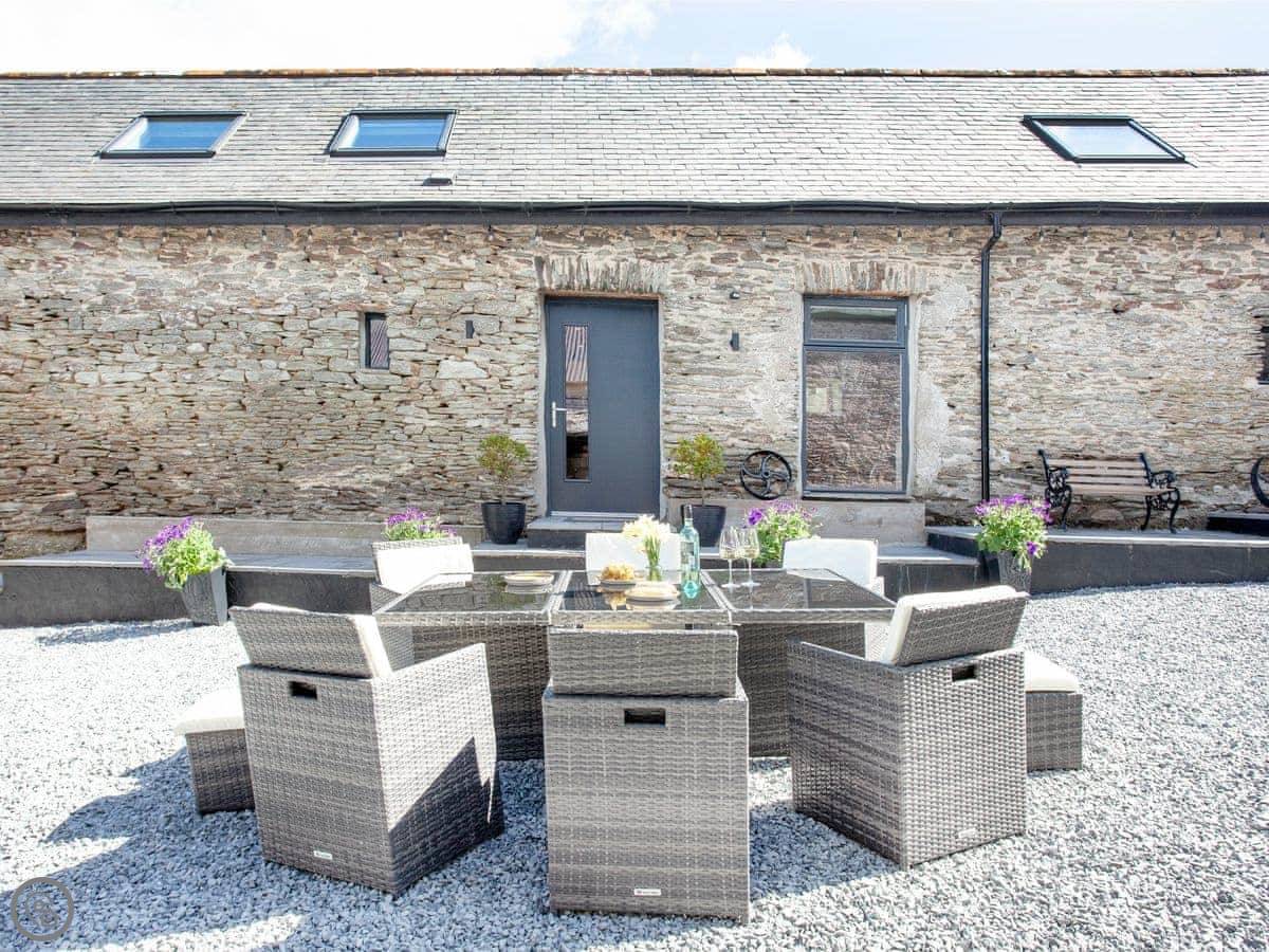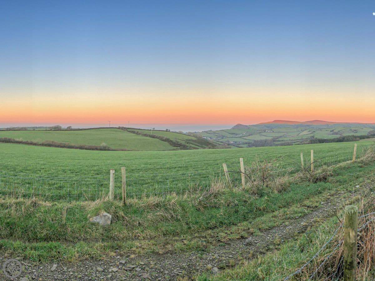 Outside, there's a raised garden with a table. It looks out over the fields, right down to the coast. On a clear day, you can see Wales across the water.
